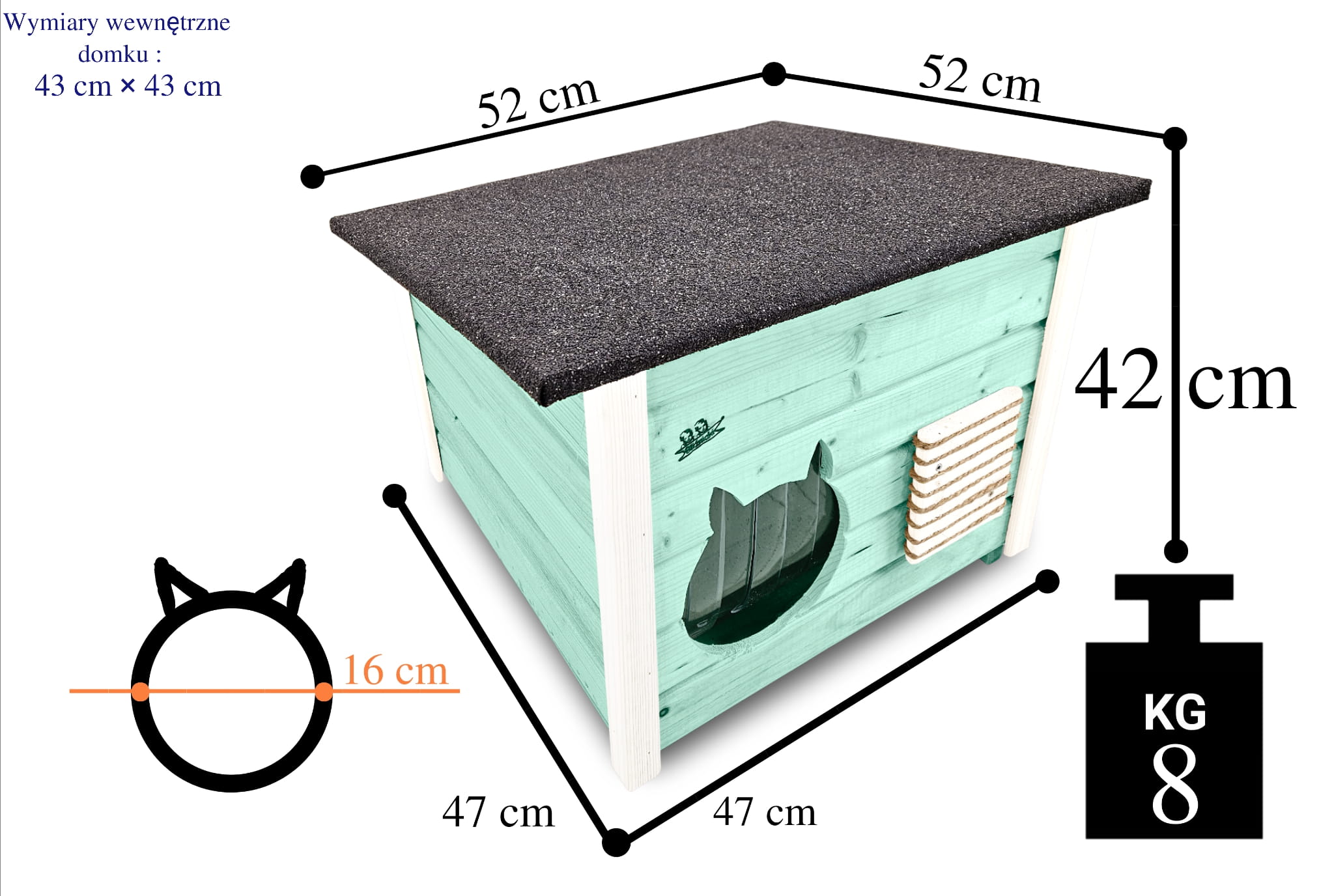 - wejście do domku ma odpowiedni duży otwór 16 cm