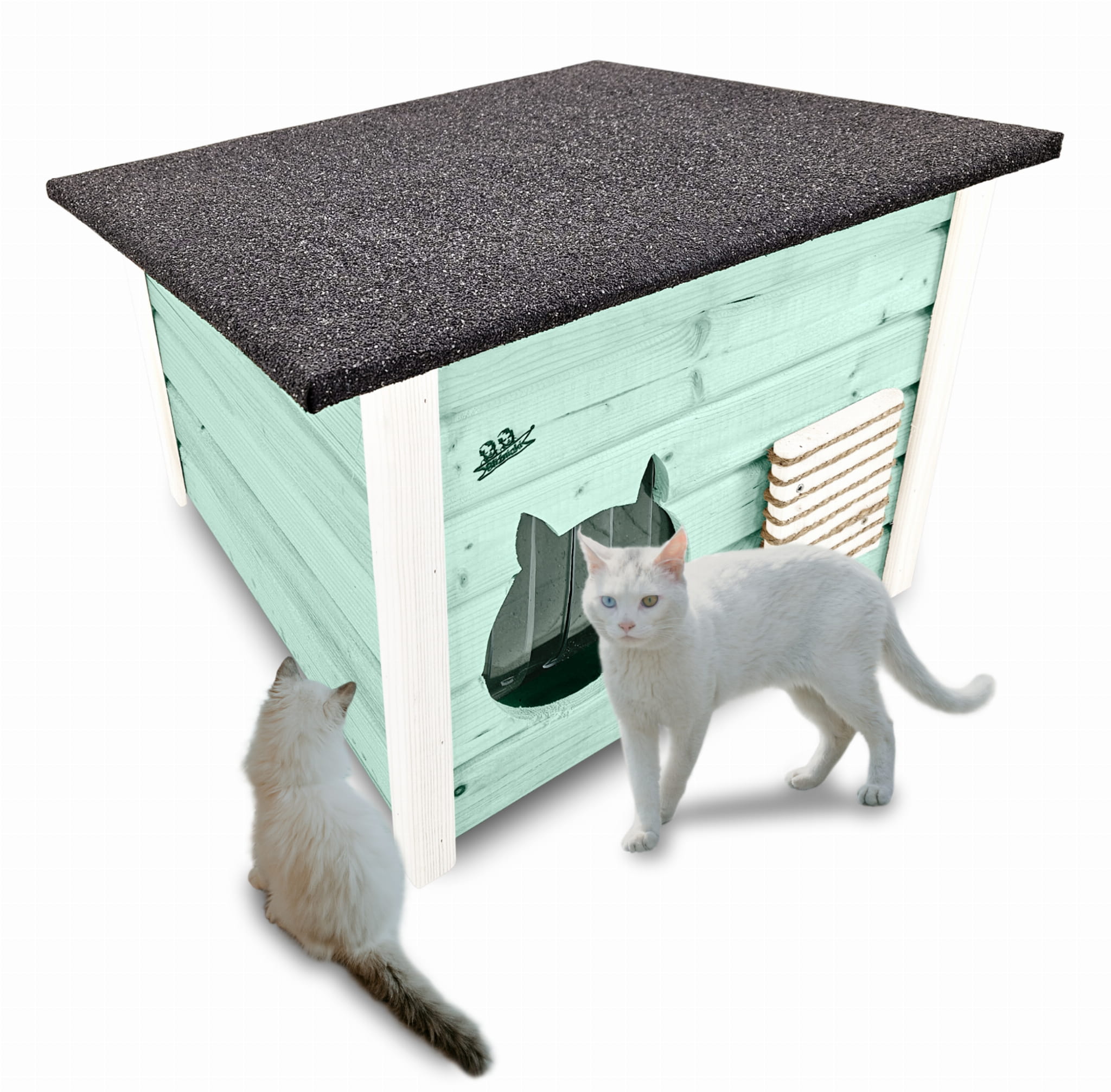 Domek może być ustawiony na ogrodzie lub tarasie ale też można go postawić w pomieszczeniach. Jest bardzo przestronny i wygodny i nasze kociaki mogą czuć się w nim swobodnie i komfortowo. Domek wykonany jest solidnie z impregnowanego drewna, dach drewniany z asfaltowy oraz specjalna zasłona przeciwwiatrowa.