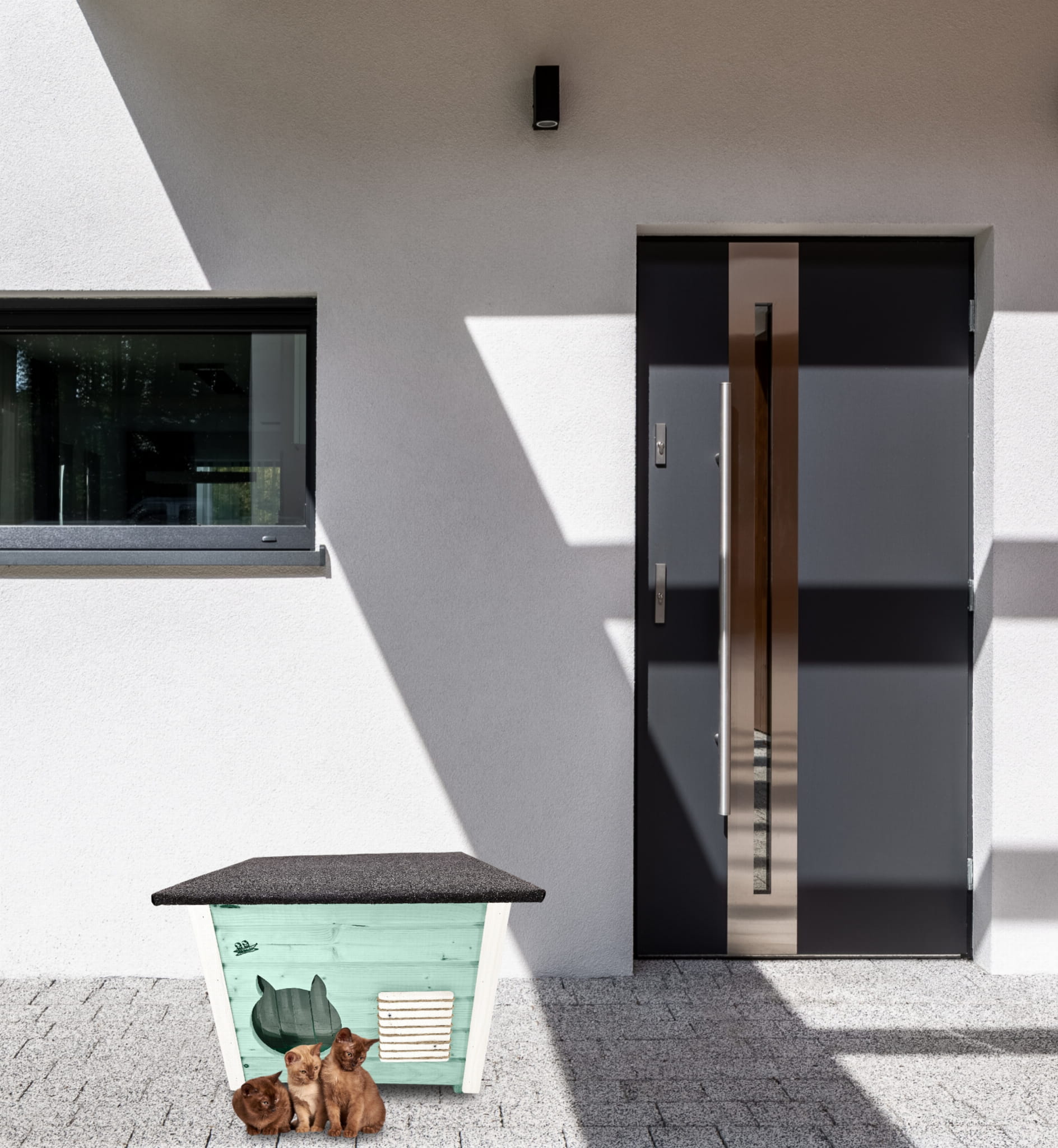 DOMEK dla KOTA ma ozdobne wejście i kolor, który dodaje walorów dekoracyjnych.
