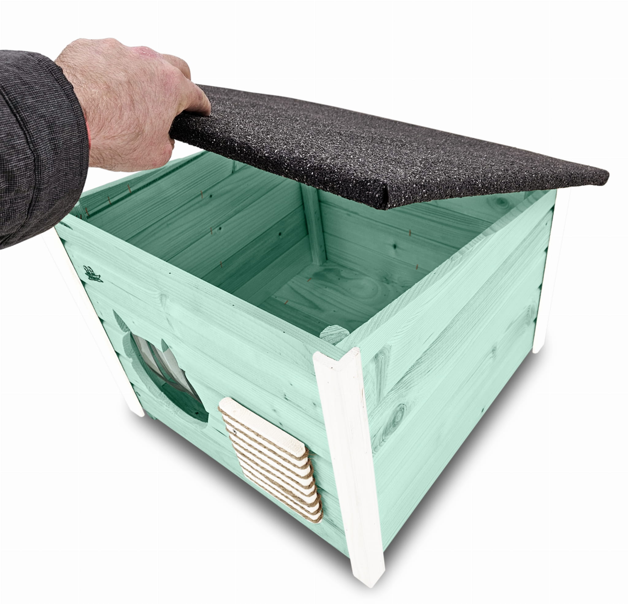 - Dach jest łatwo zdejmowany, co ułatwia uzupełnienie budki posłaniem lub jej czyszczeniem