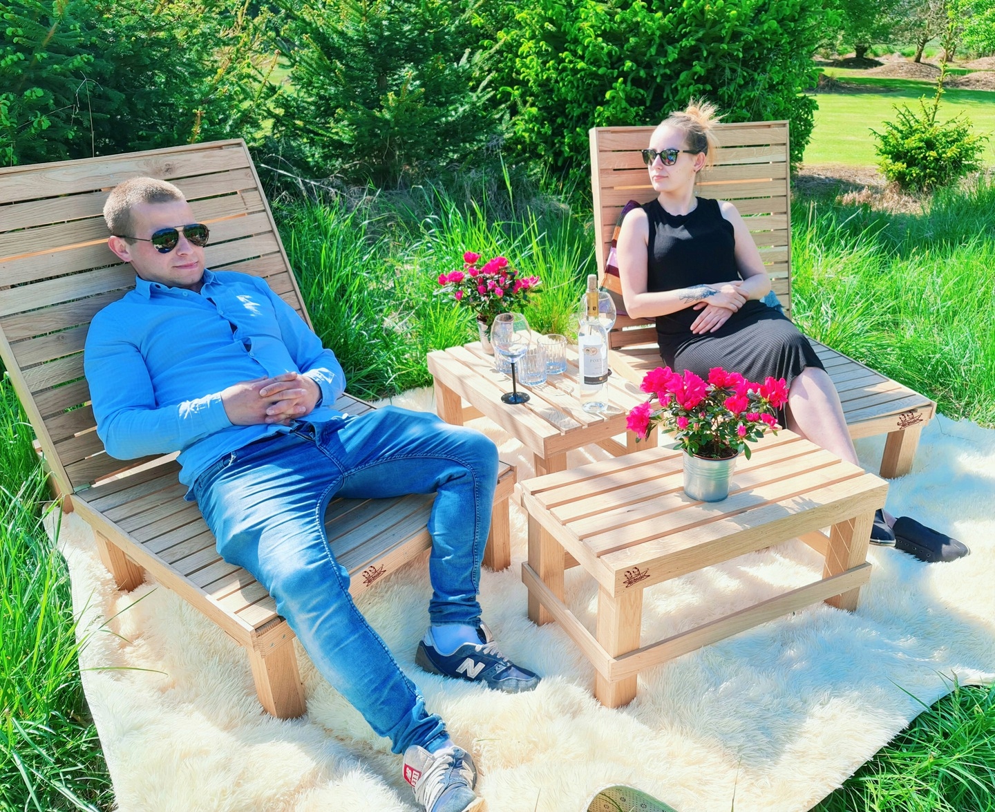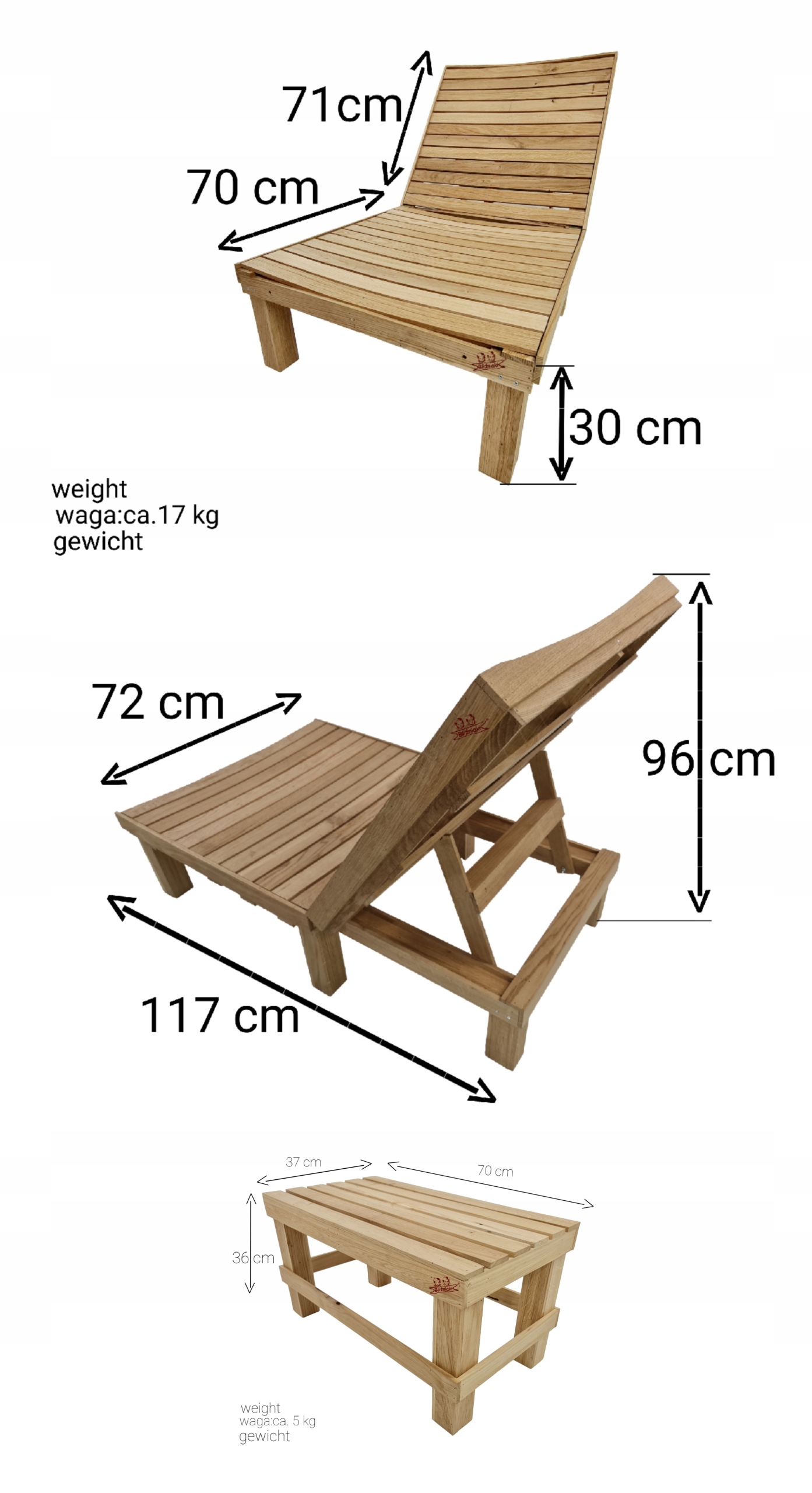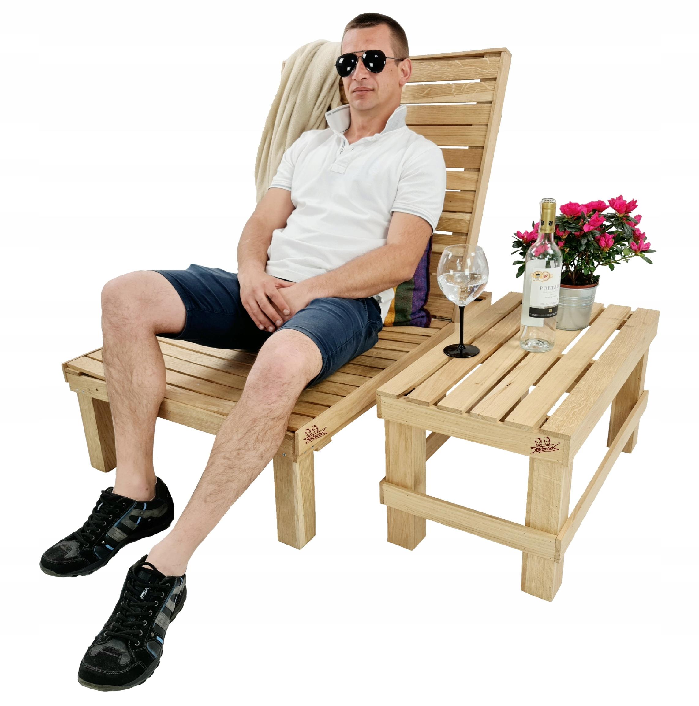 Dębowy Stolik Kawowy Leżak Fotel Drewniany ZESTAW Meble ogrodowe drewniane Stolik kawowy przenośny Wygodny fotel do ogrodu na taras (FOT2 DB W)
