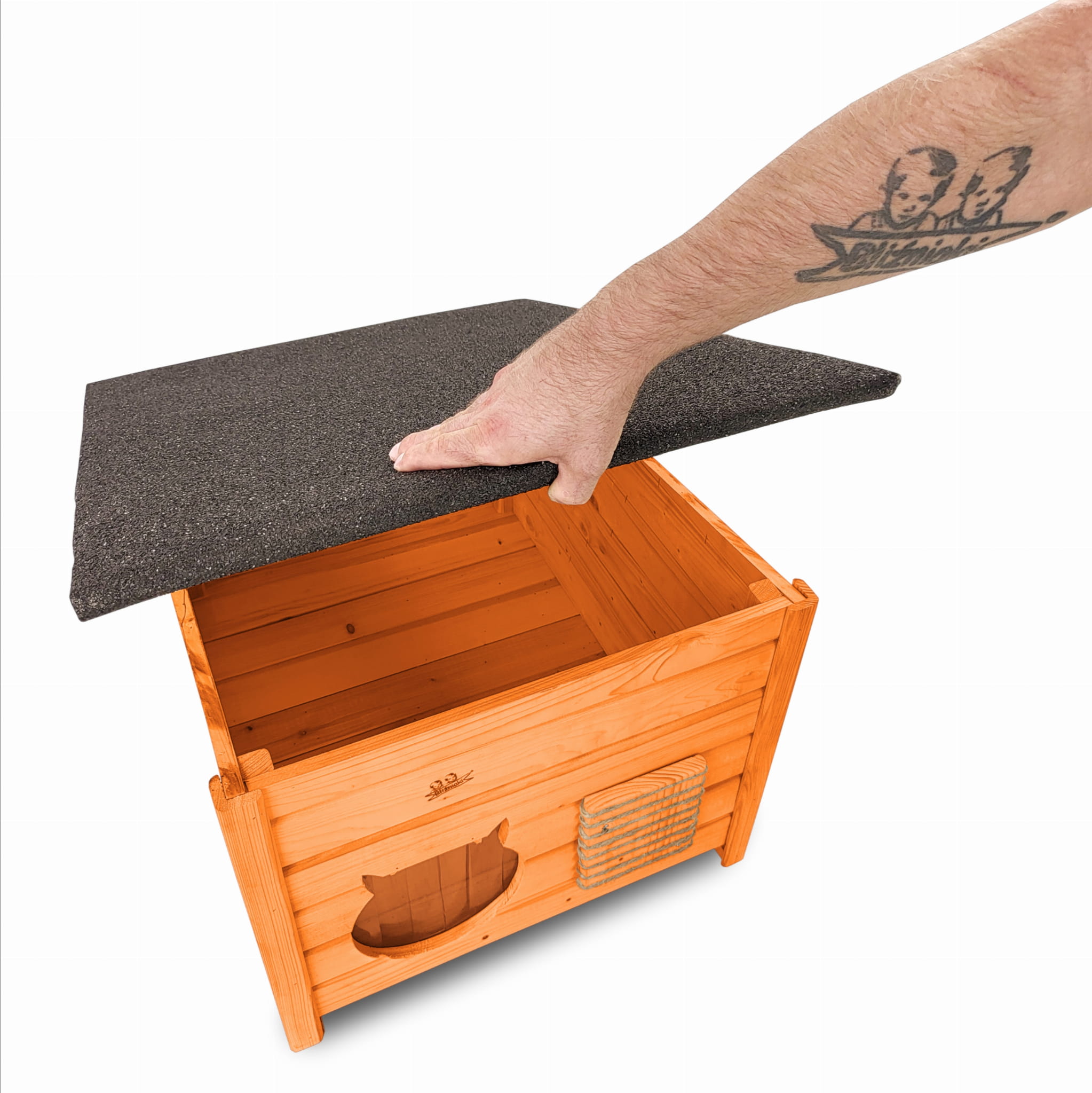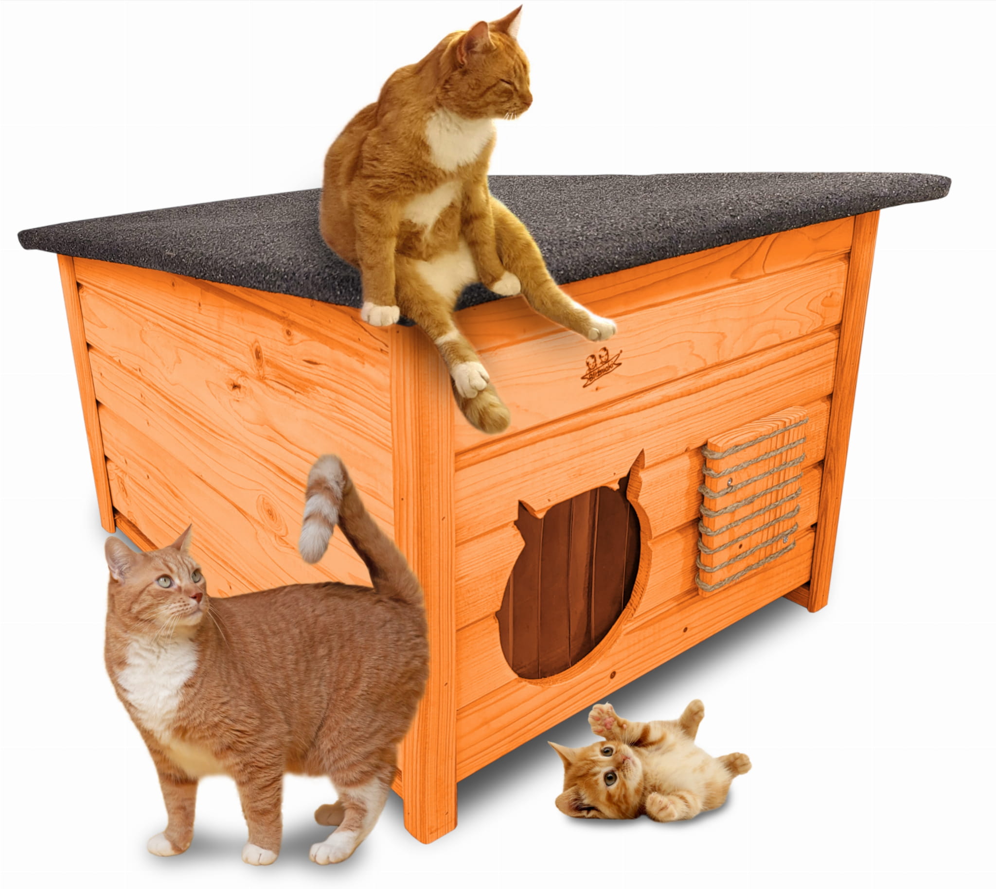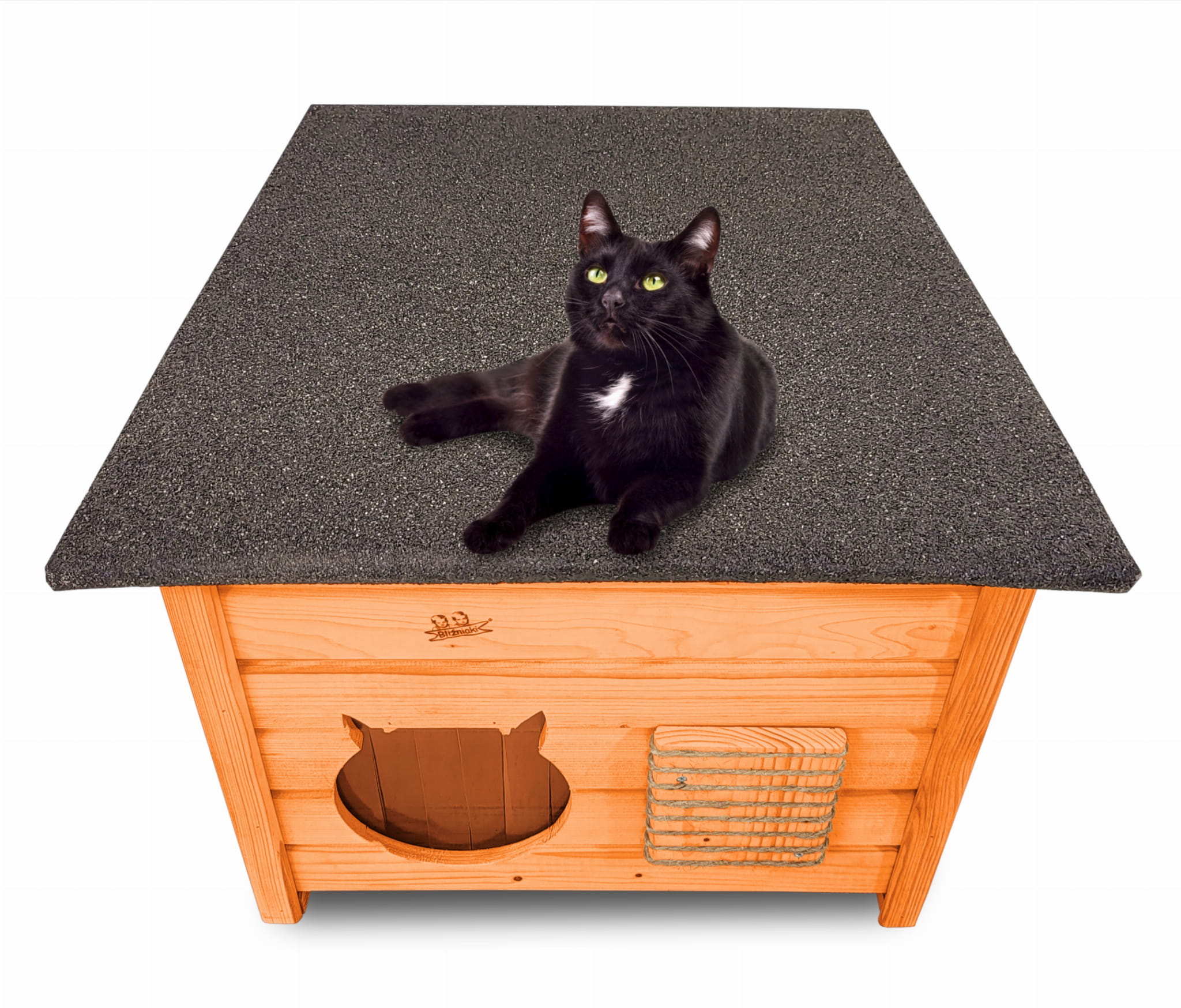 - Budka wyposażona została w drewnianą podłogę- zapewnia to jeszcze większą wygodę kotom i izolację od podłoża