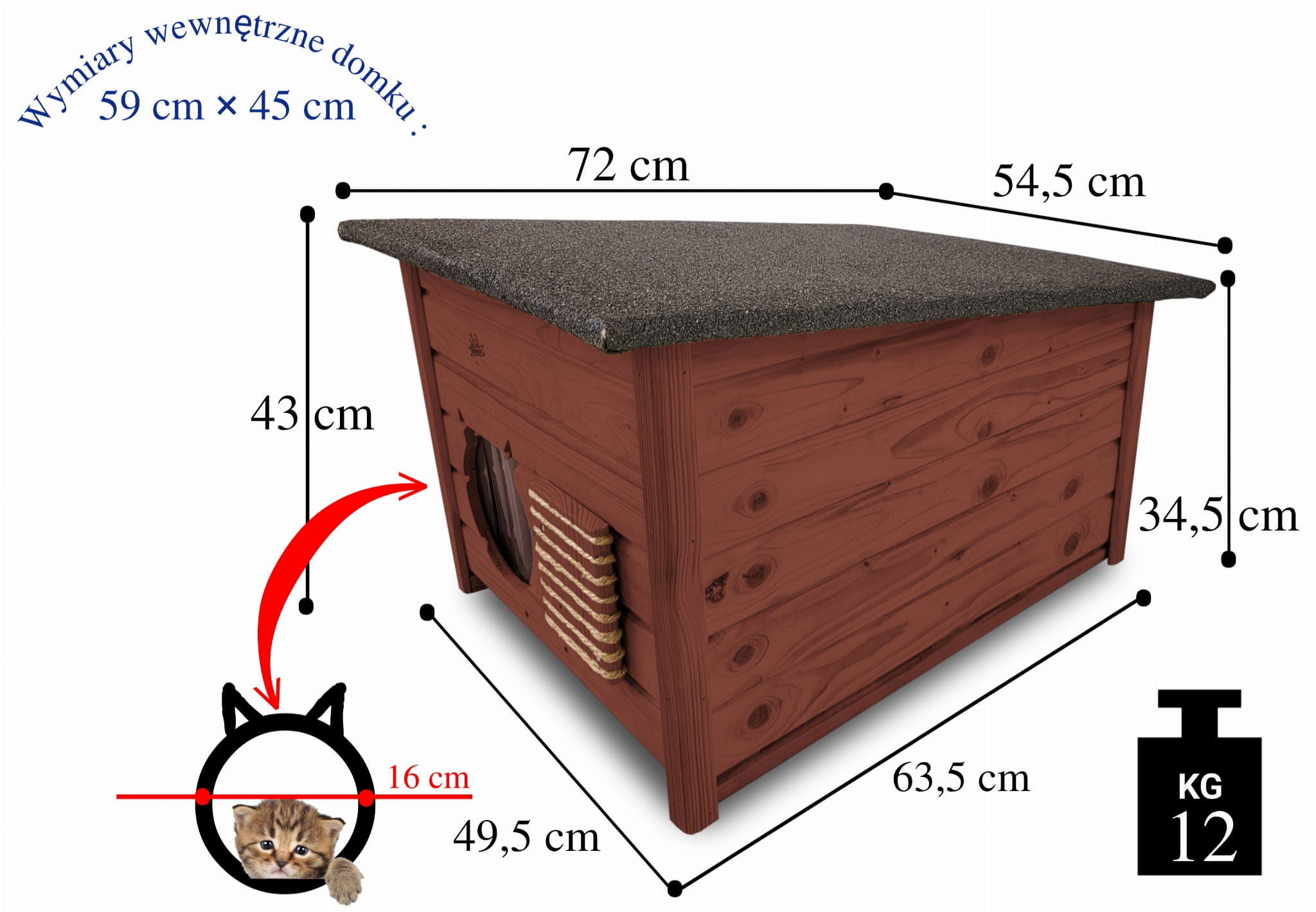 Poddane impregnacji drewno sprawia, że oferowana przez nas DOMEK DLA KOTA jest odporna na szkodliwe działanie wody oraz wilgoci, promieni UV, a także grzybów i pleśni a przy tym ma piękny ORZECHOWY kolor drewna.