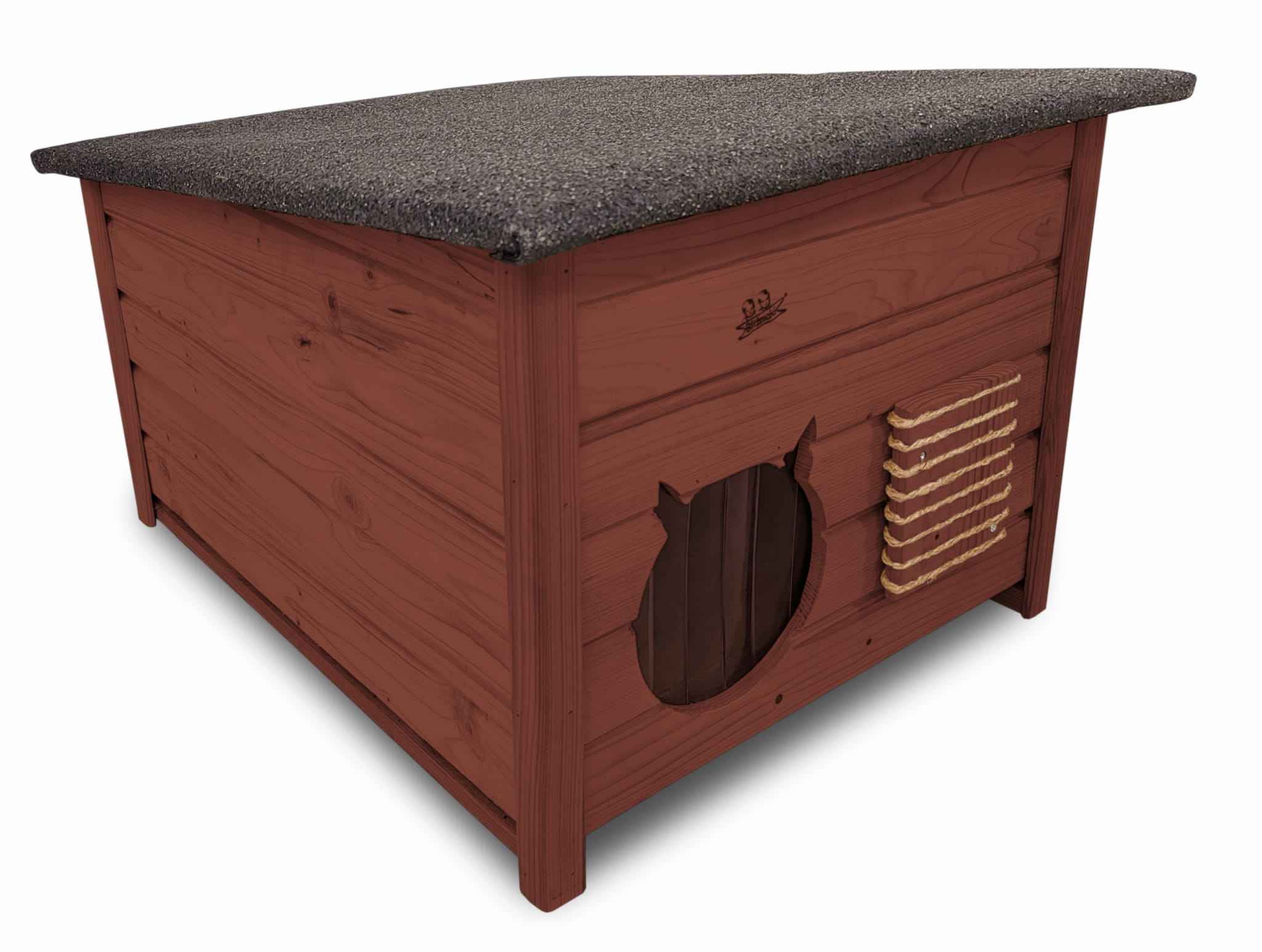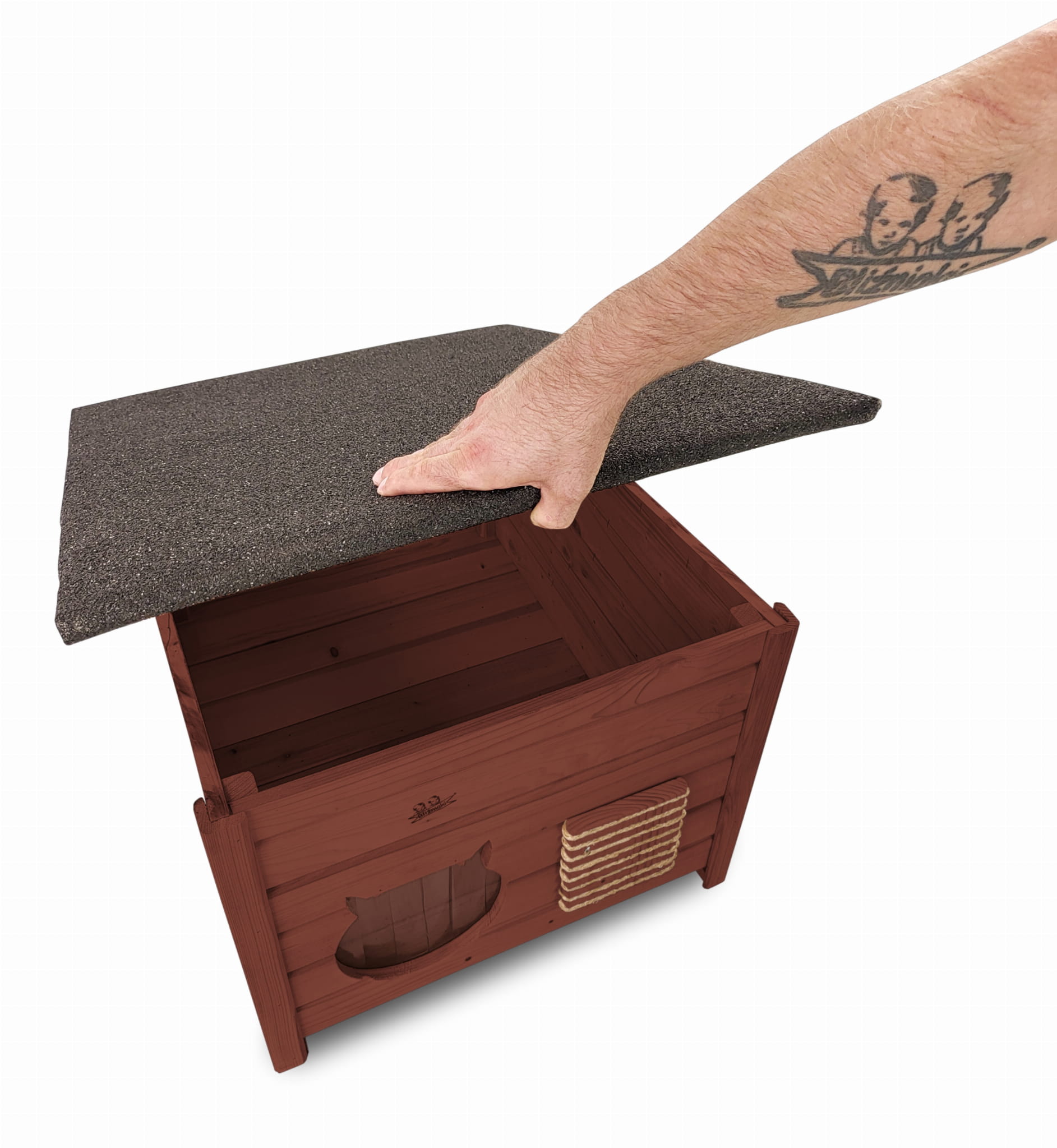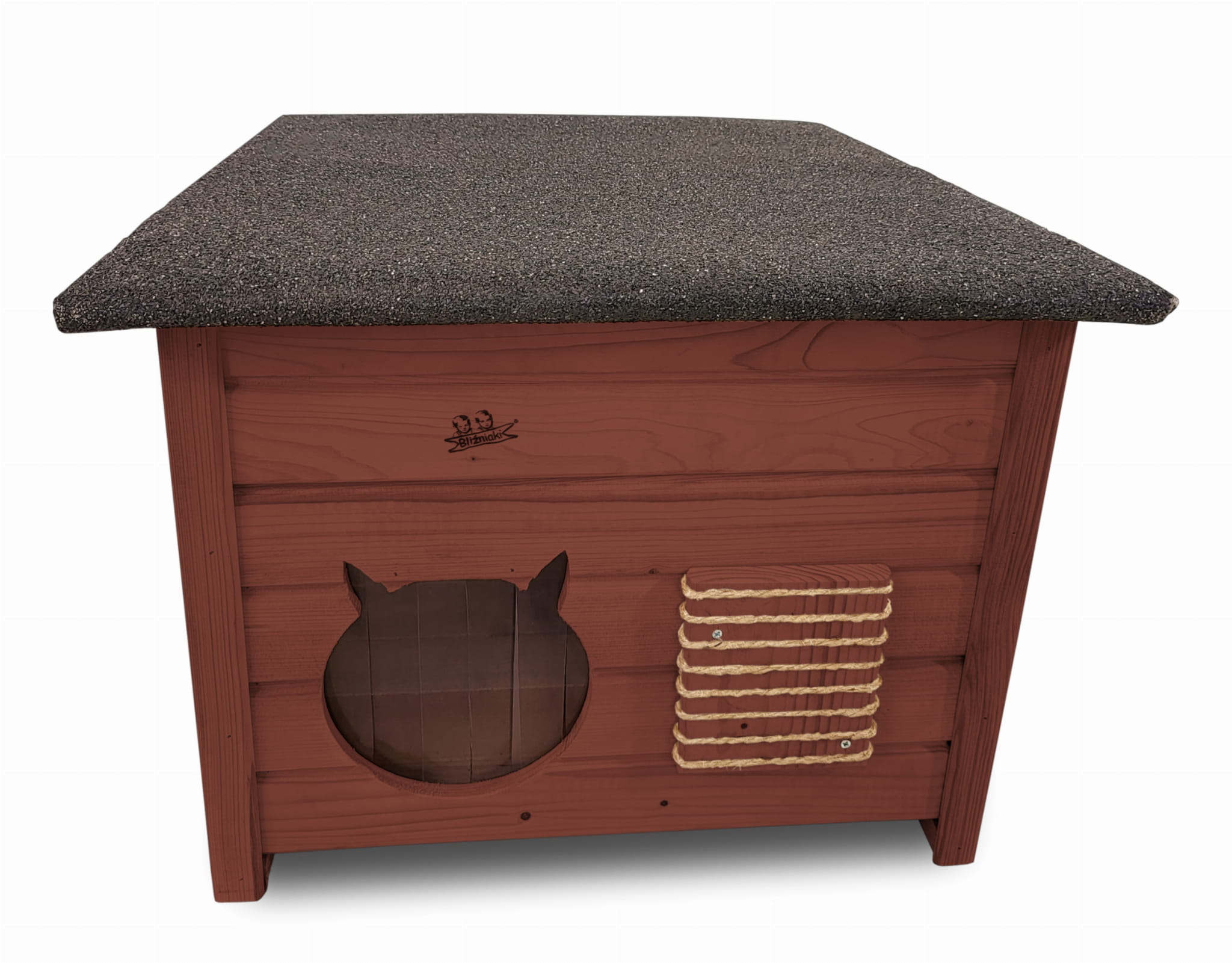 - Budka wyposażona została w drewnianą podłogę- zapewnia to jeszcze większą wygodę kotom i izolację od podłoża