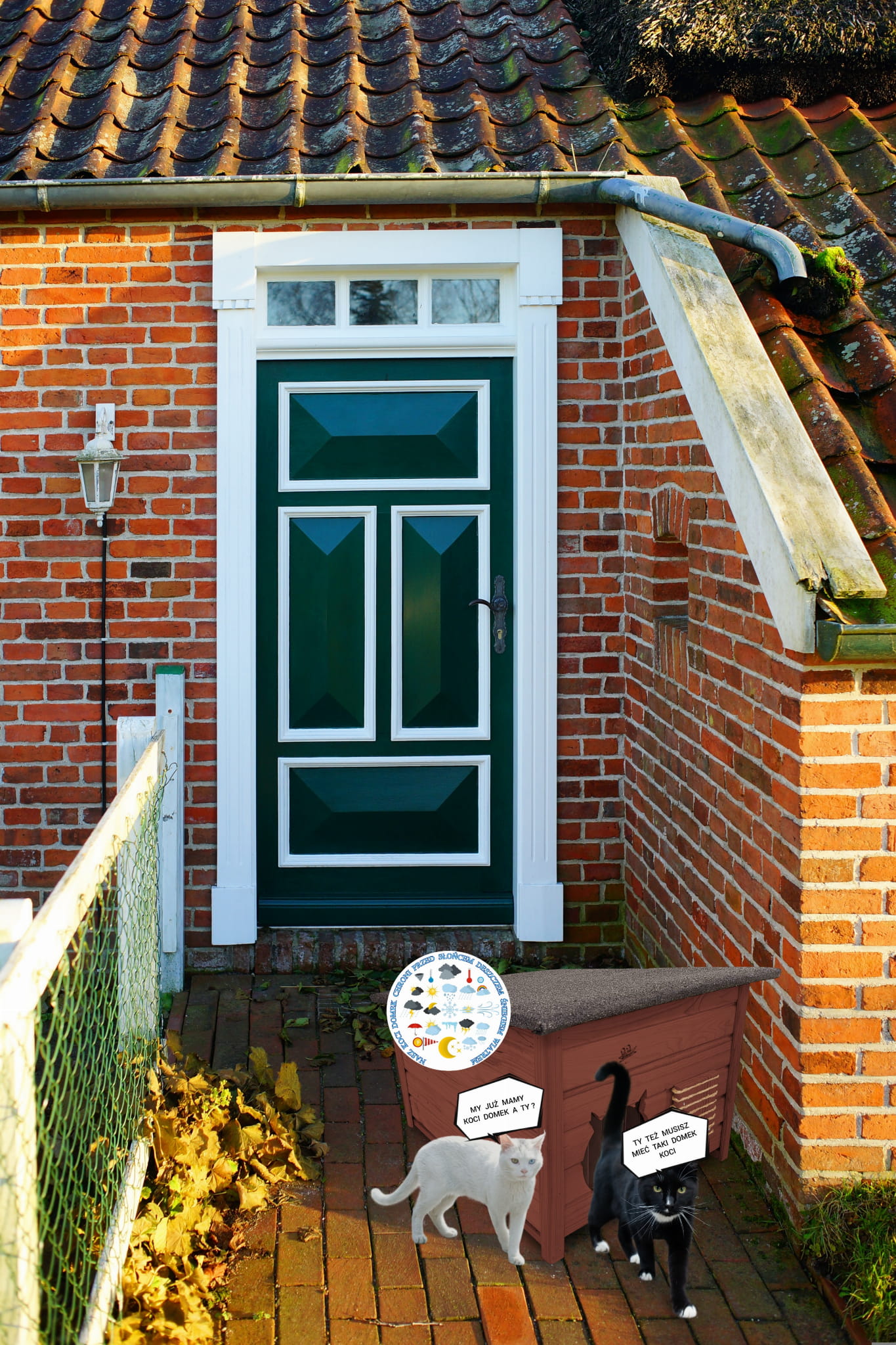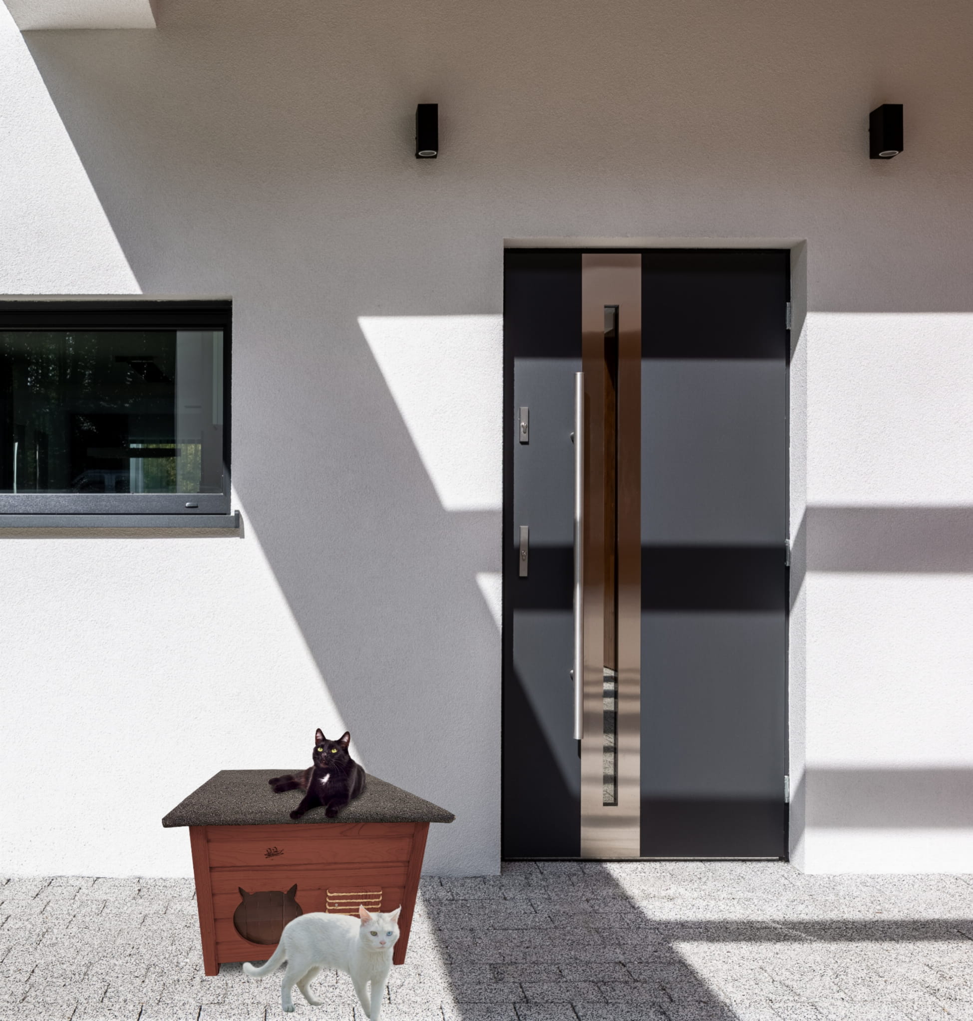 DOMEK dla KOTA ma ozdobne wejście i kolor, który dodaje walorów dekoracyjnych.