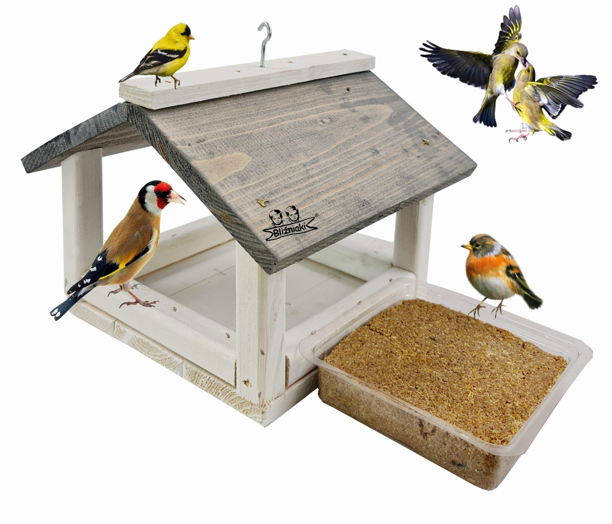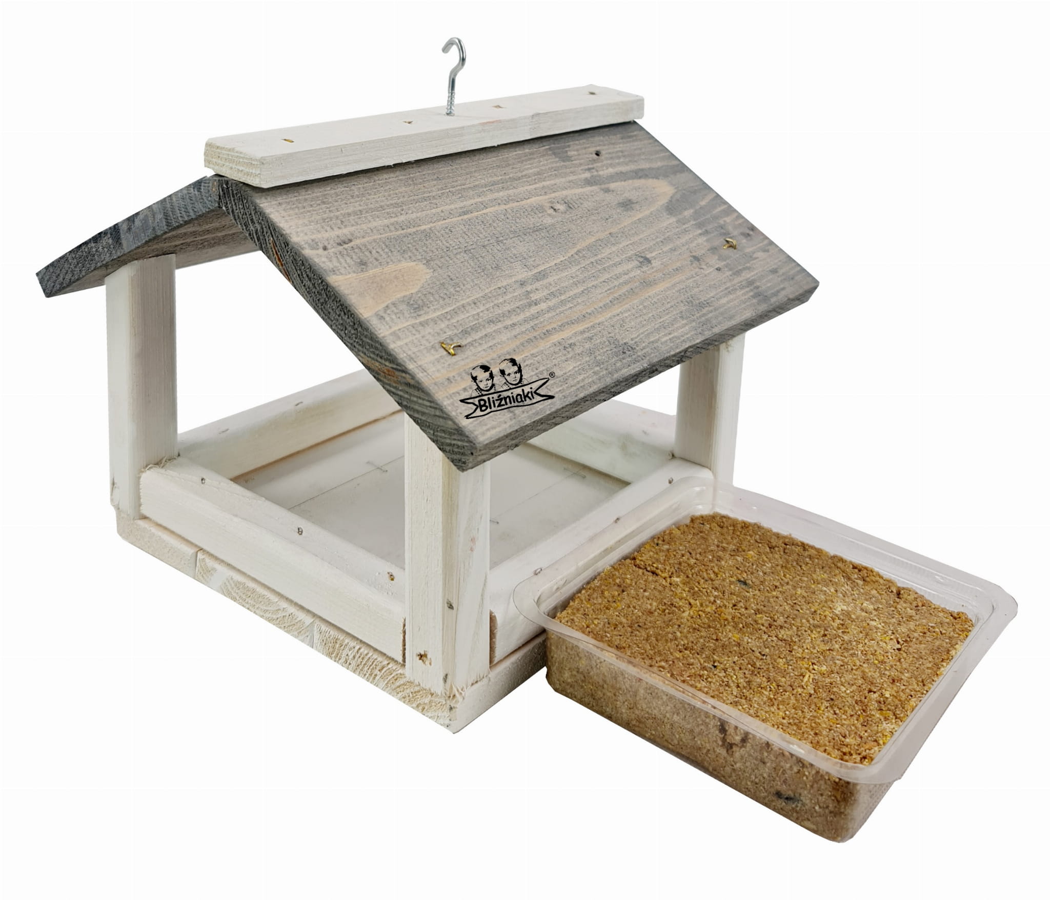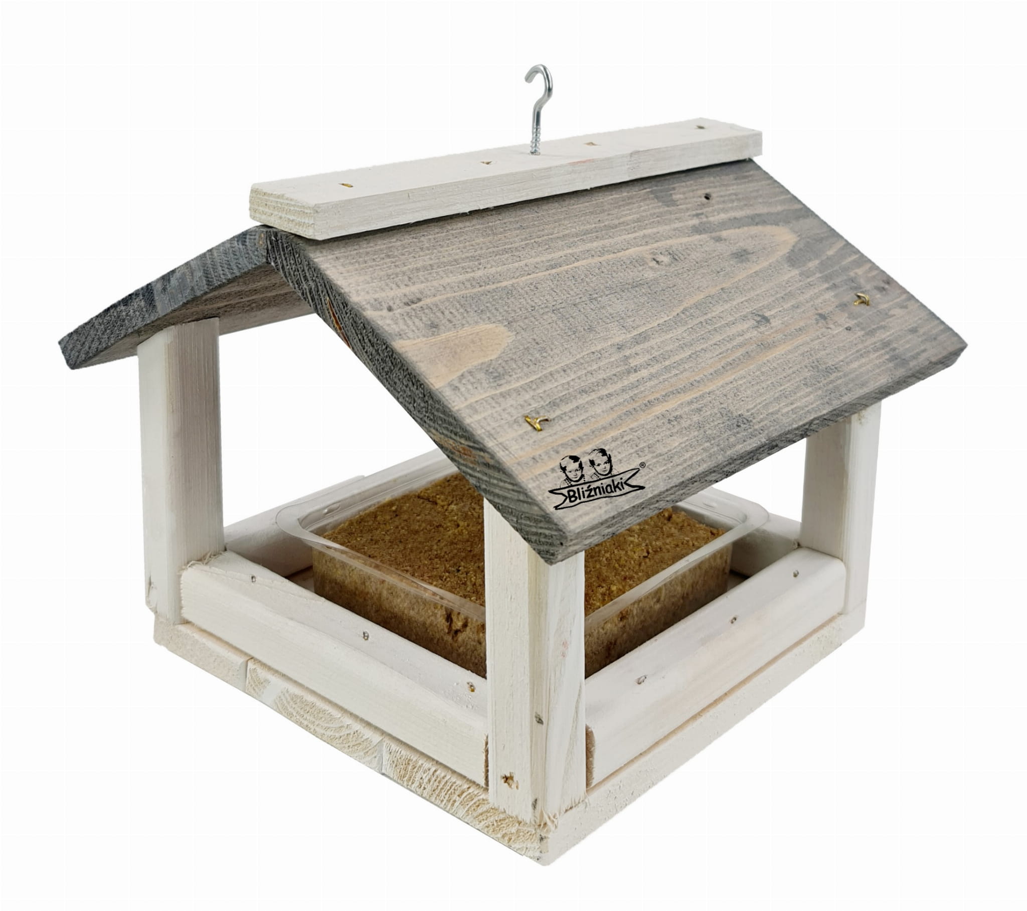 Karmnik Drewniany Dla Ptaków Z Karmą Smakołyk Orzechowy Do Zawieszenia Na Drzewie Szaro-biały Z Haczykiem Wiszący(K135 BI SN+PBLOK1)