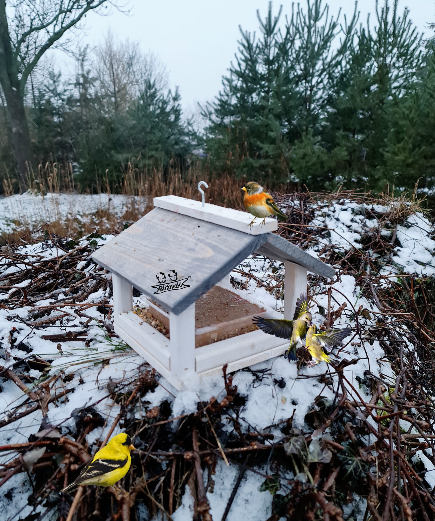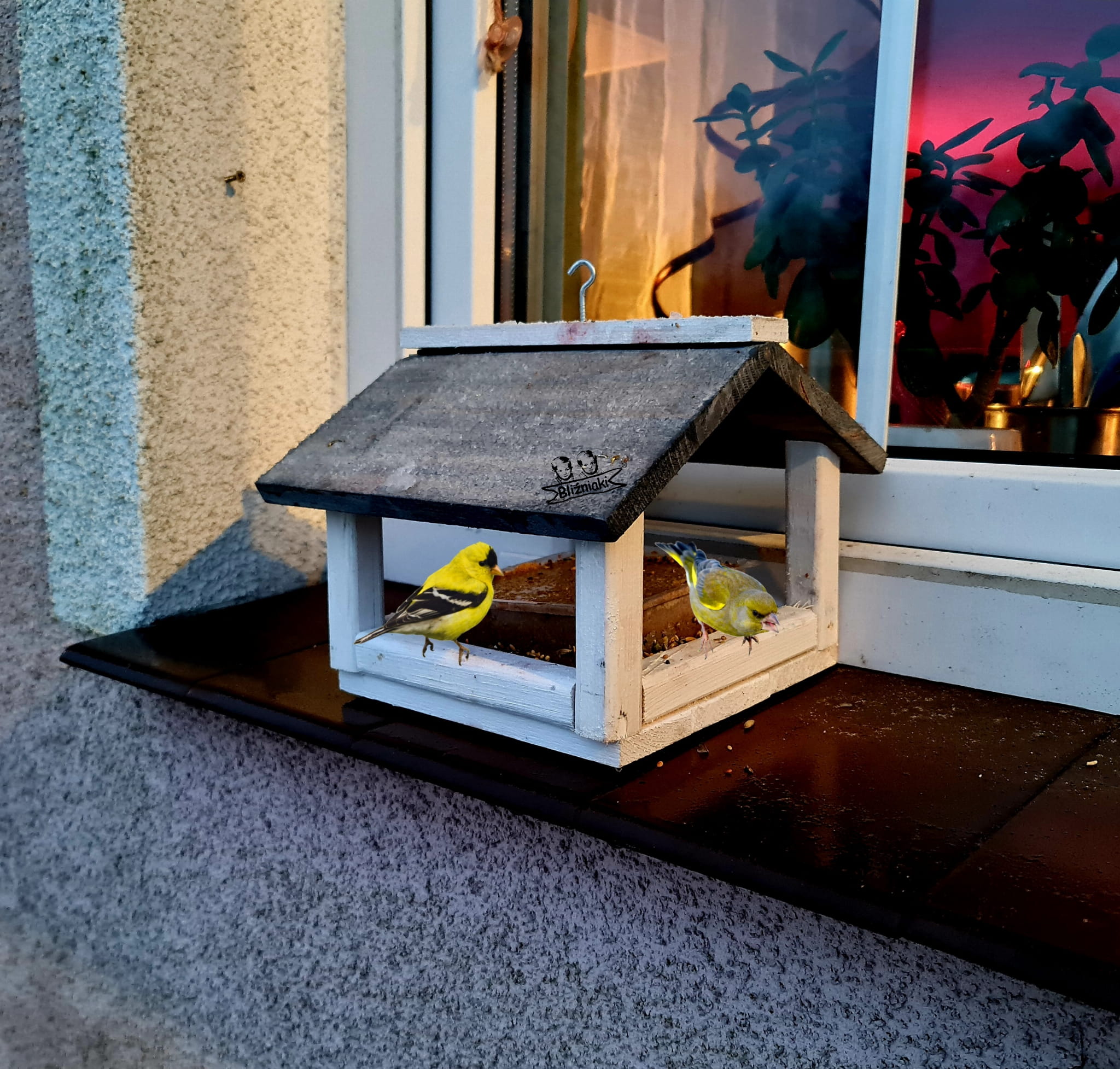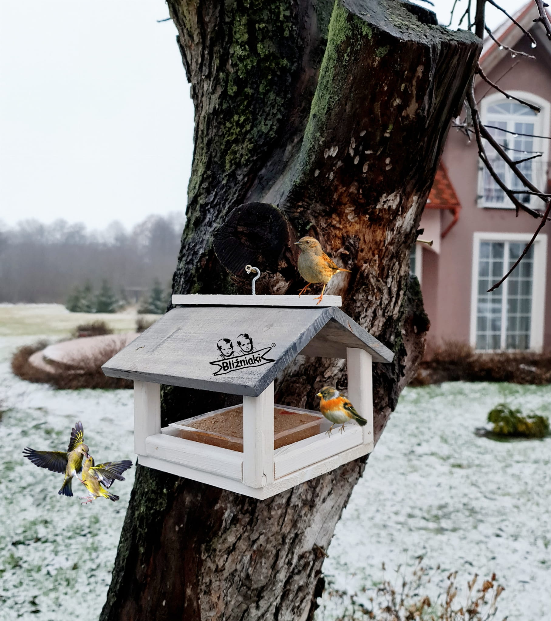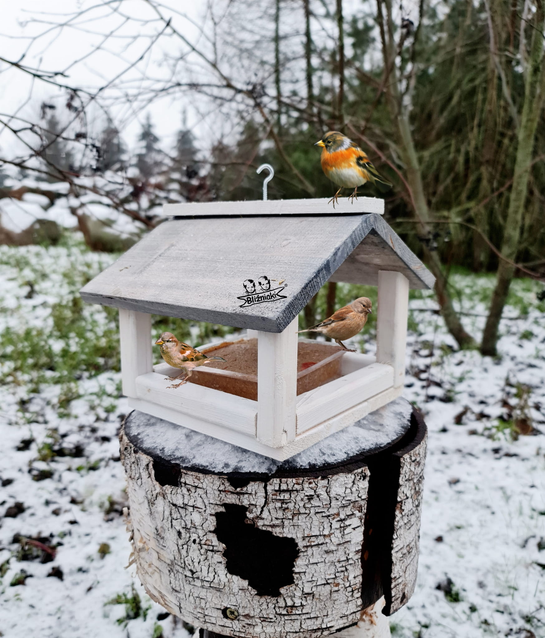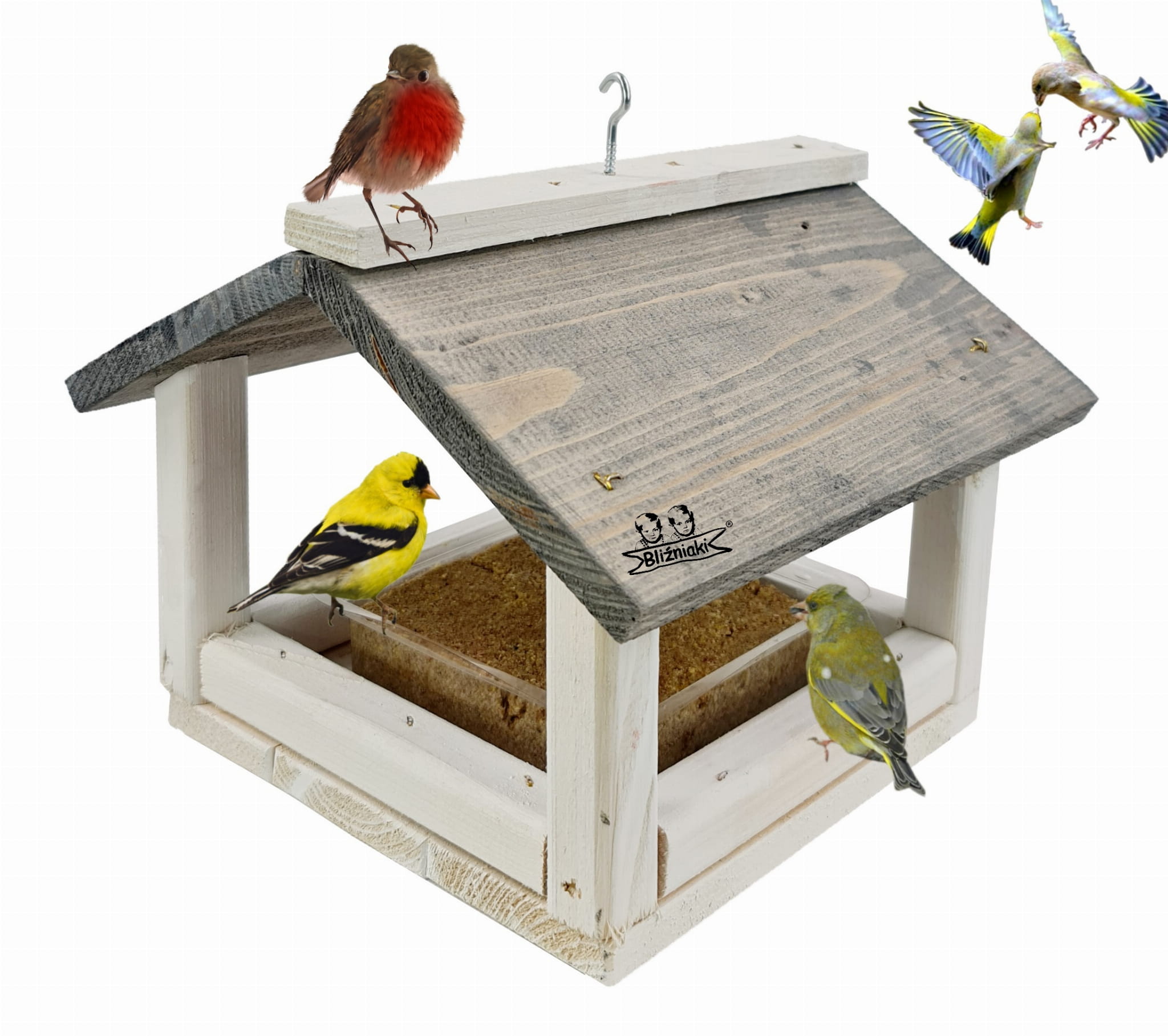 W przeważającej części karmnik jest w kolorze BIAŁYM, dach pokryty jest kolorem SZARYM.