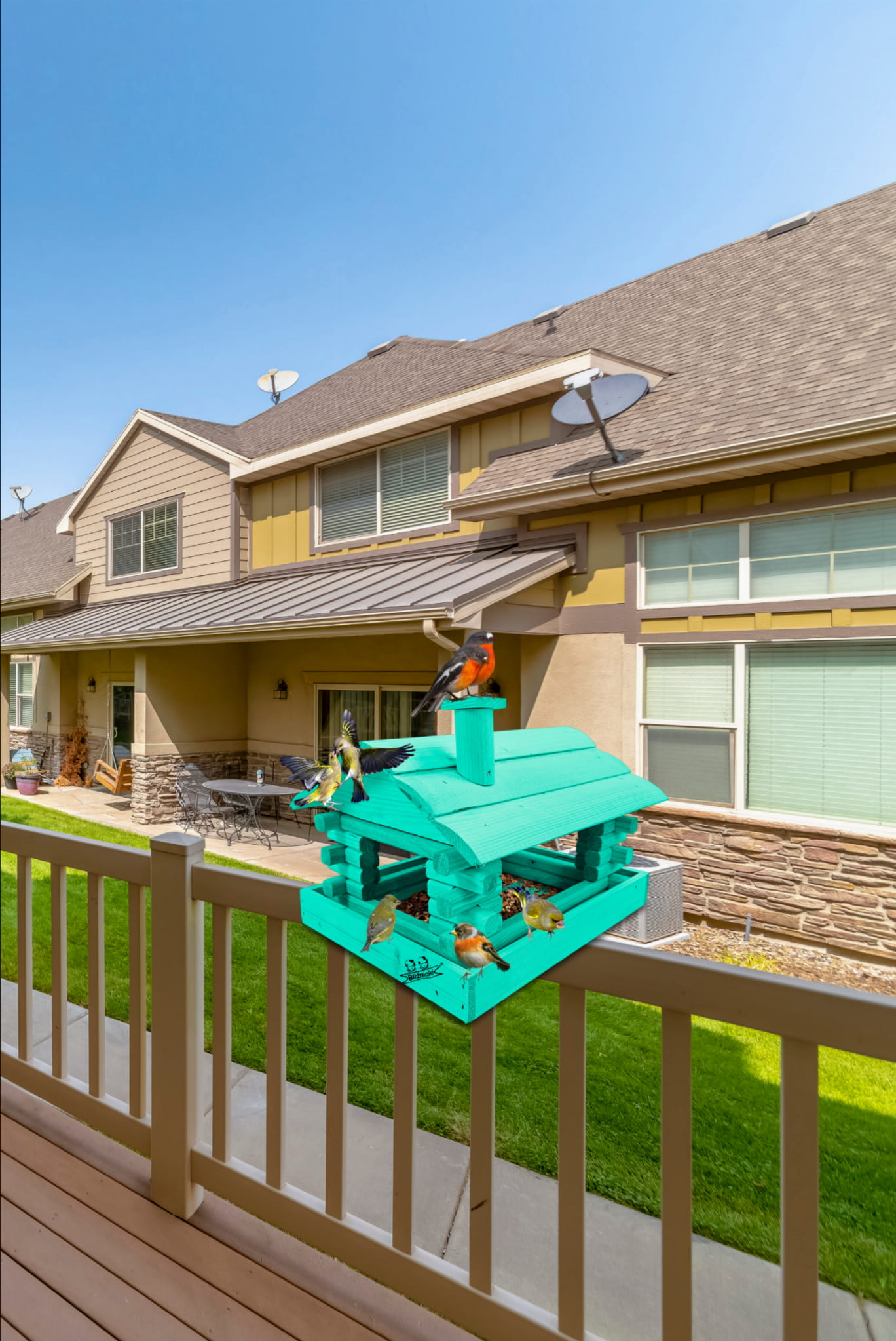 Taras – Na tarasie możesz ustawić karmnik na stole, balustradzie lub specjalnym stojaku. To świetne miejsce, gdzie ptaki będą miały przestrzeń, a Ty łatwy dostęp do uzupełniania karmy.