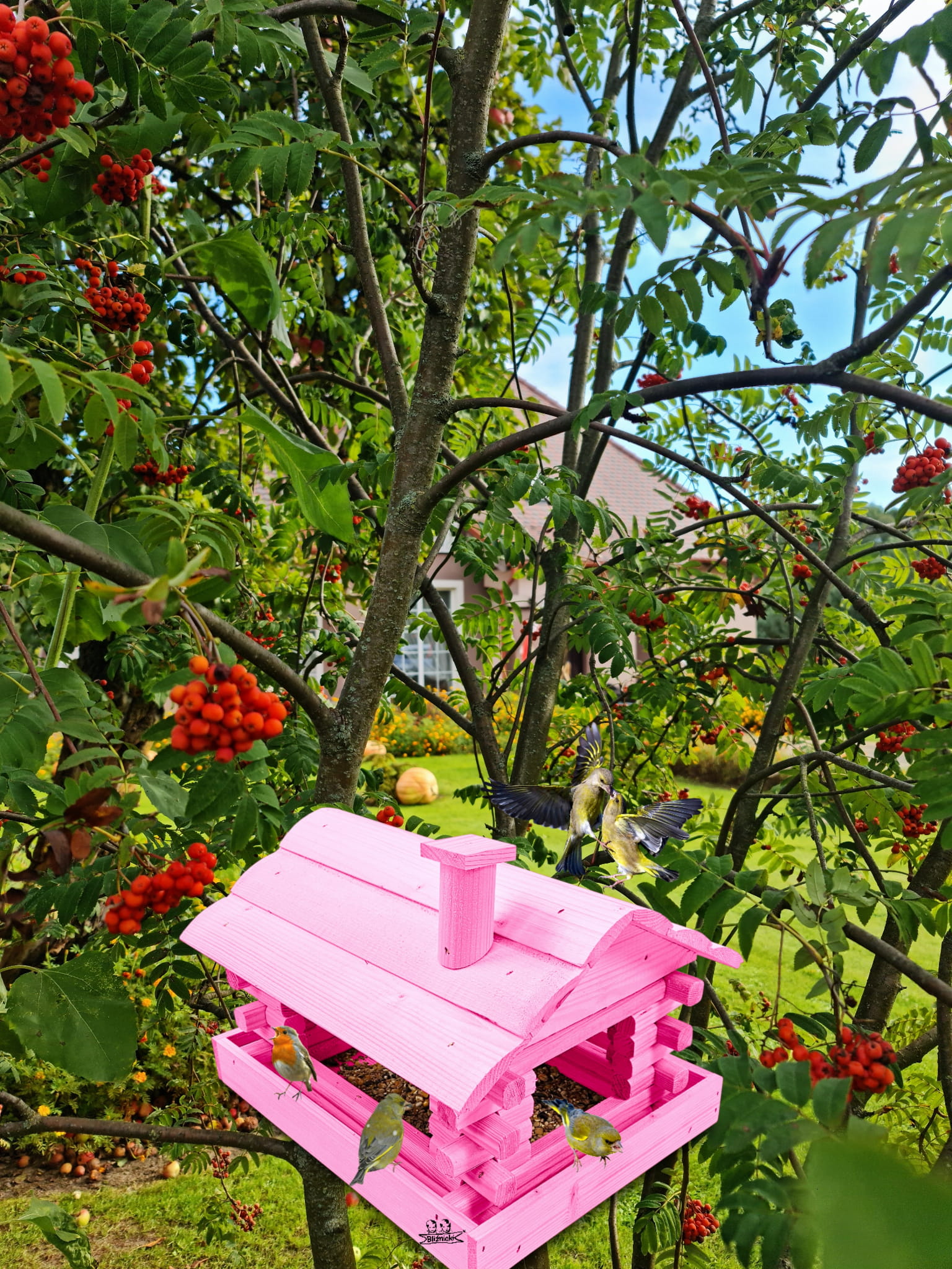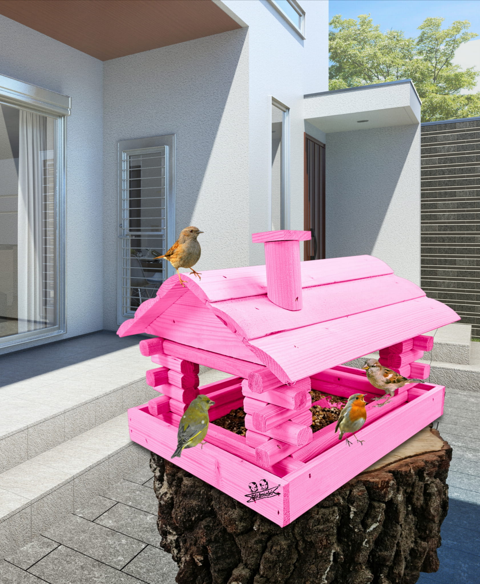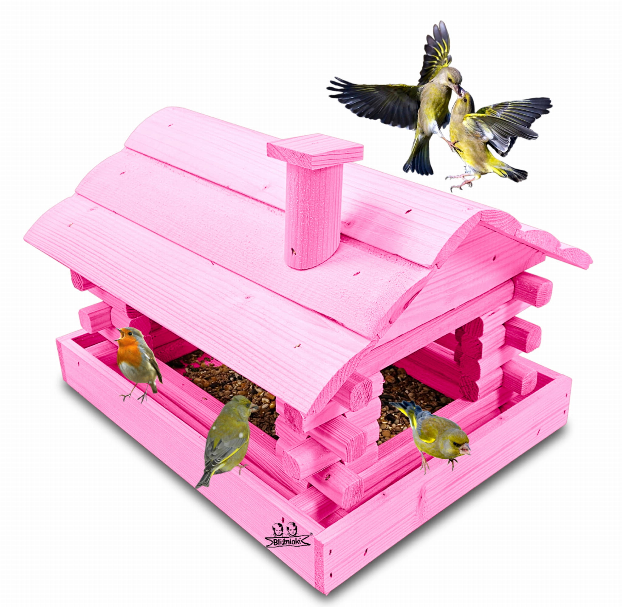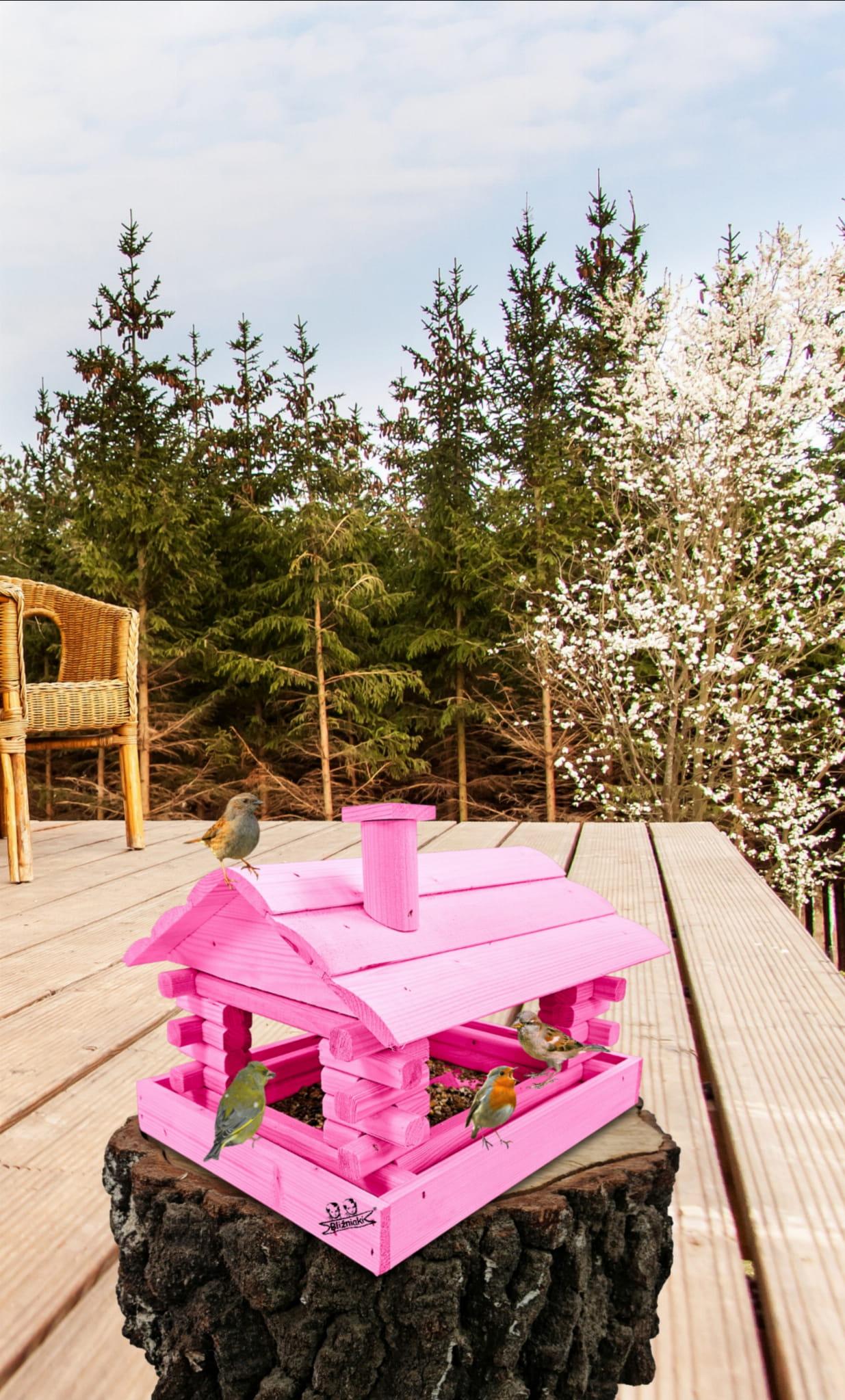 Karmnik wykonany z trwałego drewna, o starannym wykończeniu, przypomina klasyczny domek z kominem. Zapewnia ptakom bezpieczne i przytulne miejsce do odpoczynku oraz dostępu do pożywienia w zimniejszych miesiącach.