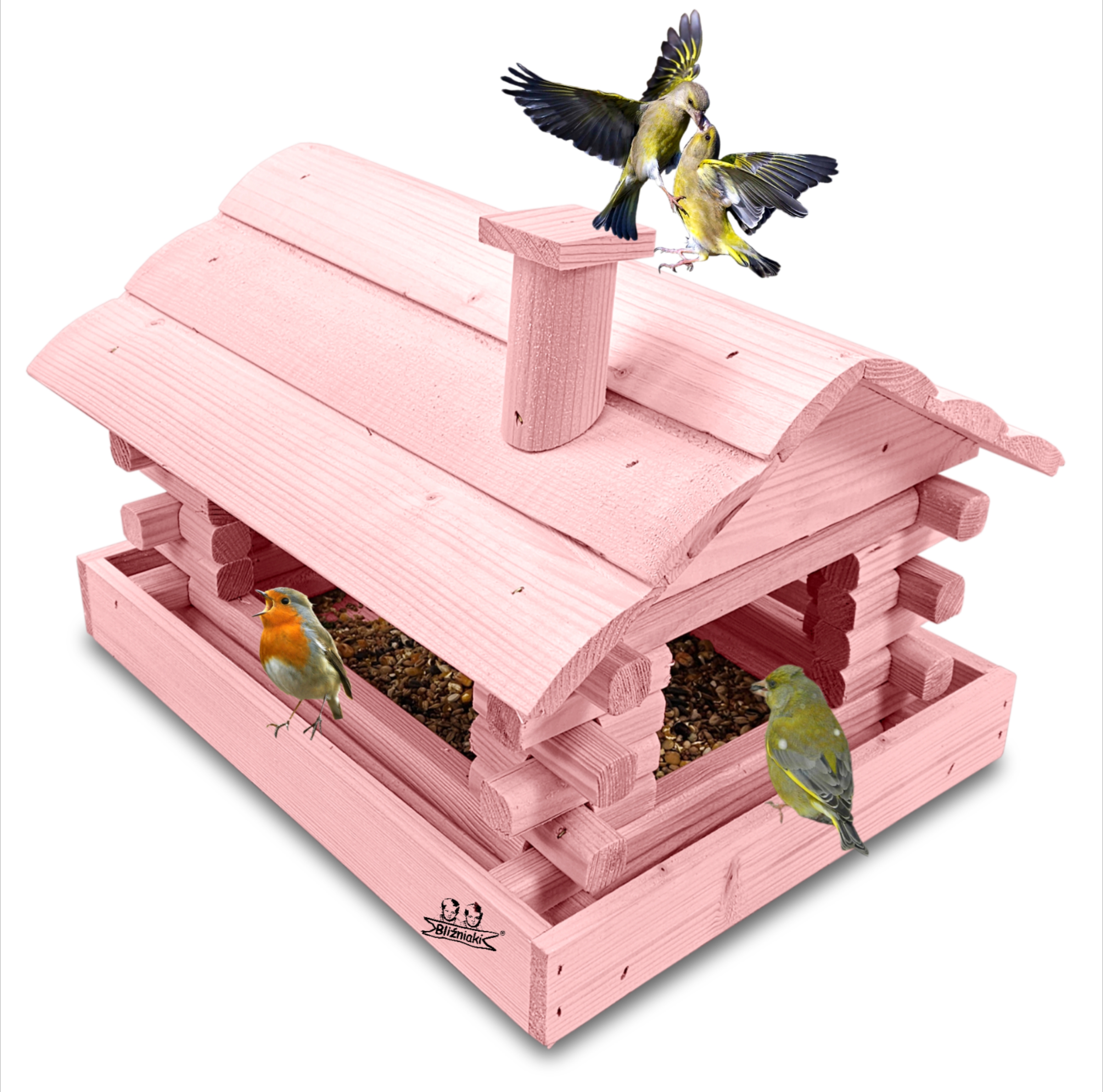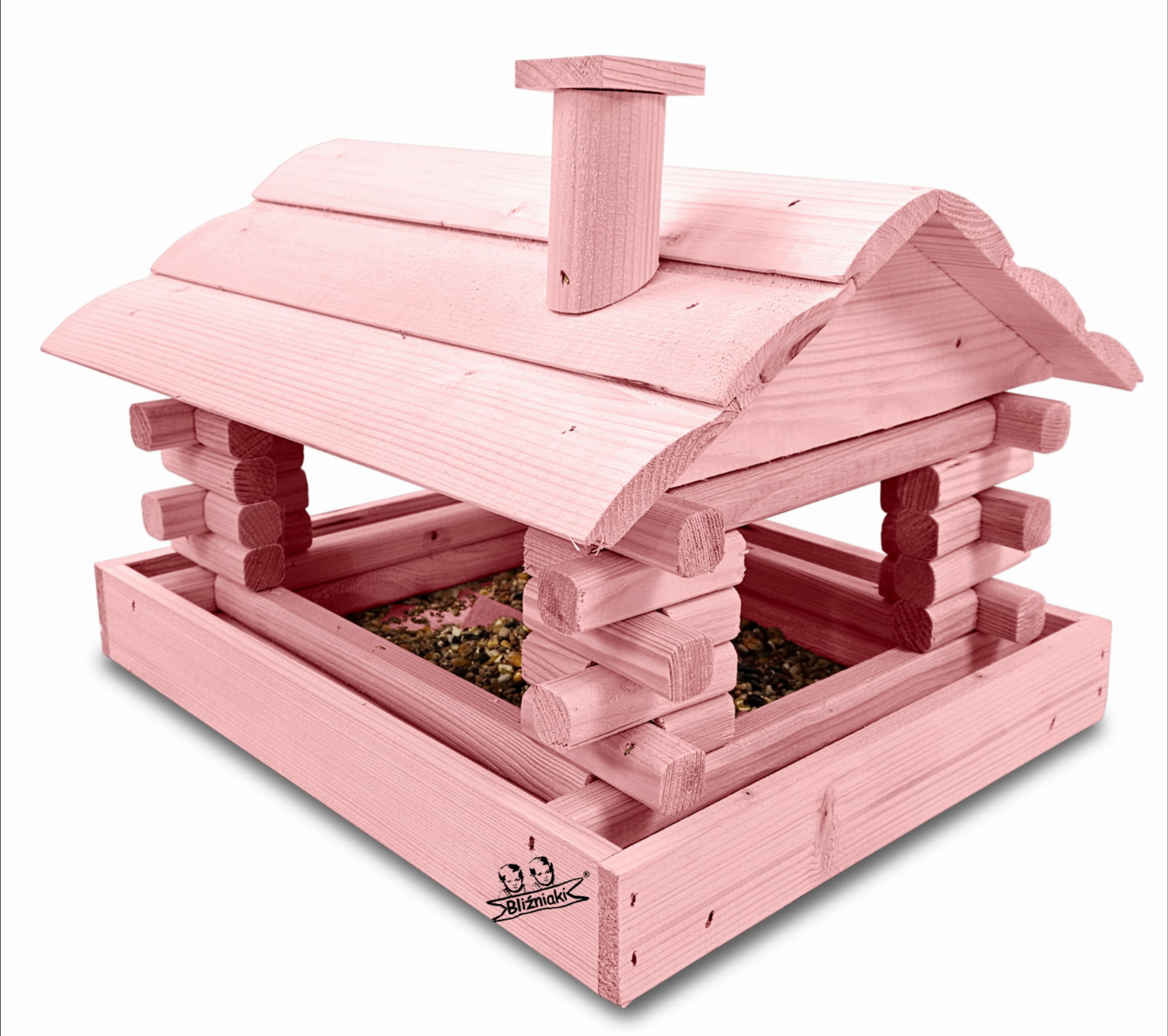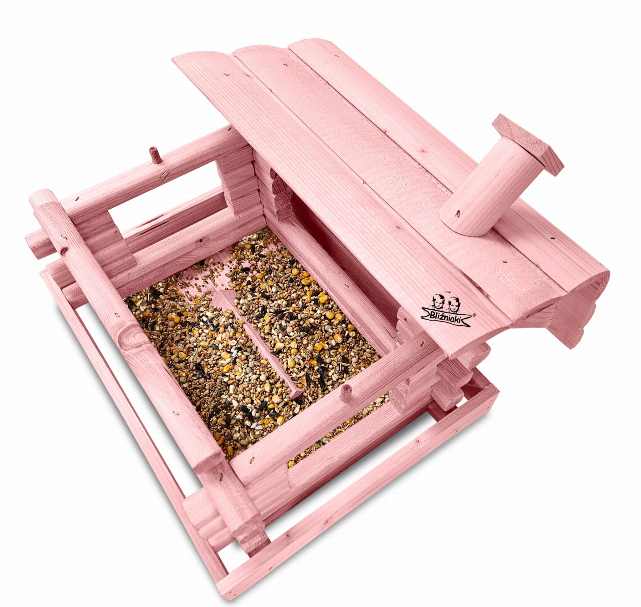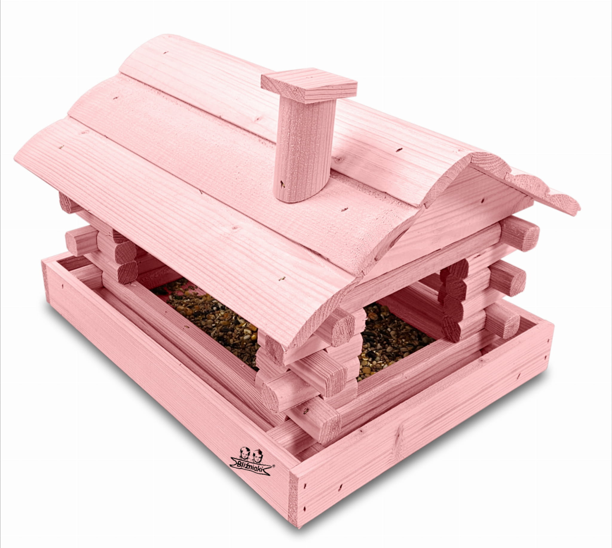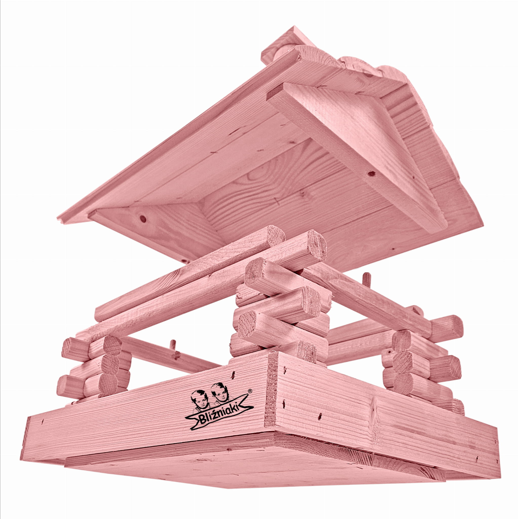 Karmnik w kolorze różowym został zaprojektowany w taki sposób, aby sprostać każdym warunkom atmosferycznym przez cały rok. Wykonany w całości z impregnowanego ekologicznie drewna uzyskał trwałość i odporność na szkodliwe działanie wody oraz wilgoci, promieni UV, a także grzybów i pleśni. Może być więc przechowywany przez cały rok na zewnątrz.