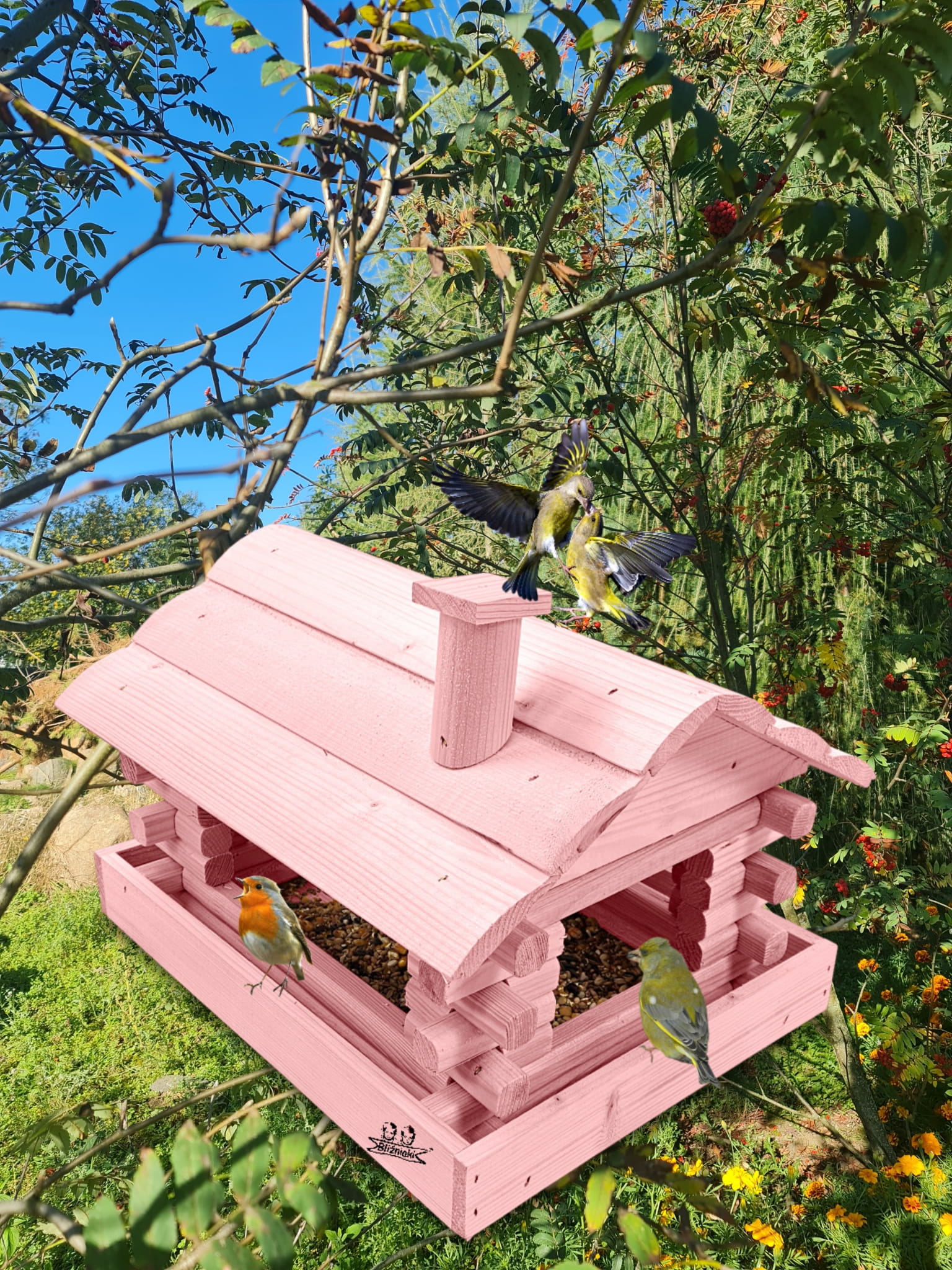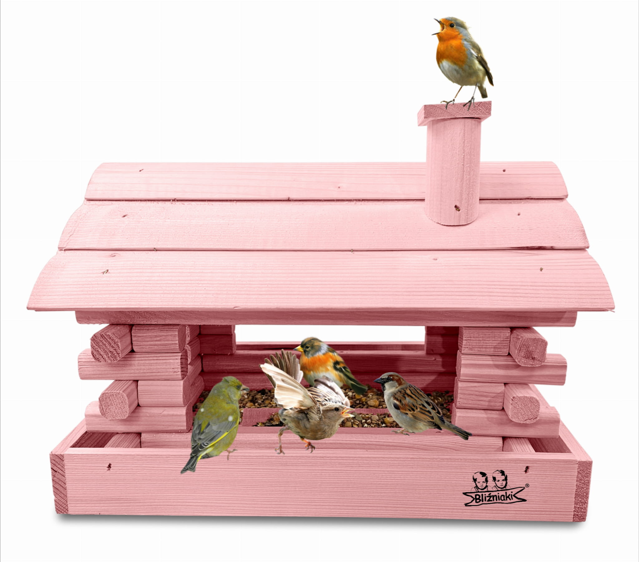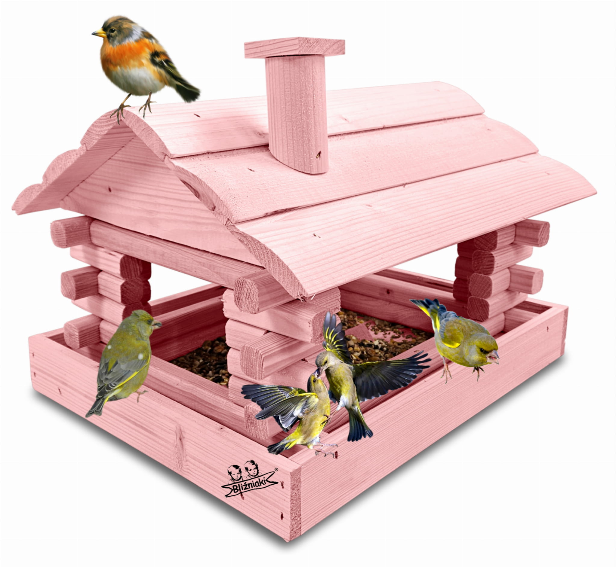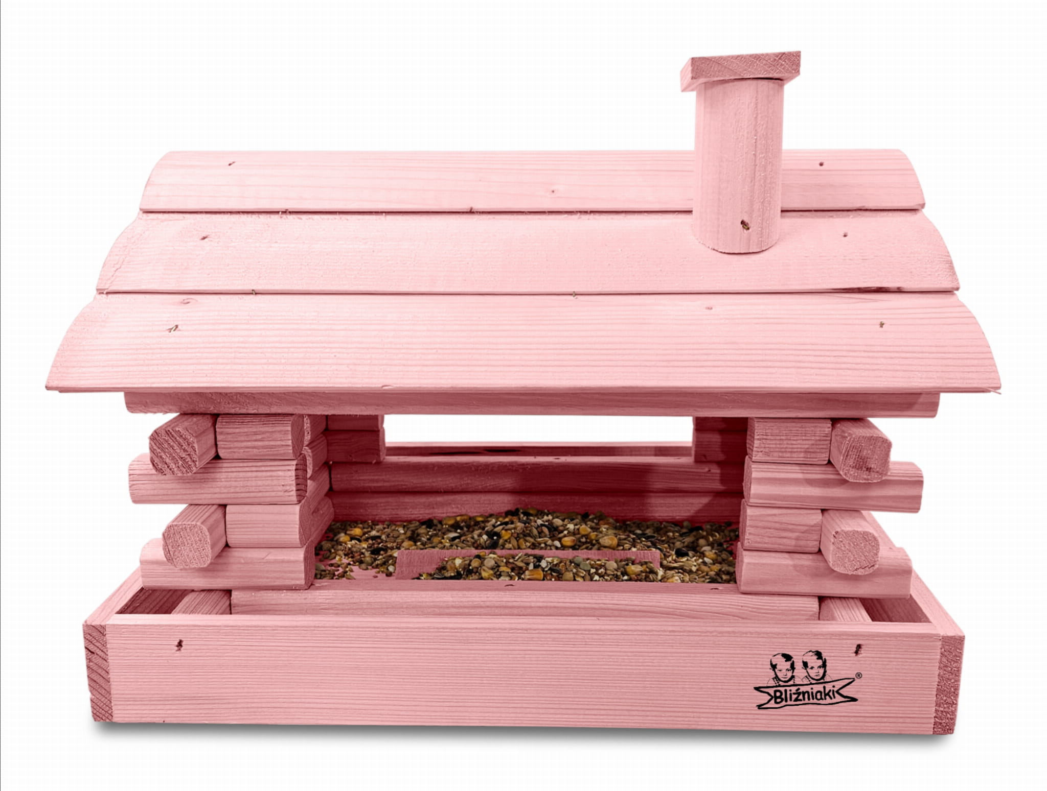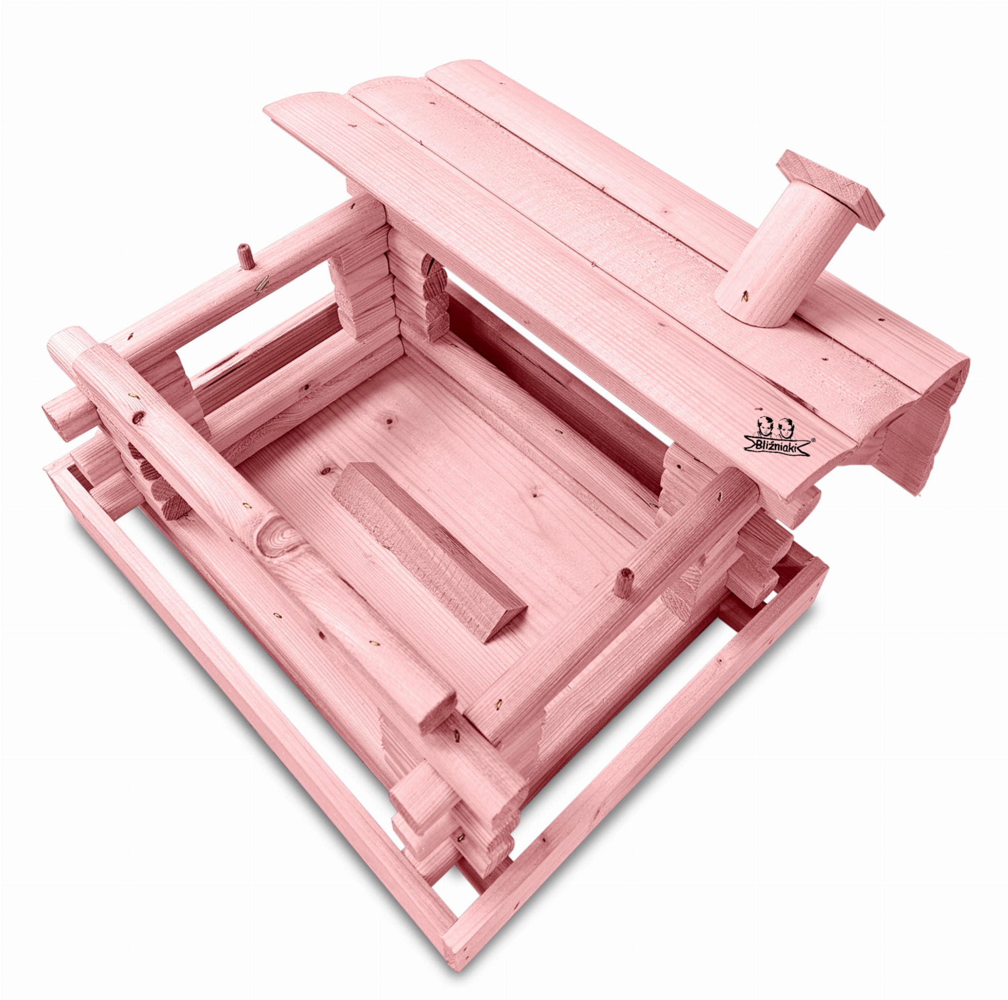 Karmnik w kolorze różowym został zaprojektowany w taki sposób, aby sprostać każdym warunkom atmosferycznym przez cały rok. Wykonany w całości z impregnowanego ekologicznie drewna uzyskał trwałość i odporność na szkodliwe działanie wody oraz wilgoci, promieni UV, a także grzybów i pleśni. Może być więc przechowywany przez cały rok na zewnątrz.