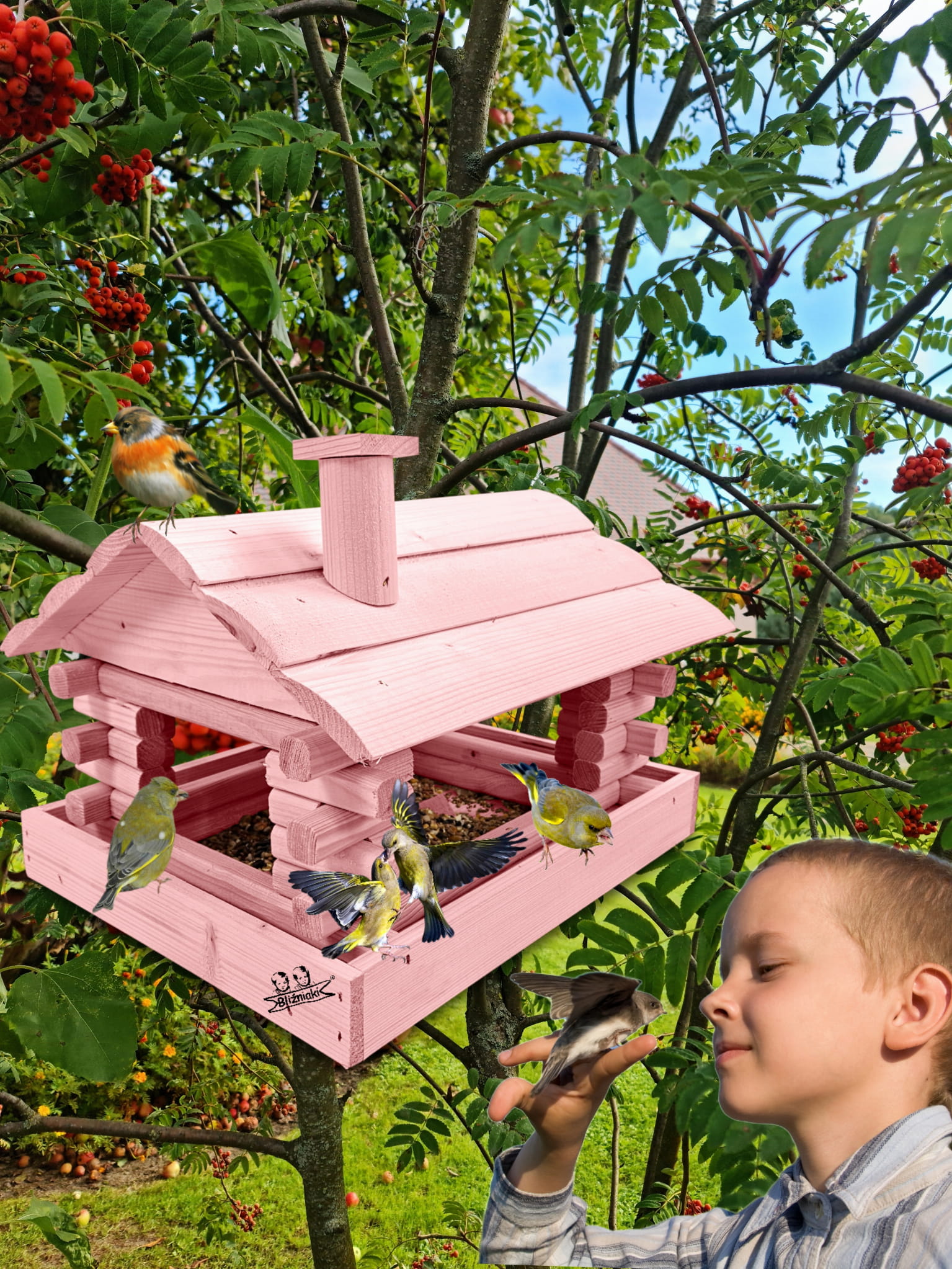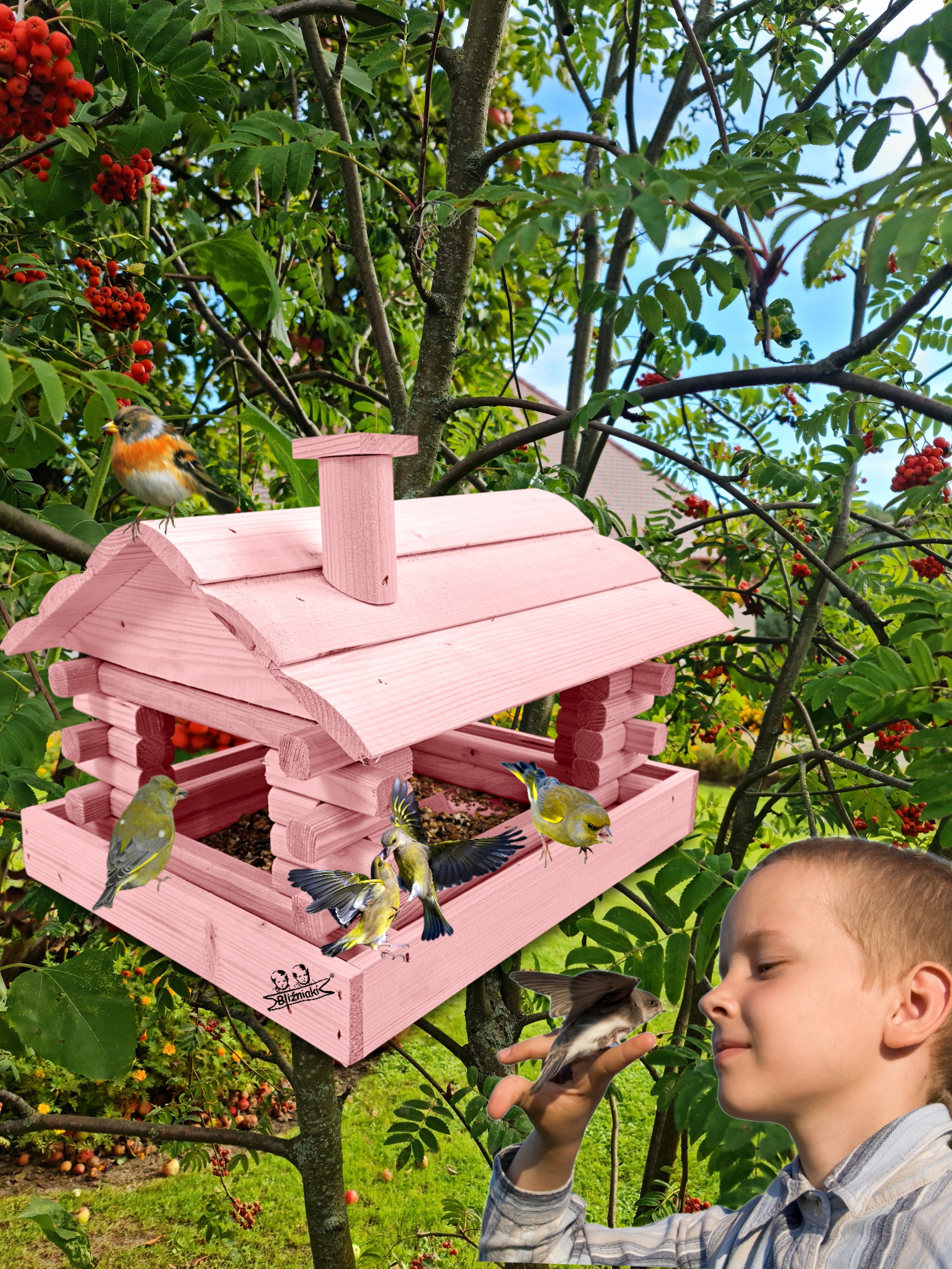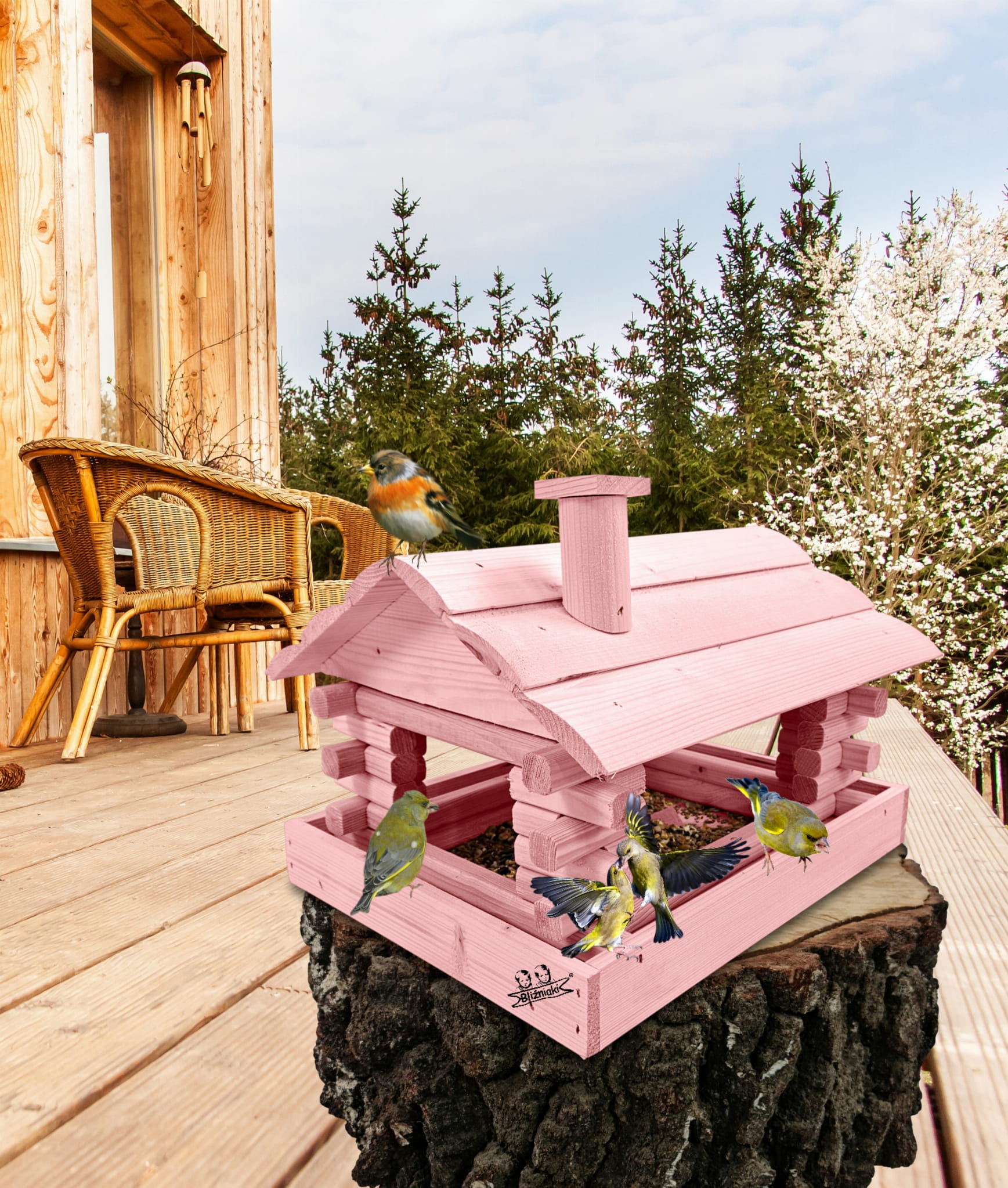 Karmnik wykonany z trwałego drewna, o starannym wykończeniu, przypomina klasyczny domek z kominem. Zapewnia ptakom bezpieczne i przytulne miejsce do odpoczynku oraz dostępu do pożywienia w zimniejszych miesiącach.