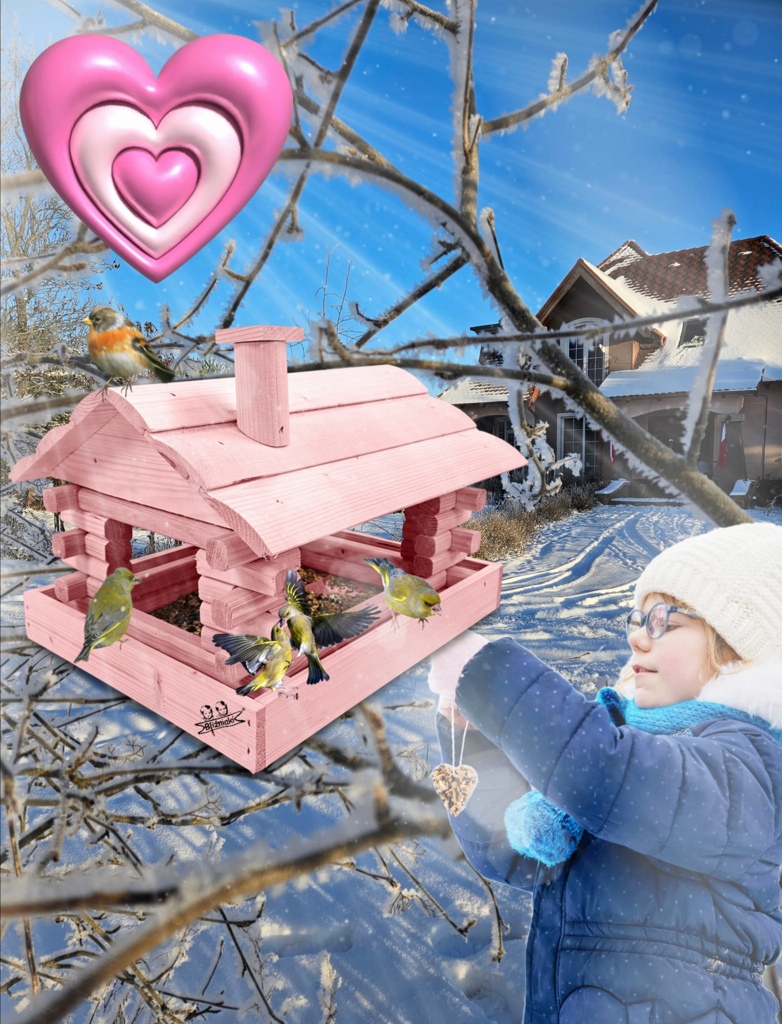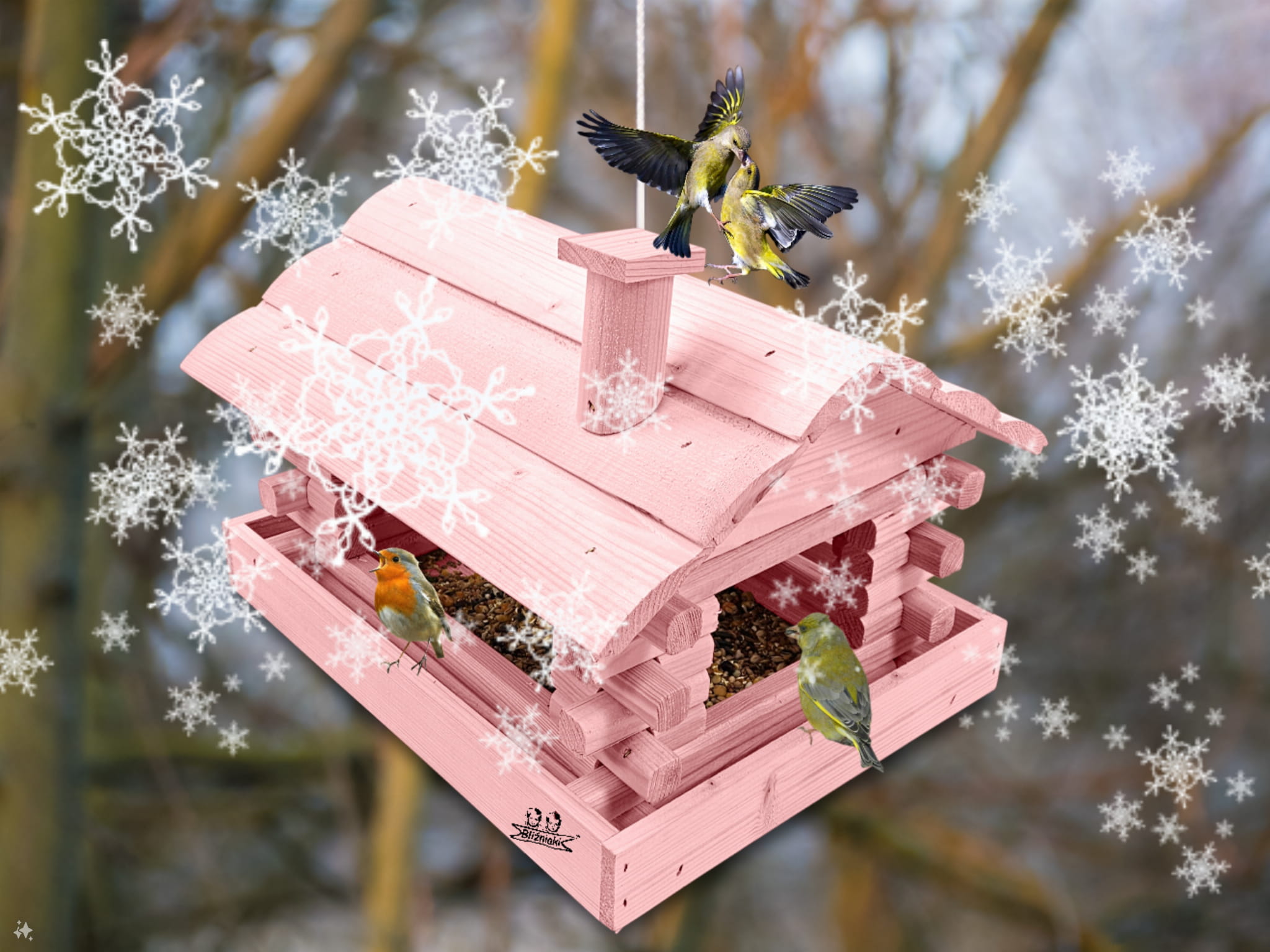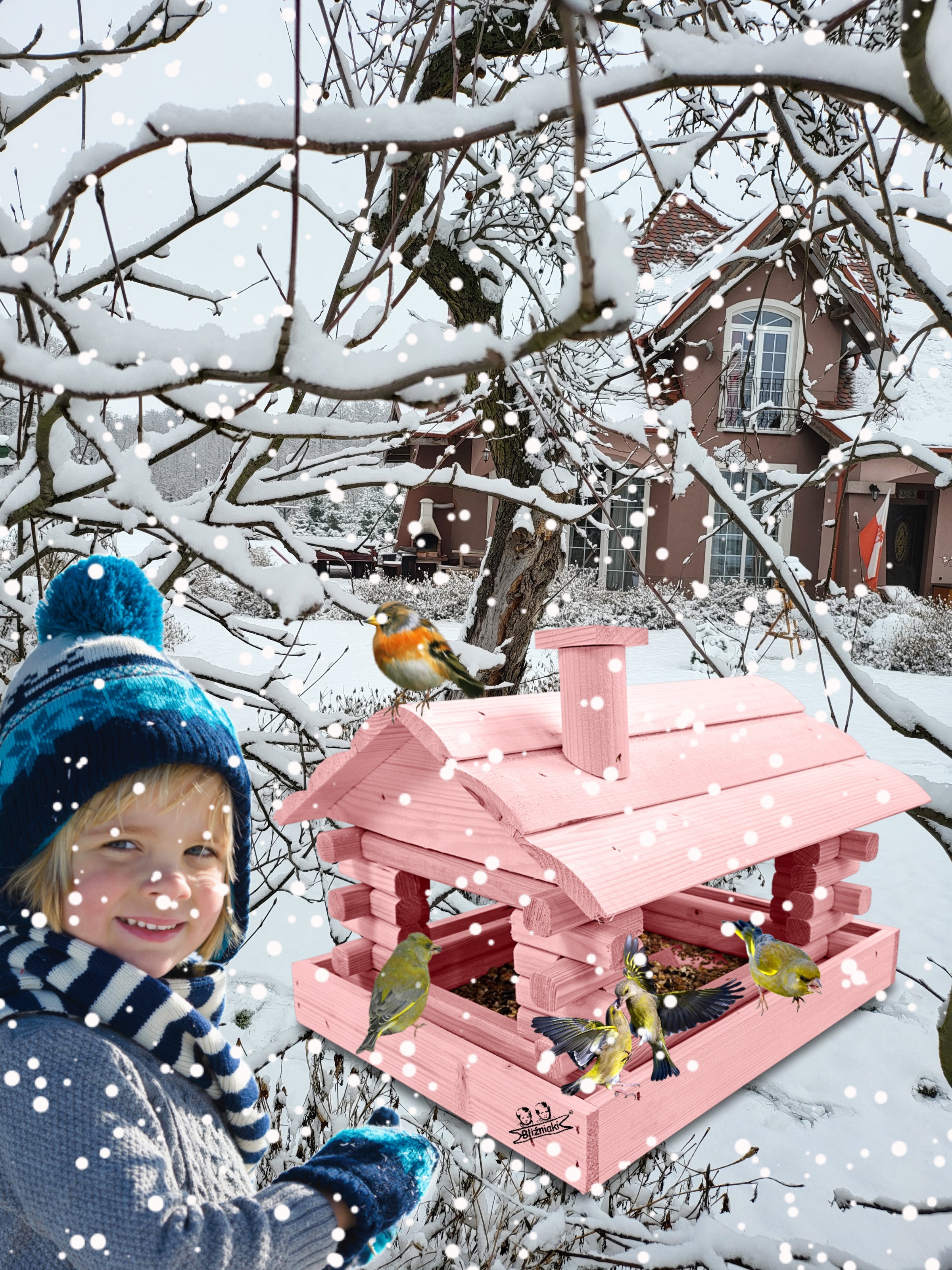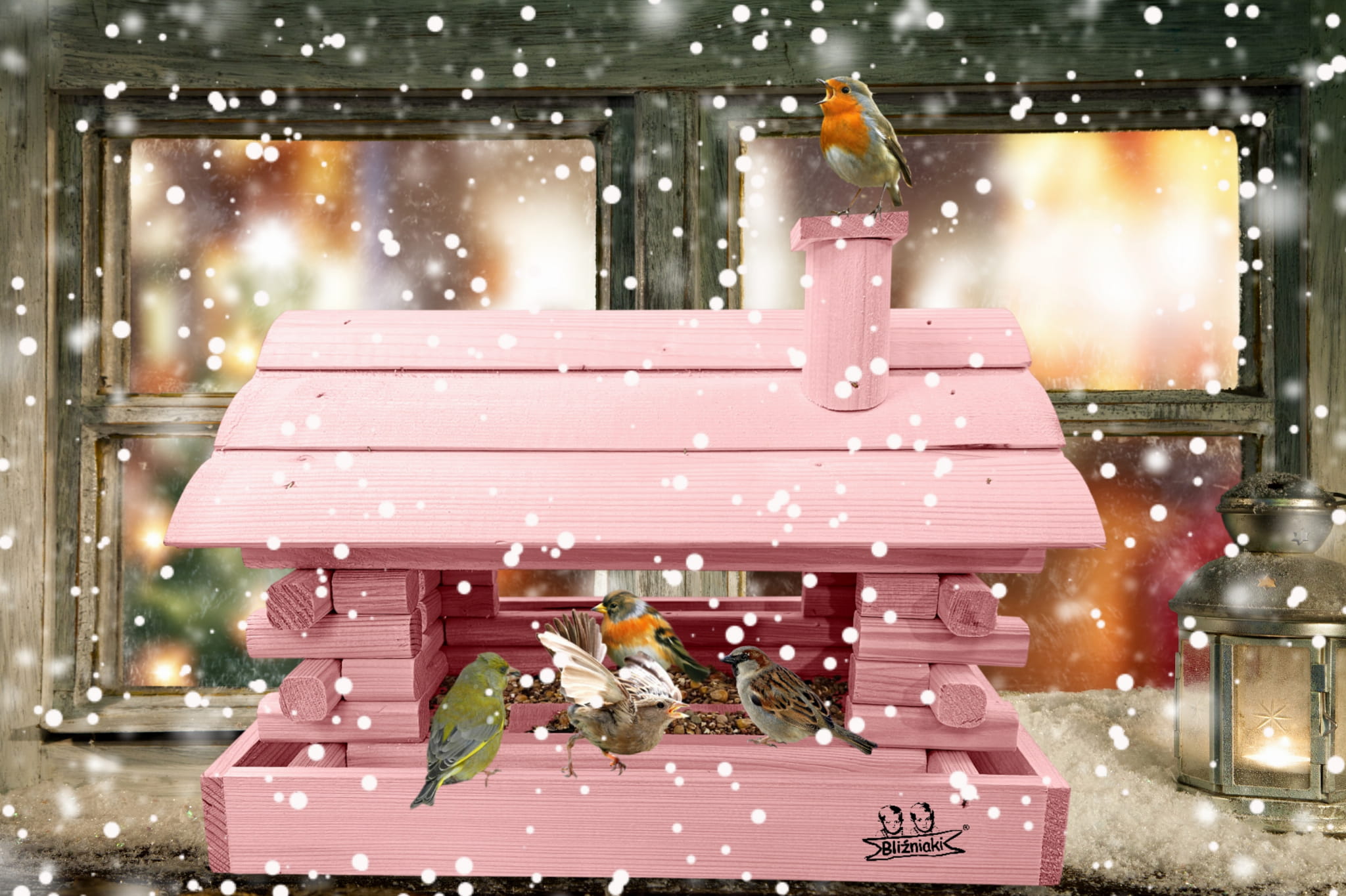 Karmnik wykonany z trwałego drewna, o starannym wykończeniu, przypomina klasyczny domek z kominem. Zapewnia ptakom bezpieczne i przytulne miejsce do odpoczynku oraz dostępu do pożywienia w zimniejszych miesiącach.