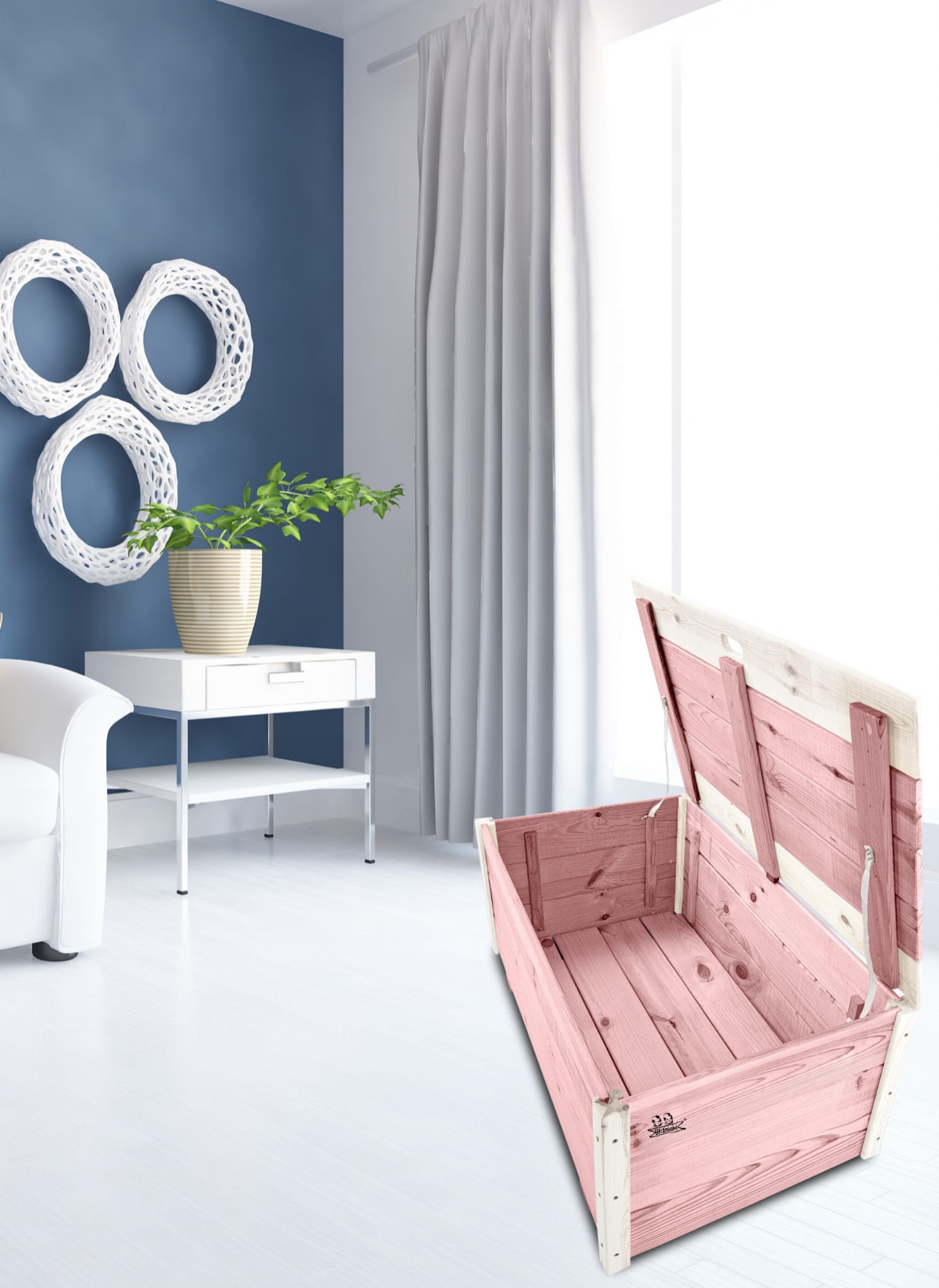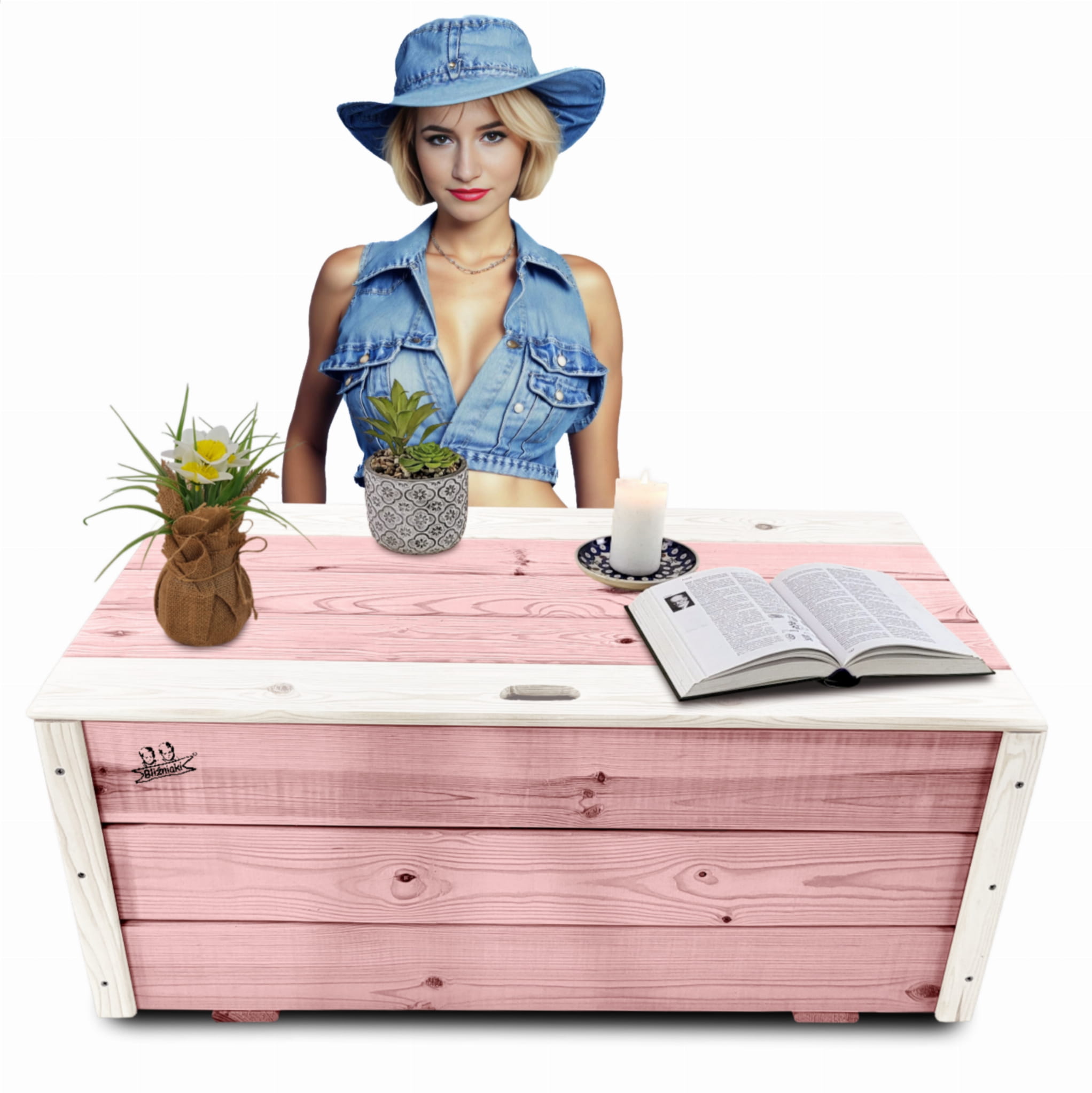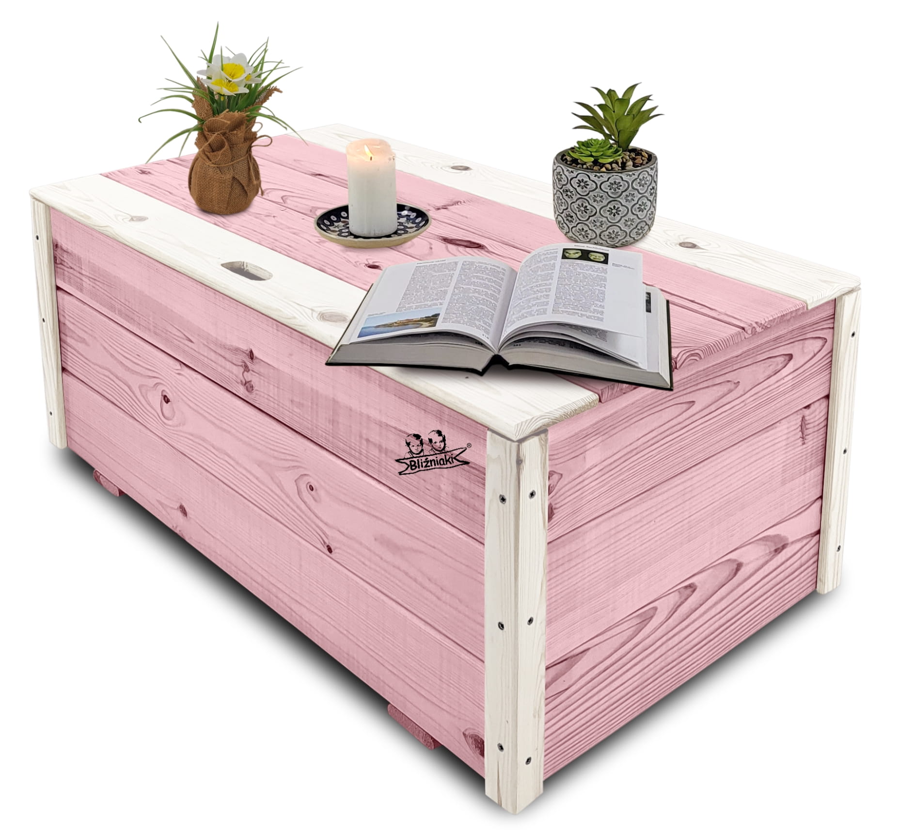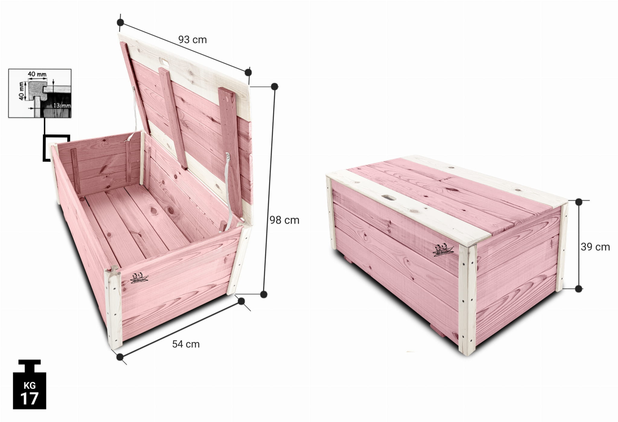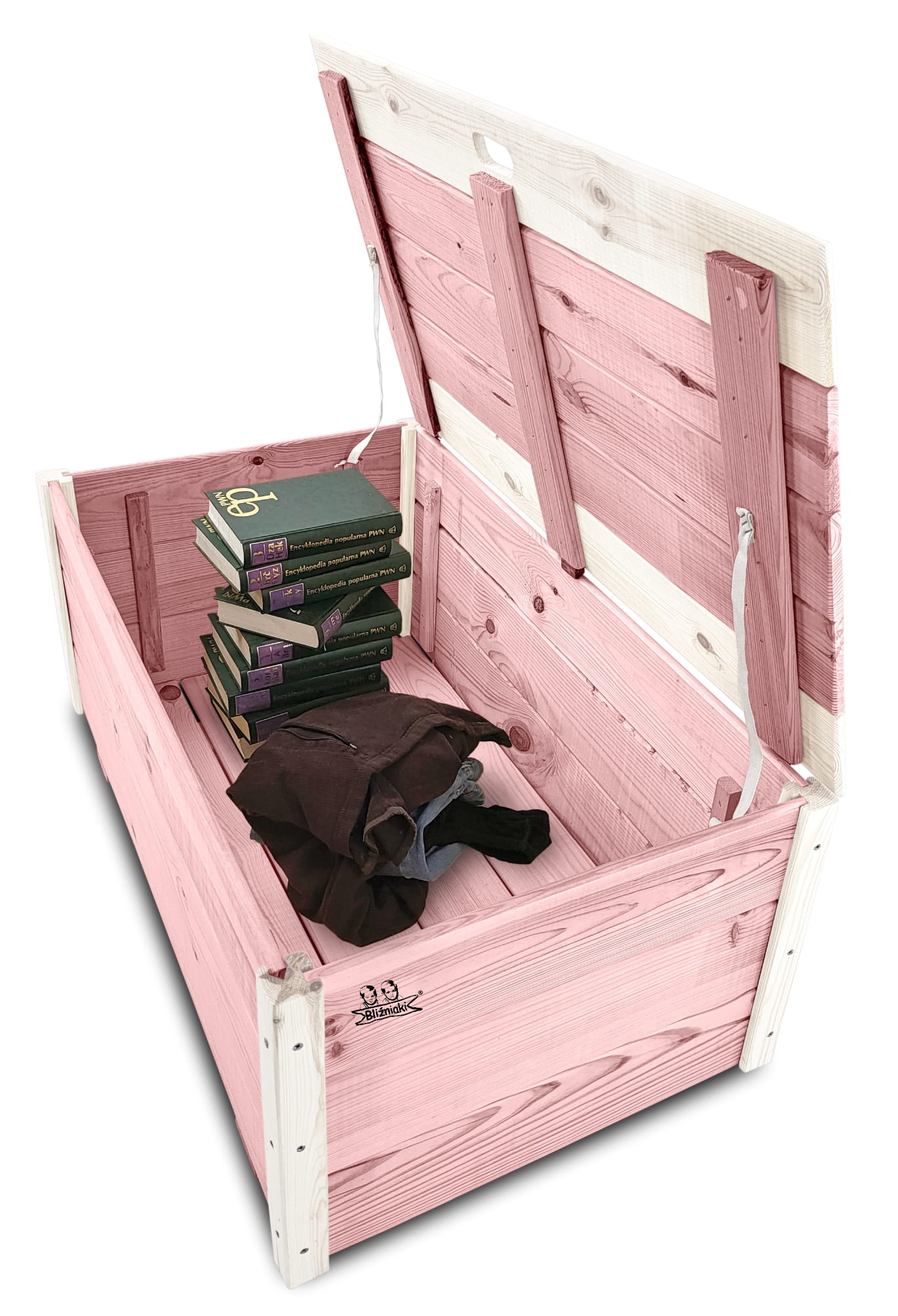 Wykonany z litego drewna, jest odporny na warunki atmosferyczne i zachowuje estetyczny wygląd na dłużej. Produkt dwukolorowy, w podstawowej przeważającej części w kolorze PASTELOWYM RÓŻOWYM, został wykończony w kątownikach i listwach kolorem BIAŁYM. Skrzynia jest zaimpregnowana jednolicie zarówno od wewnątrz, jak i na zewnątrz. Dzięki temu zabiegowi produktowi został nadany styl i elegancki design.