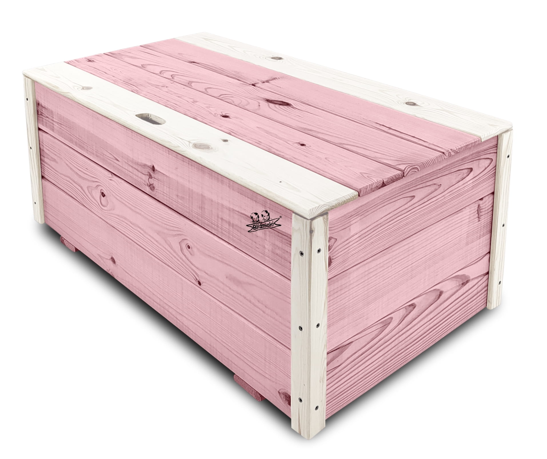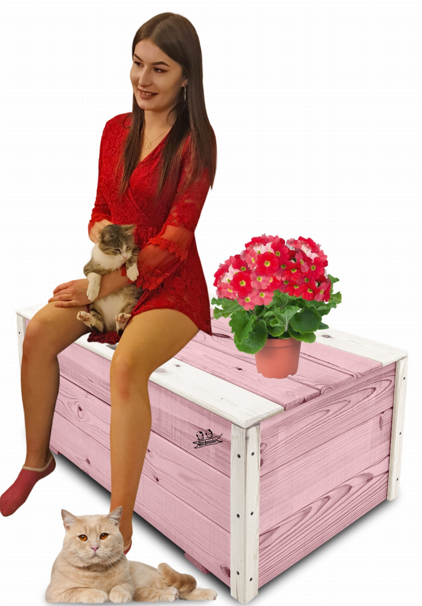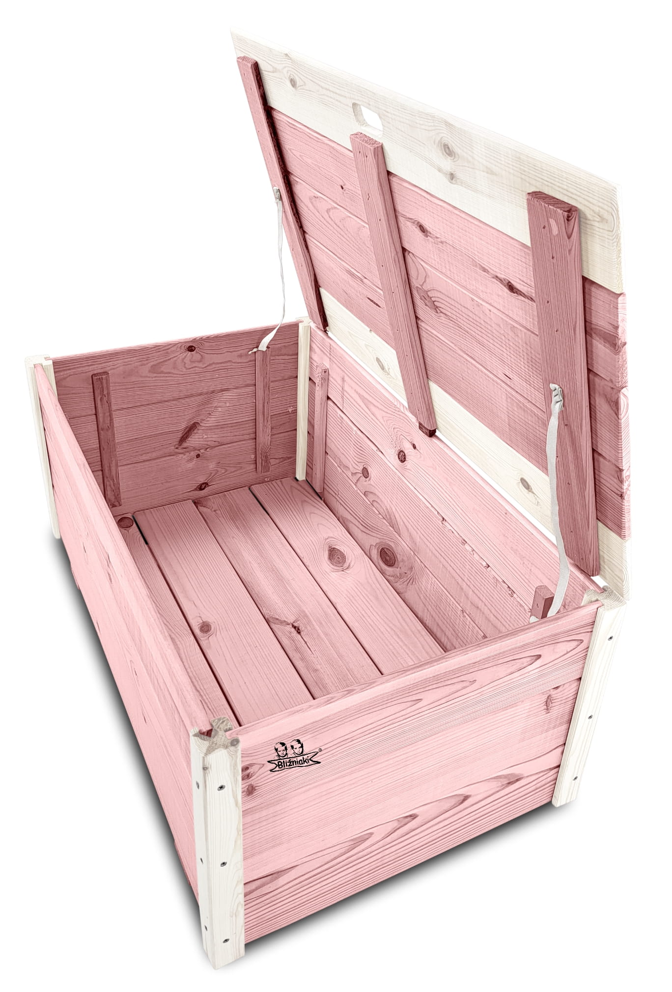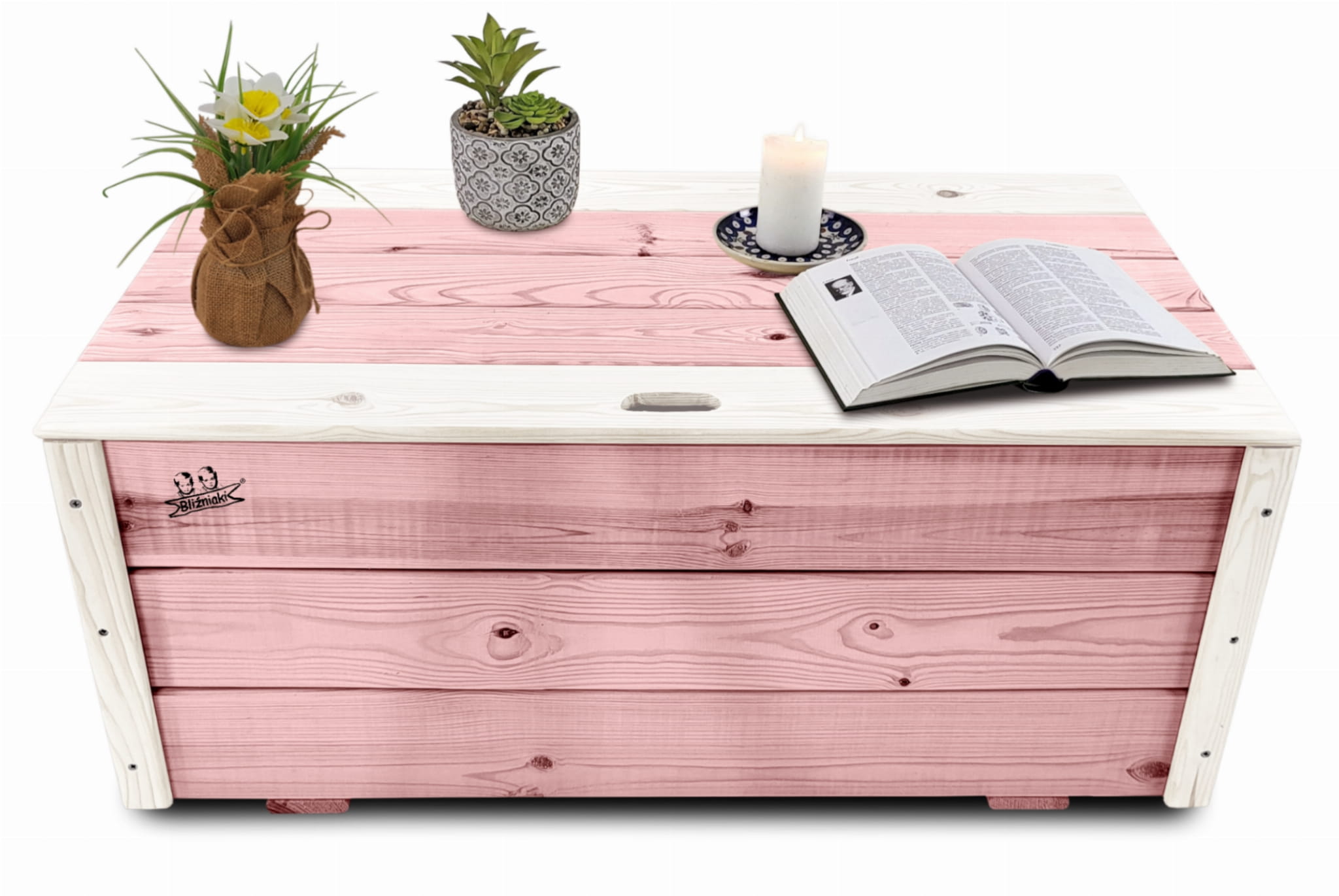 Wykonany z litego drewna, jest odporny na warunki atmosferyczne i zachowuje estetyczny wygląd na dłużej. Produkt dwukolorowy, w podstawowej przeważającej części w kolorze PASTELOWYM RÓŻOWYM, został wykończony w kątownikach i listwach kolorem BIAŁYM. Skrzynia jest zaimpregnowana jednolicie zarówno od wewnątrz, jak i na zewnątrz. Dzięki temu zabiegowi produktowi został nadany styl i elegancki design.