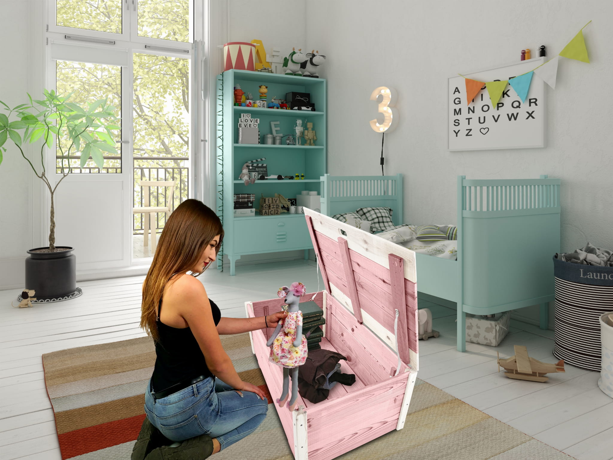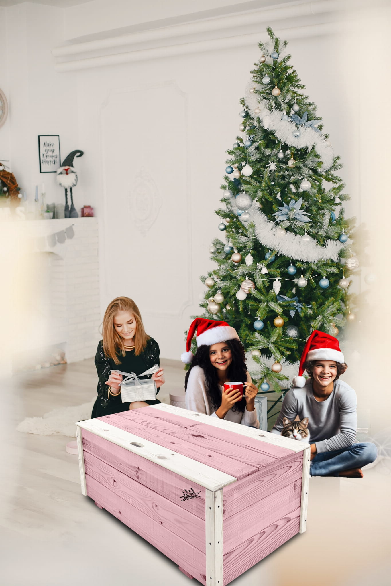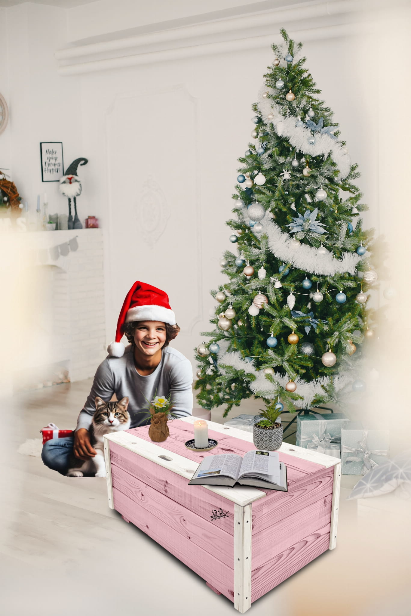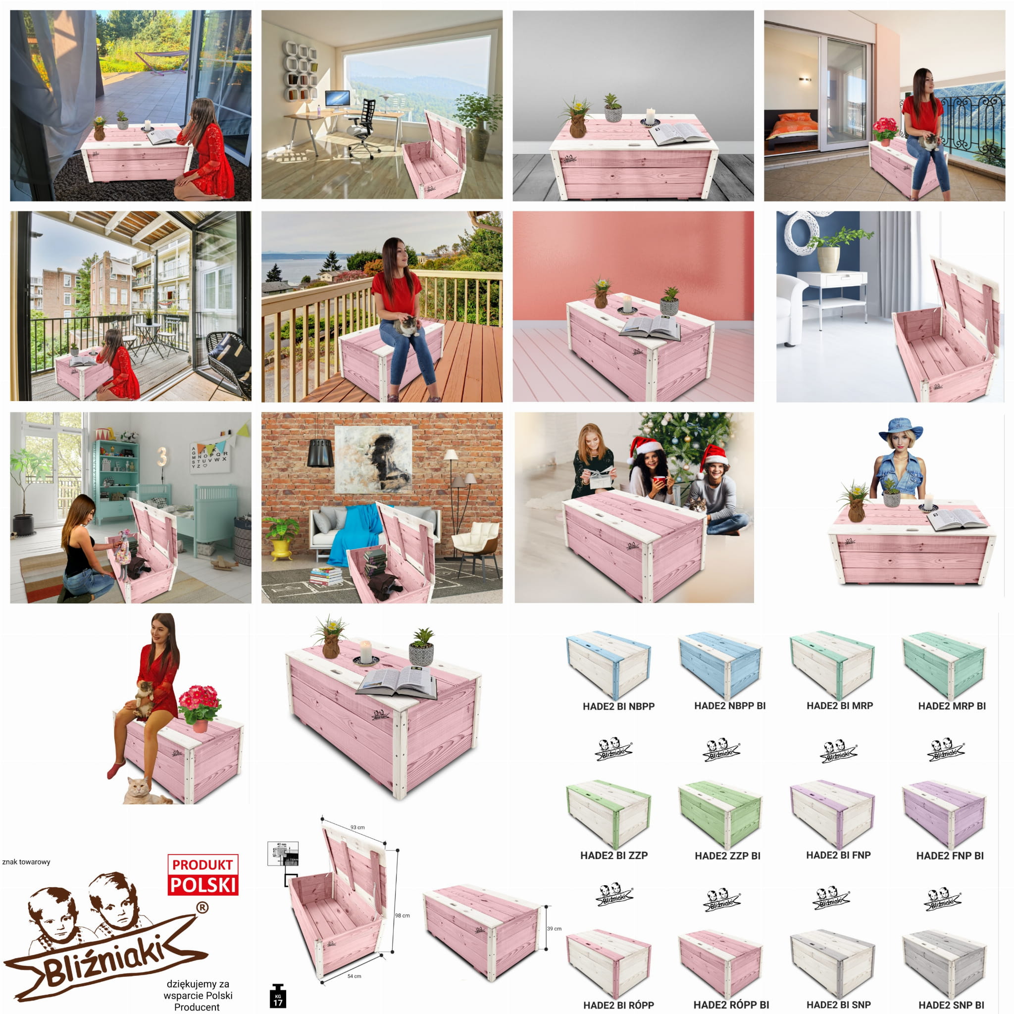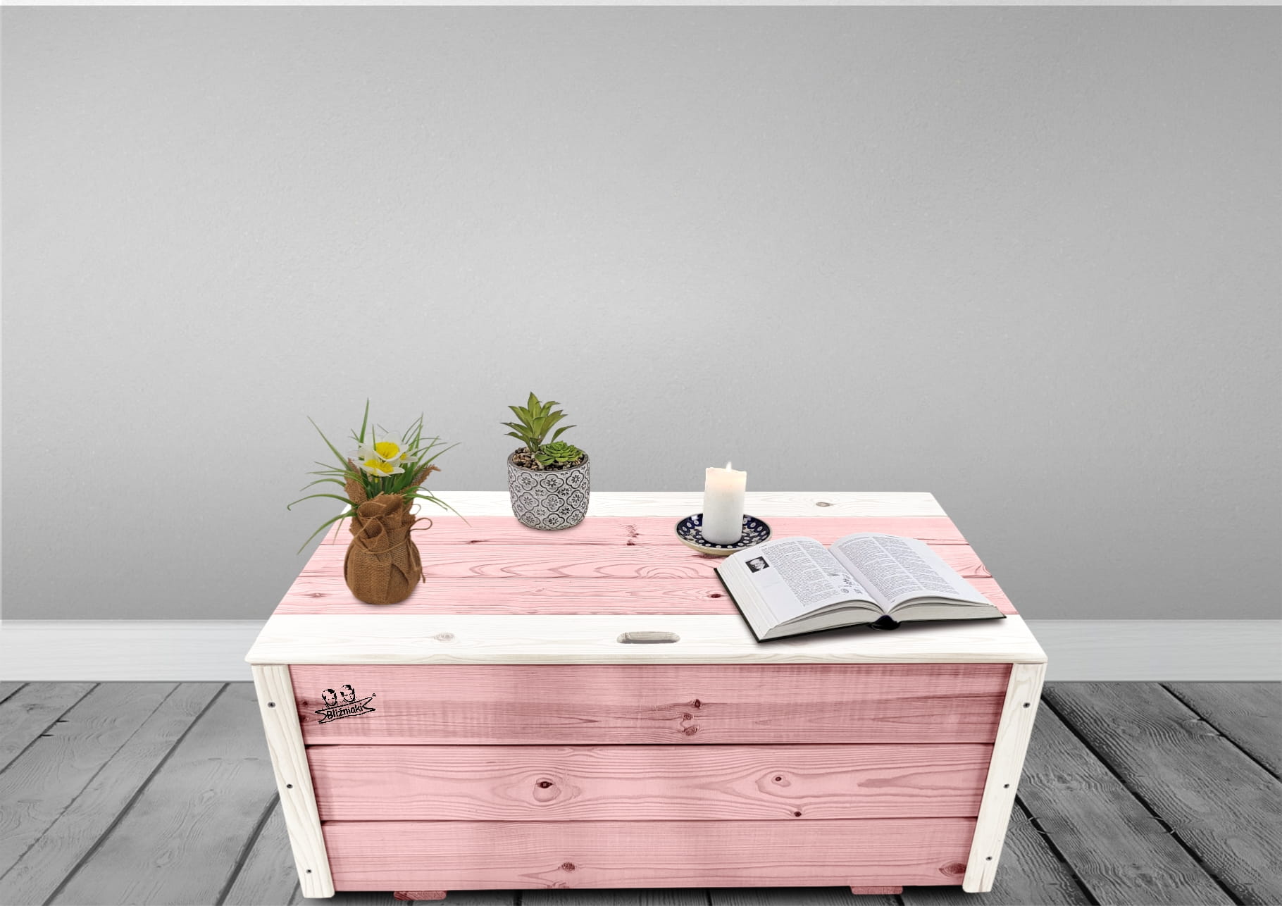 Wykonany z litego drewna, jest odporny na warunki atmosferyczne i zachowuje estetyczny wygląd na dłużej. Produkt dwukolorowy, w podstawowej przeważającej części w kolorze PASTELOWYM RÓŻOWYM, został wykończony w kątownikach i listwach kolorem BIAŁYM. Skrzynia jest zaimpregnowana jednolicie zarówno od wewnątrz, jak i na zewnątrz. Dzięki temu zabiegowi produktowi został nadany styl i elegancki design.