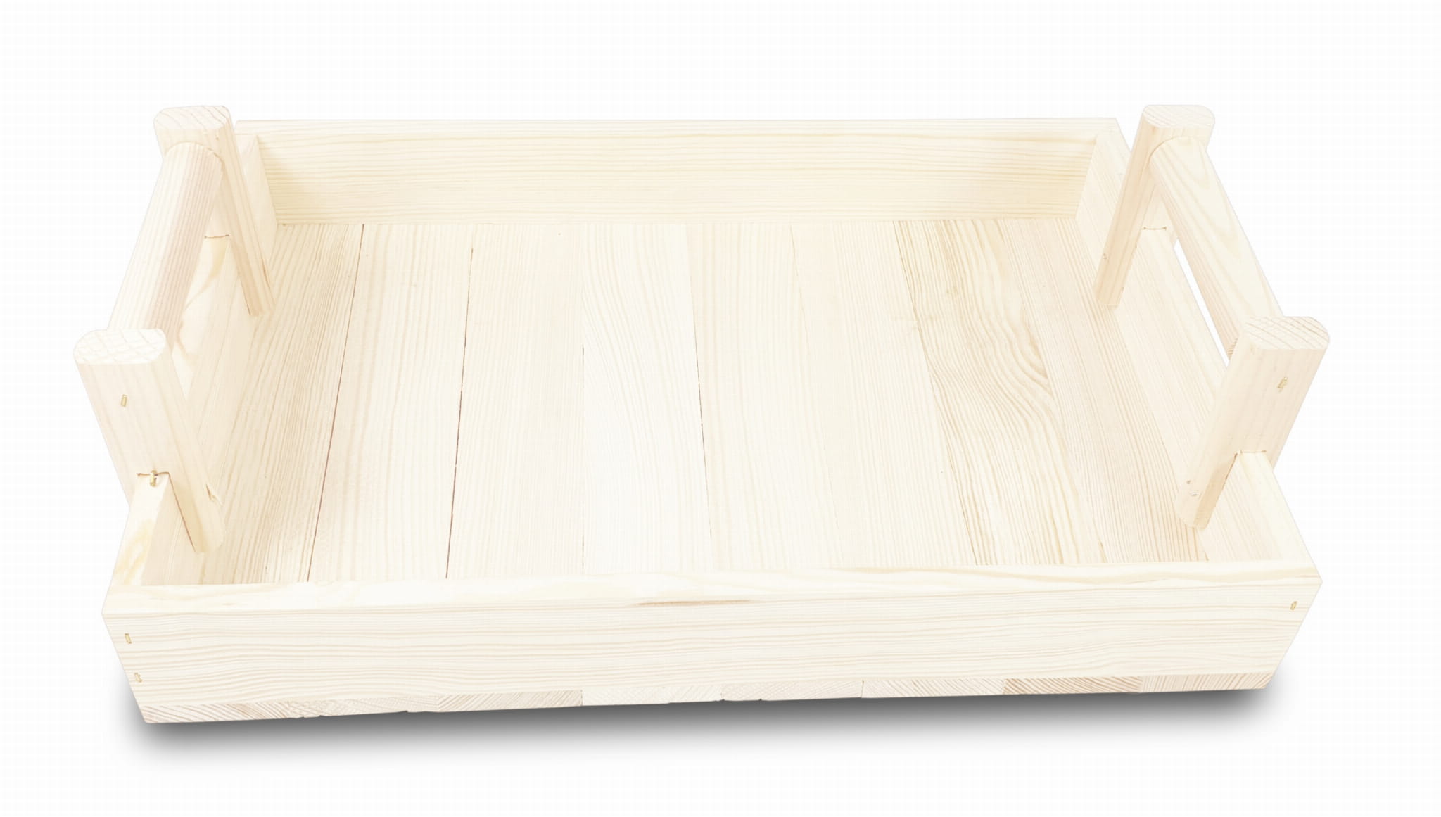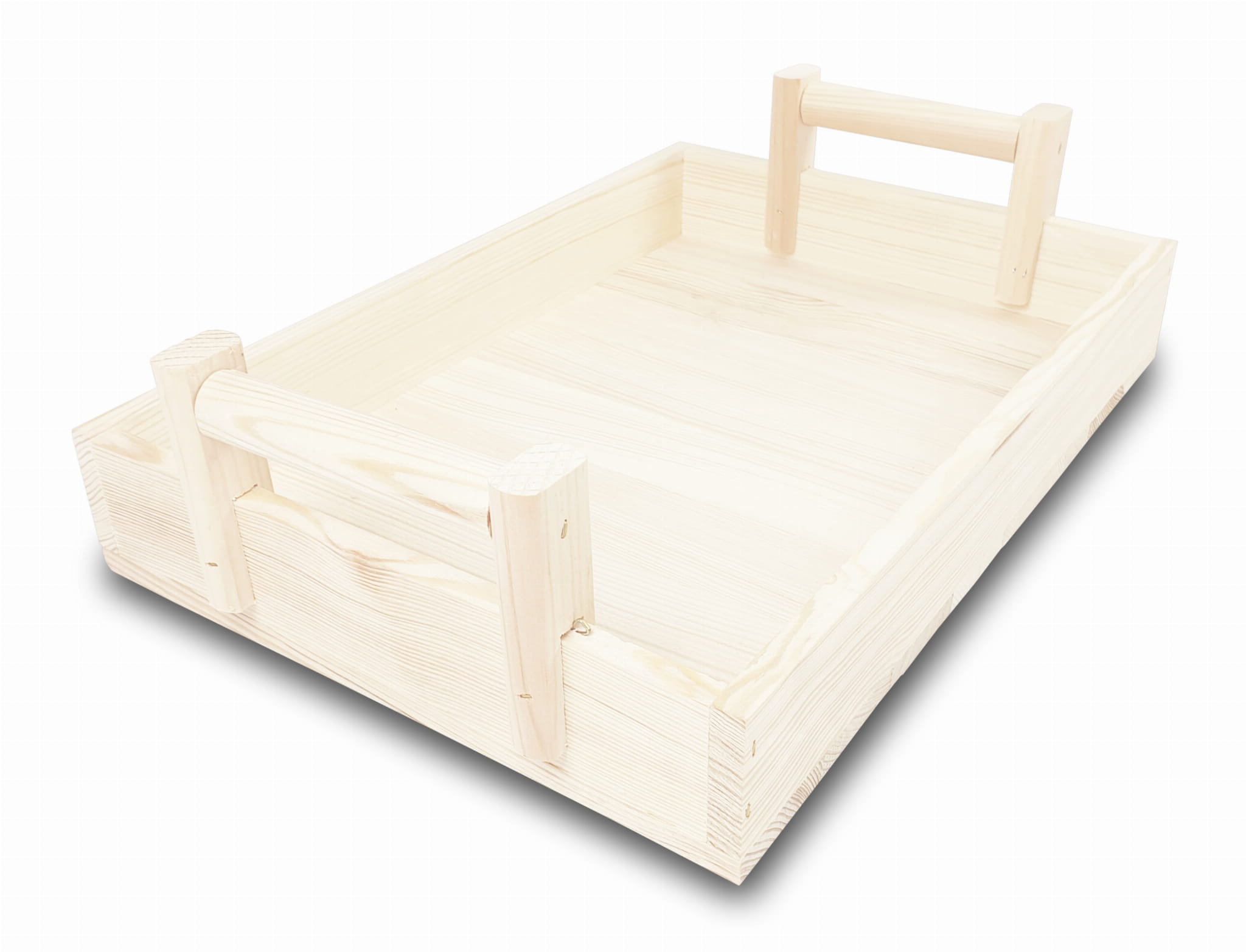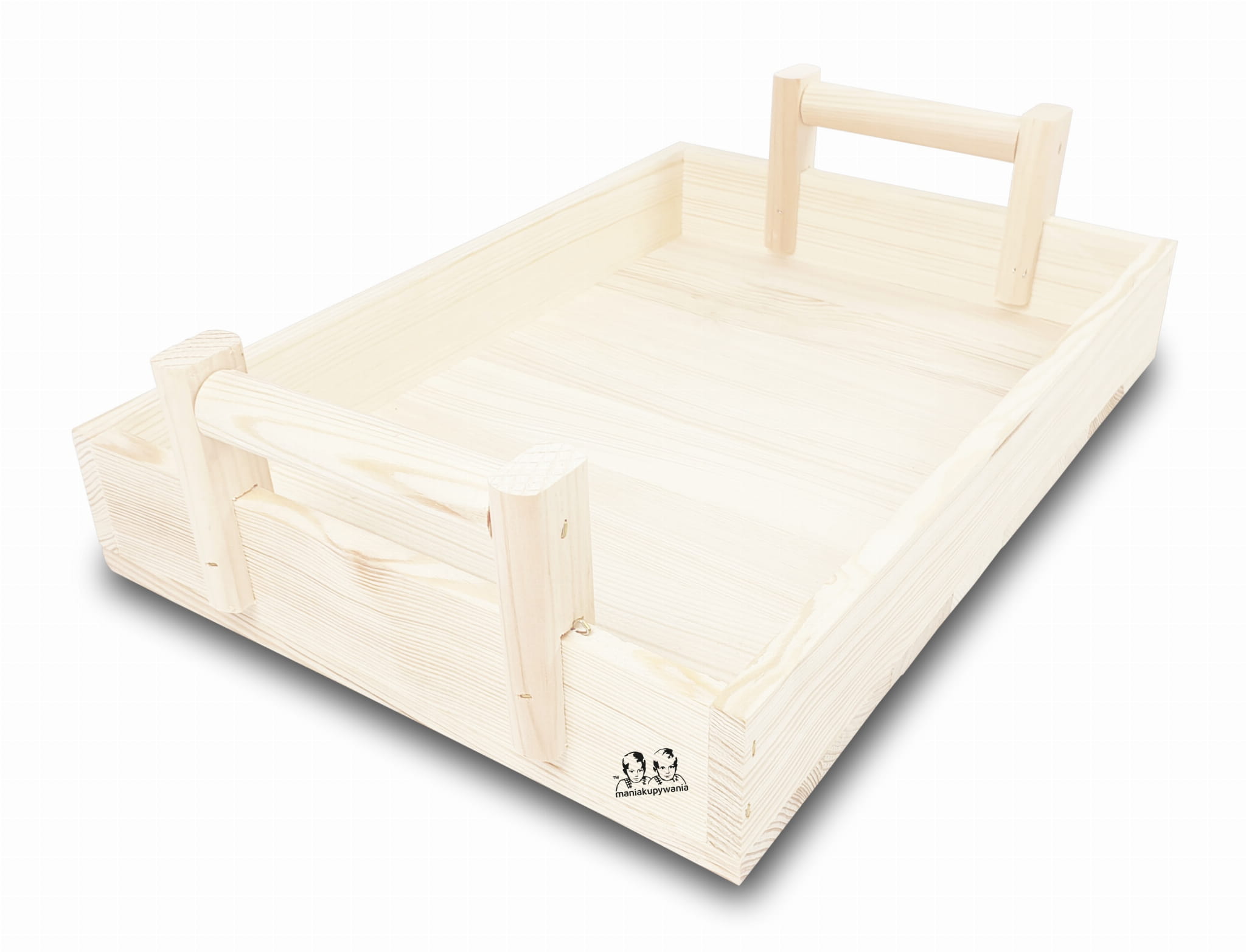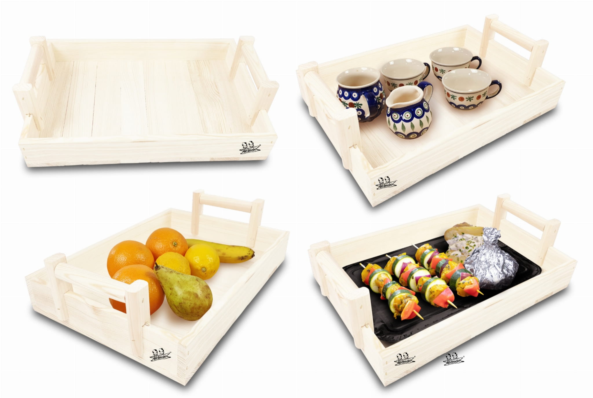 Taca posiada wygodne uchwyty. Drewniana konstrukcja gwarantuje wytrzymałość oraz łatwość przenoszenia nawet ciężkich produktów bez ryzyka utraty stabilności czy ryzyka przewrócenia znajdujących się na niej produktów. Wszystko to jest możliwe dzięki zastosowaniu bocznych ścianek o wysokości 6cm.