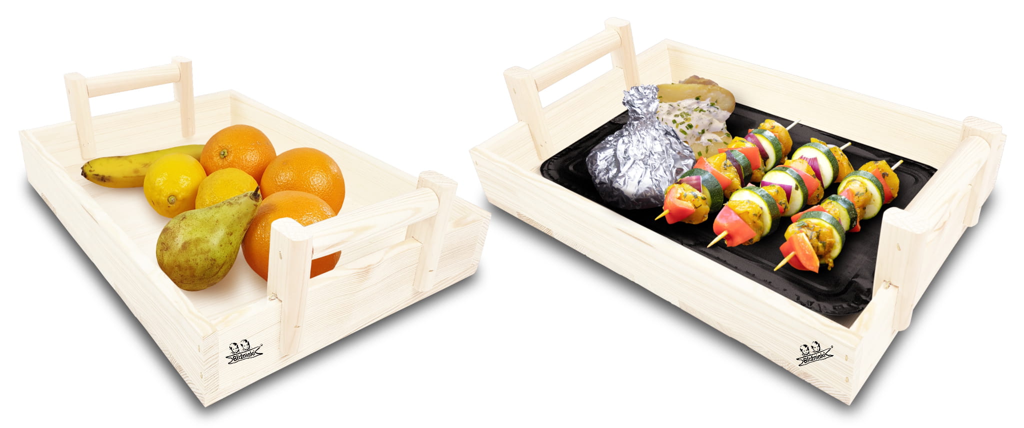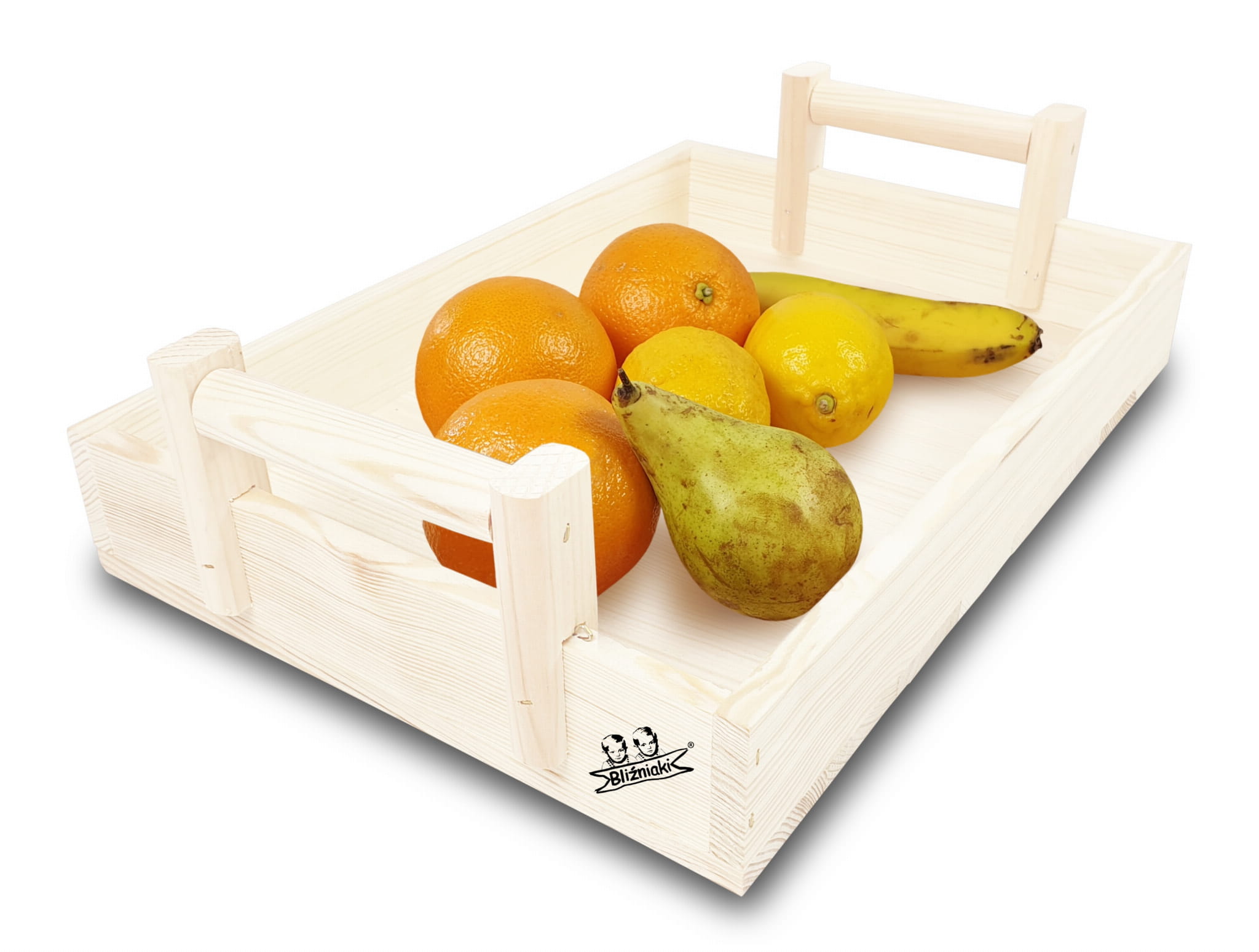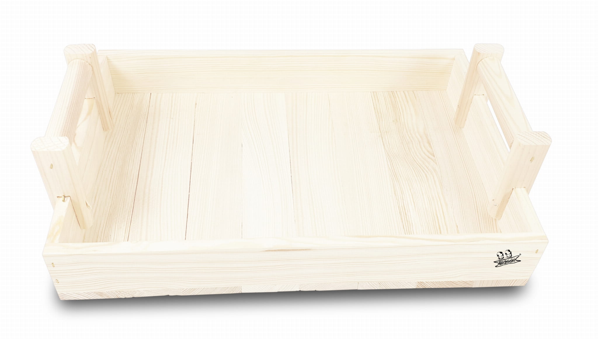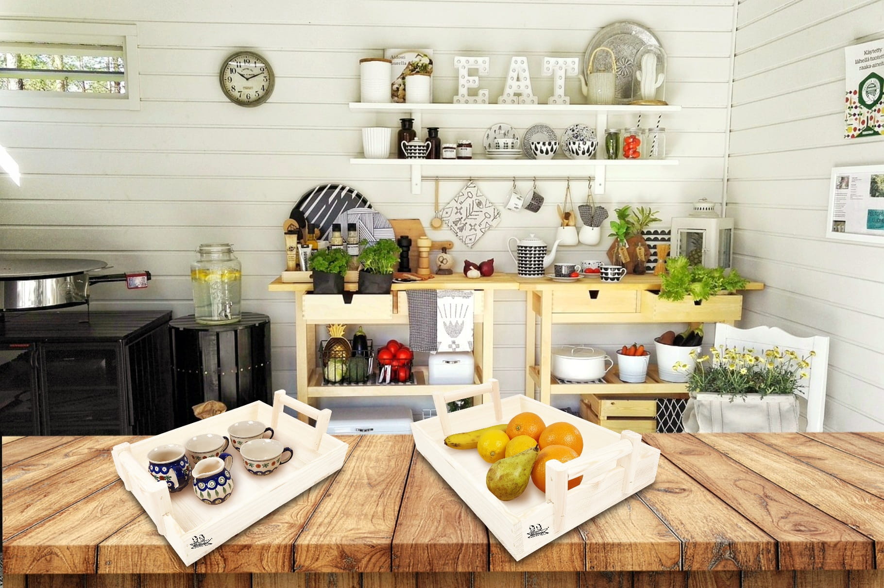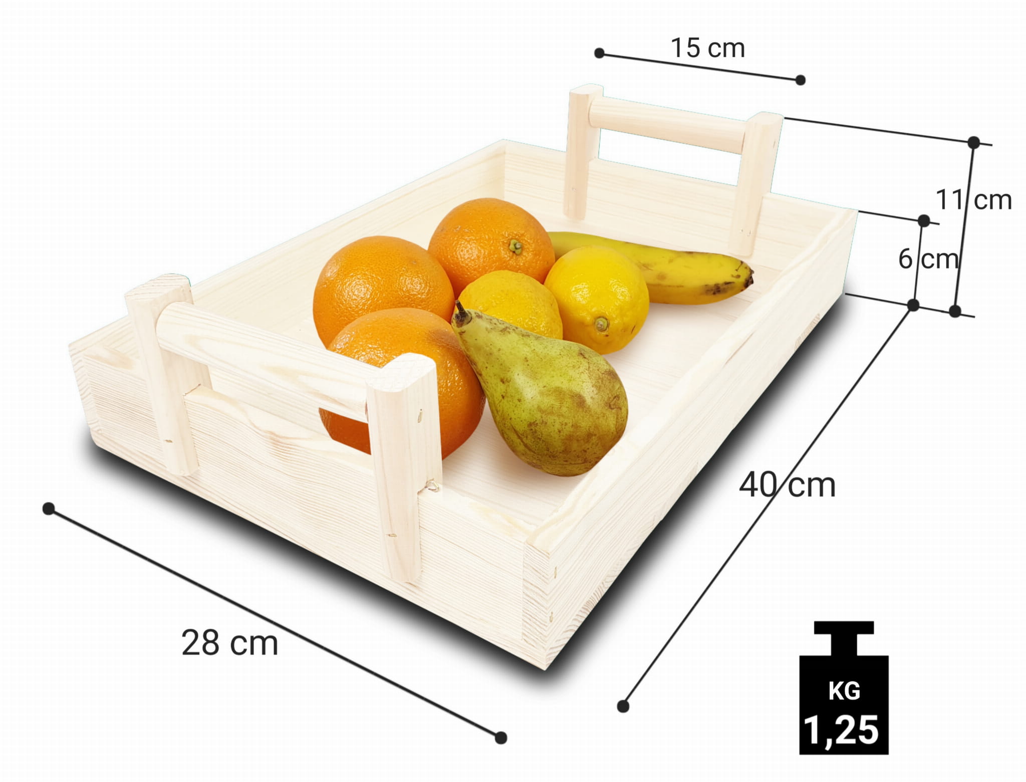 Taca posiada wygodne uchwyty. Drewniana konstrukcja gwarantuje wytrzymałość oraz łatwość przenoszenia nawet ciężkich produktów bez ryzyka utraty stabilności czy ryzyka przewrócenia znajdujących się na niej produktów. Wszystko to jest możliwe dzięki zastosowaniu bocznych ścianek o wysokości 6cm.
