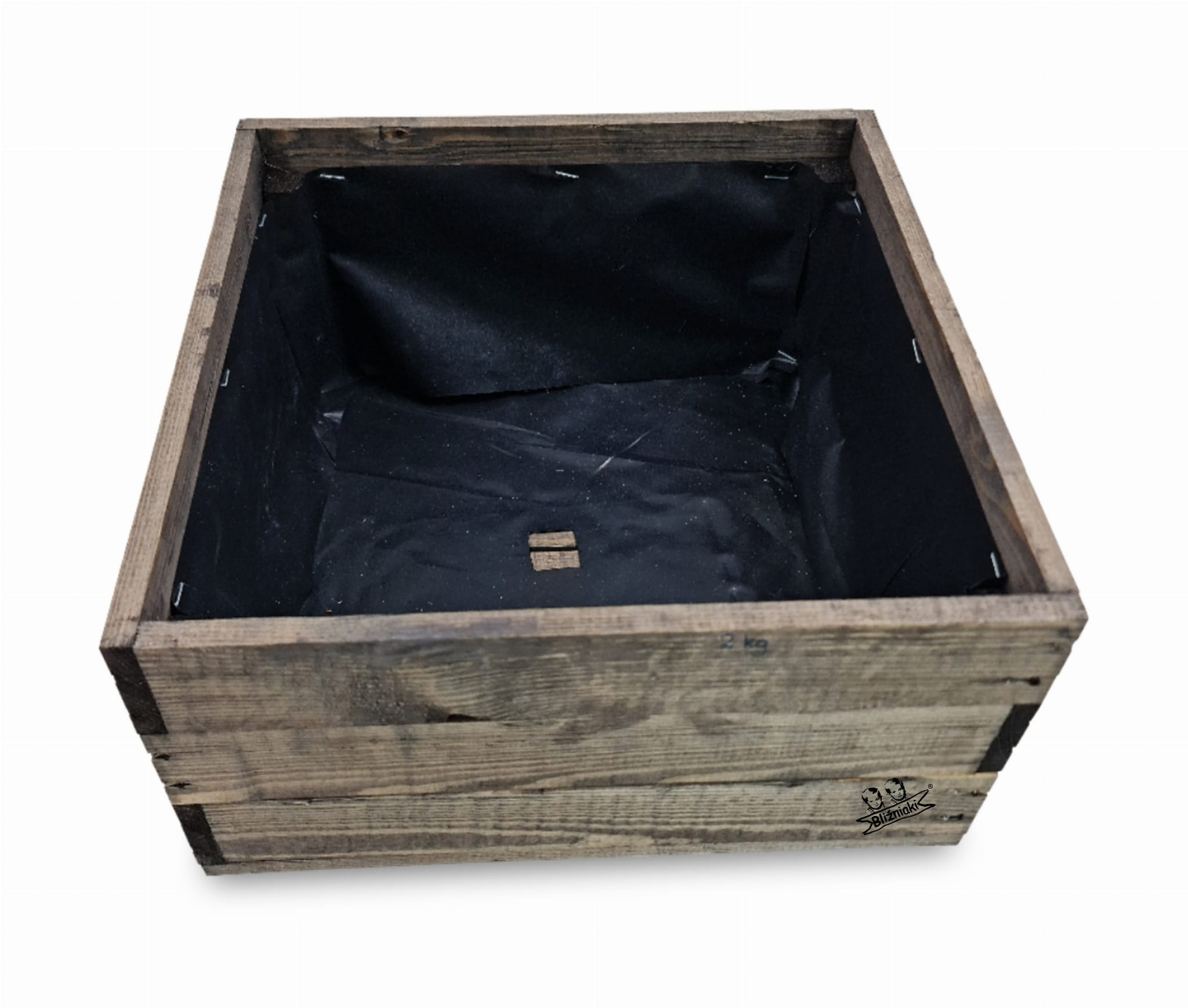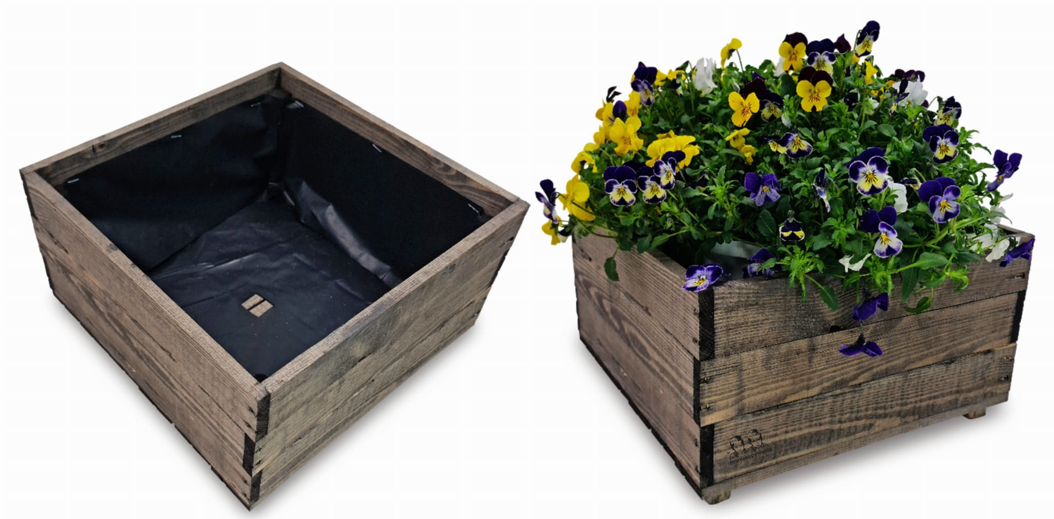 Folia znajdująca się w donicy chroni drewno i utrzymuje wilgoć podłoża.