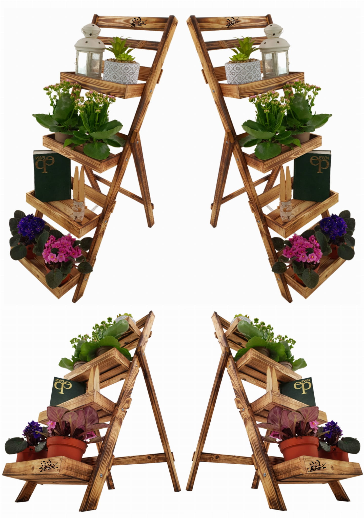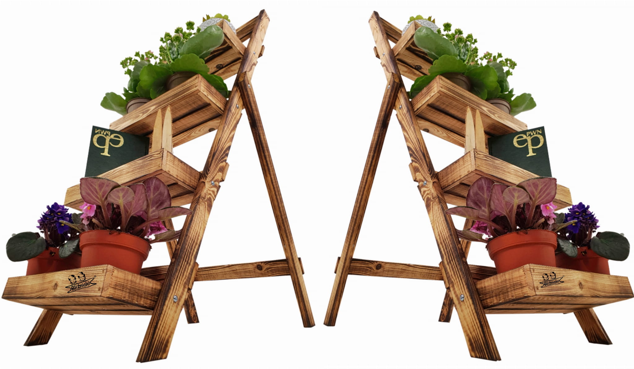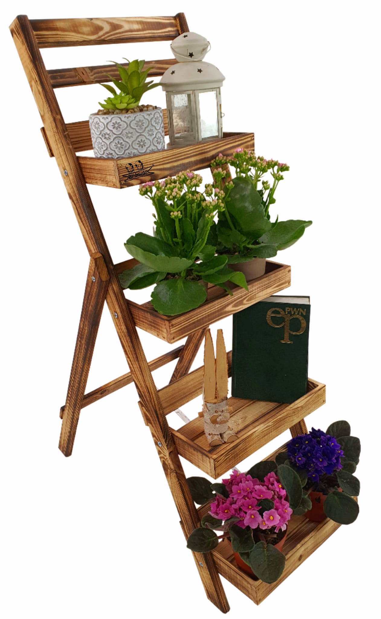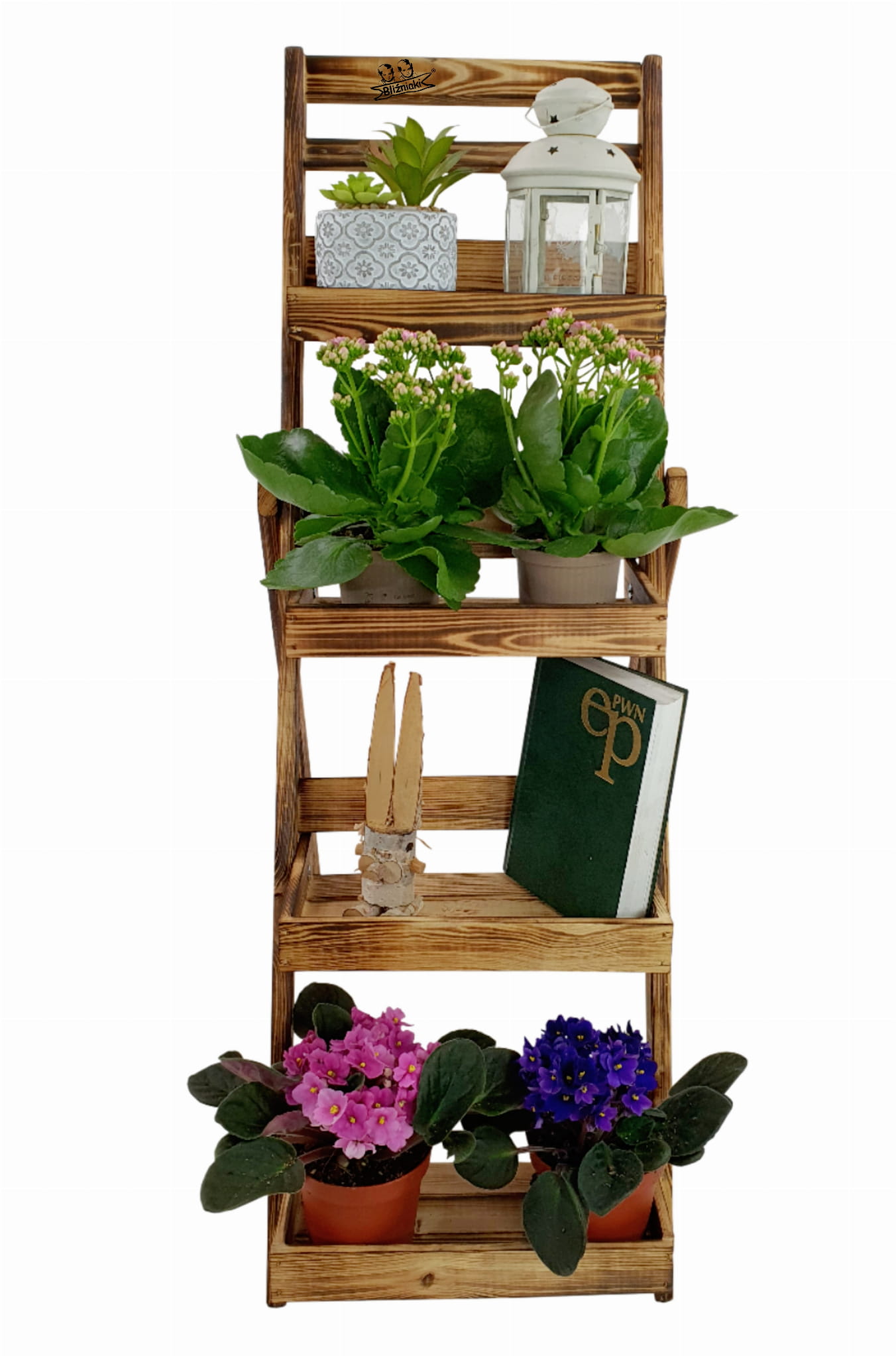 4 Piętrowa Drabinka Kwietnik Stojak Drewniany Opalany z Czterema Półkami Organizer na Przedmioty Codziennego Użytku do Domu i Ogrodu (DKW22 OPAL)
