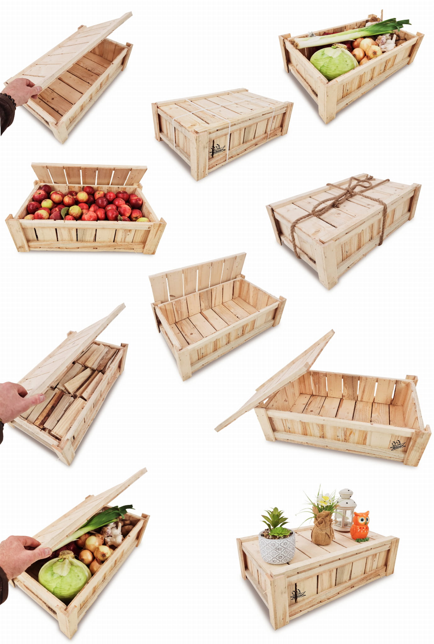 Nasza stylowa i trwała skrzynia z naturalnego drewna sosnowego pełni uniwersalną rolę i świetnie sprawdzi się jako multifunkcyjny pojemnik, w którym można przechowywać wszelkiego rodzaju przedmioty codziennego użytku, żywność, kwiaty, zabawki, narzędzia czy przetwory. Może być wykorzystana jako podręczy stolik.