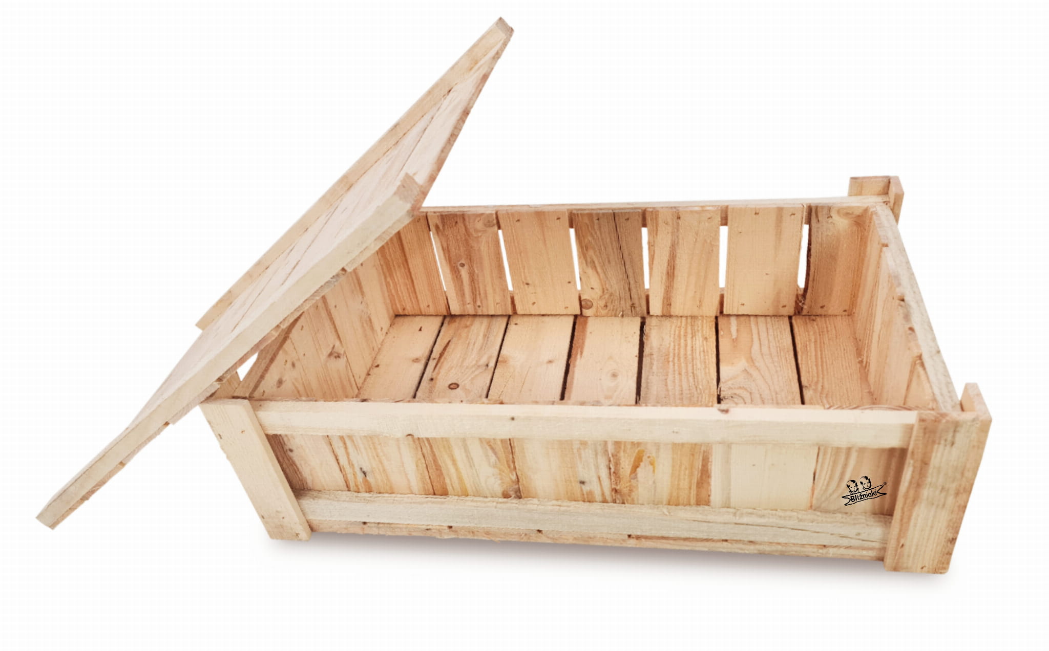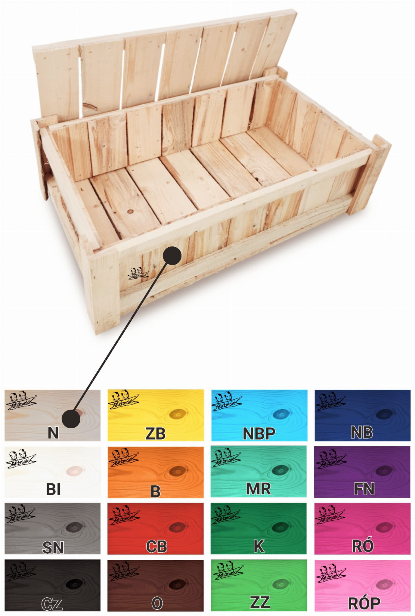 Skrzynia wyposażona jest w drewnianą pokrywę zabezpieczającą wnętrze konstrukcji oraz przedmiotów w niej umieszczonych przed szkodliwym wpływem wilgoci i promieni słonecznych.