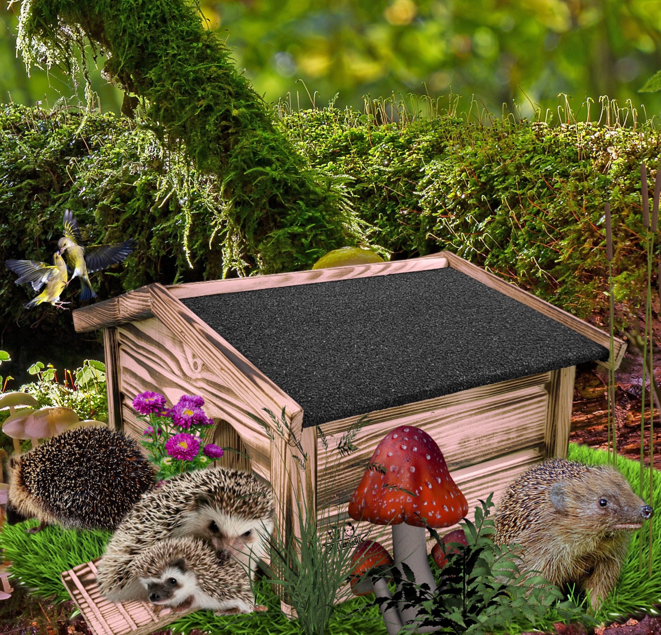 Odporny na warunki atmosferyczne sprawi, że przez cały rok będzie schronieniem dla jeża i jeżowej rodziny w ogrodzie. Dach został pokryty warstwą bitumiczną dzięki której zyskuje ocieplenie , estetyczny wyglądu i dopasowanie do architektury ogrodowej takiej jak pokryte dachem bitumicznym domy, ganki, tarasy, altany, wiaty.