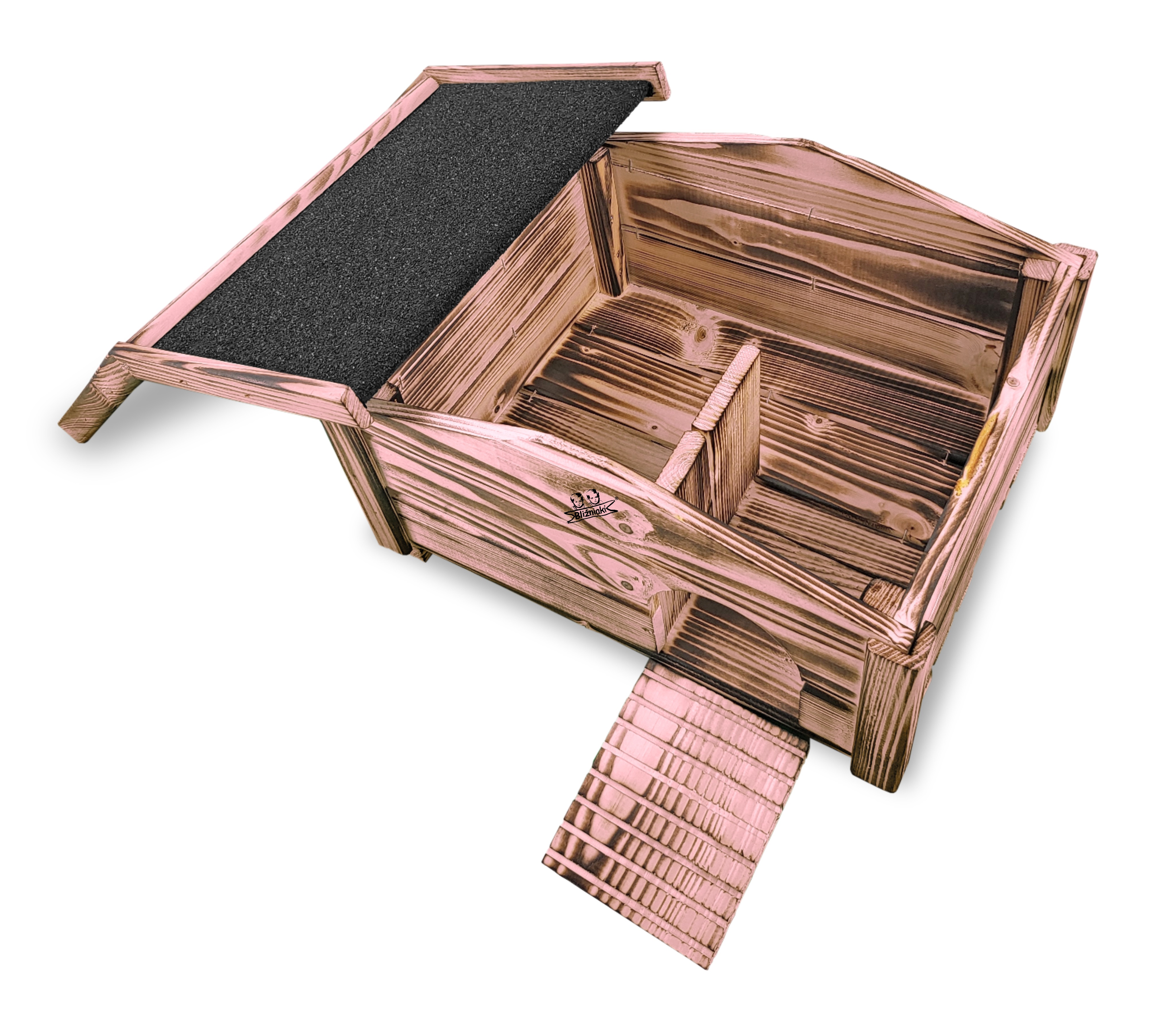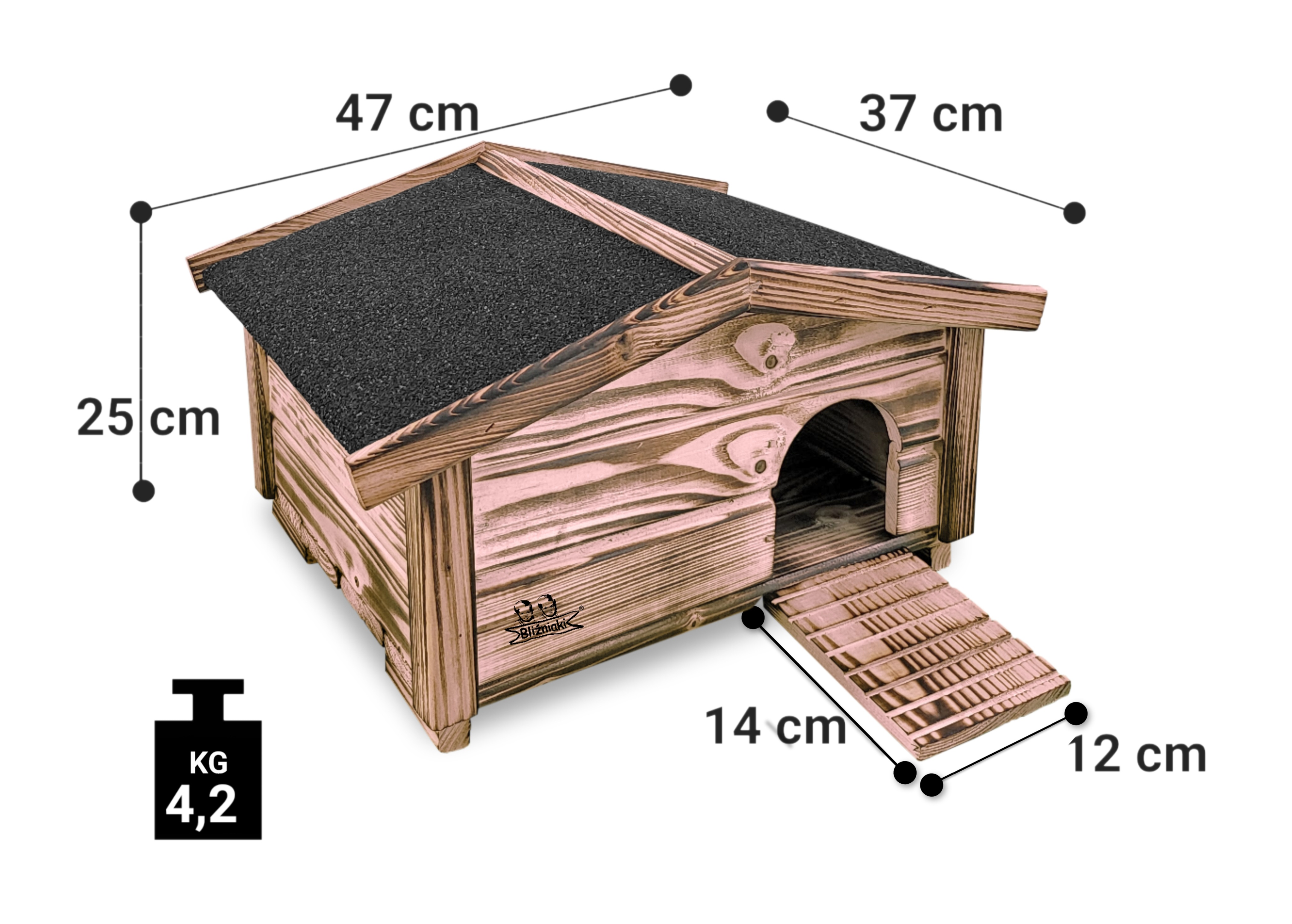 Konstrukcja domku jest stabilna, zdejmowany dwuspadowy dach ułatwi czyszczenie wnętrza budki a do środka prowadzi podest ryflowane schodki, ponadto kryta podłoga odizolowuje jeże od mokrego i zimnego podłoża co czyni ten domek komfortowym siedziskiem do lęgu małych jeżyków.