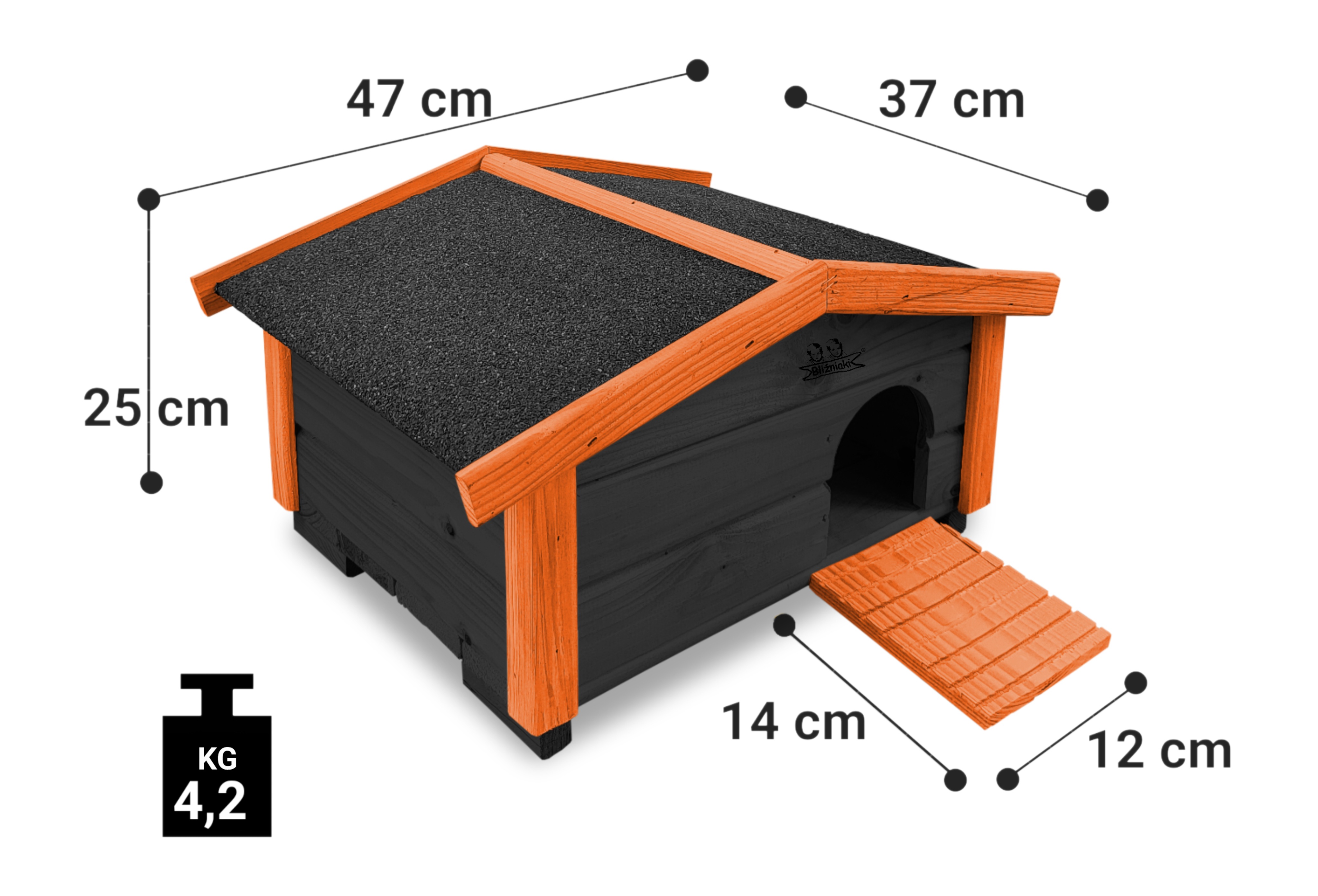 Konstrukcja domku jest stabilna, zdejmowany dwuspadowy dach ułatwi czyszczenie wnętrza budki a do środka prowadzi podest ryflowane schodki, ponadto kryta podłoga odizolowuje jeże od mokrego i zimnego podłoża co czyni ten domek komfortowym siedziskiem do lęgu małych jeżyków.