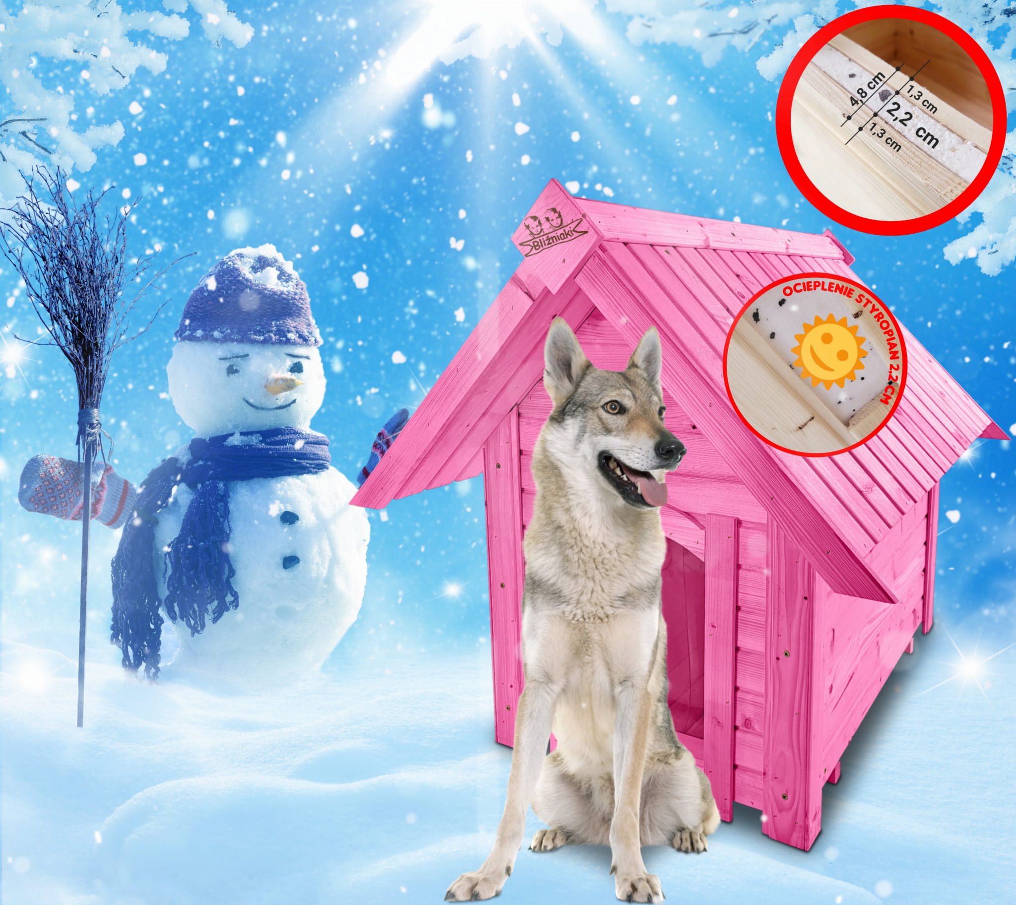 - Domek OCIEPLONY JEST STYROPIANEM O GRUBOŚCI 2,2CM co zapewnia jeszcze większy komfort przebywania w środku : latem - izoluje przed przegrzaniem a zimą chroni przed utratą ciepła, jest to buda całoroczna dla Psów