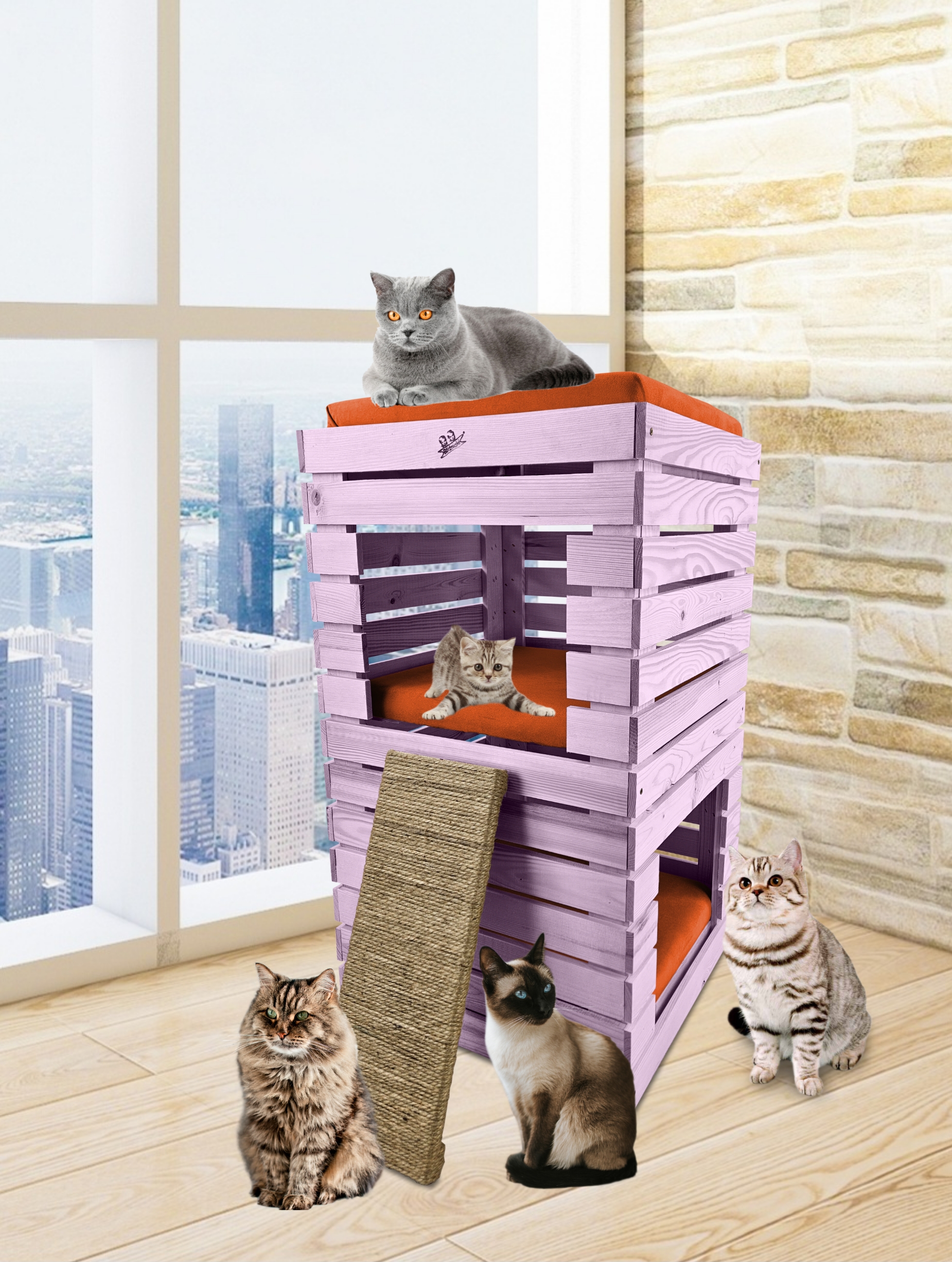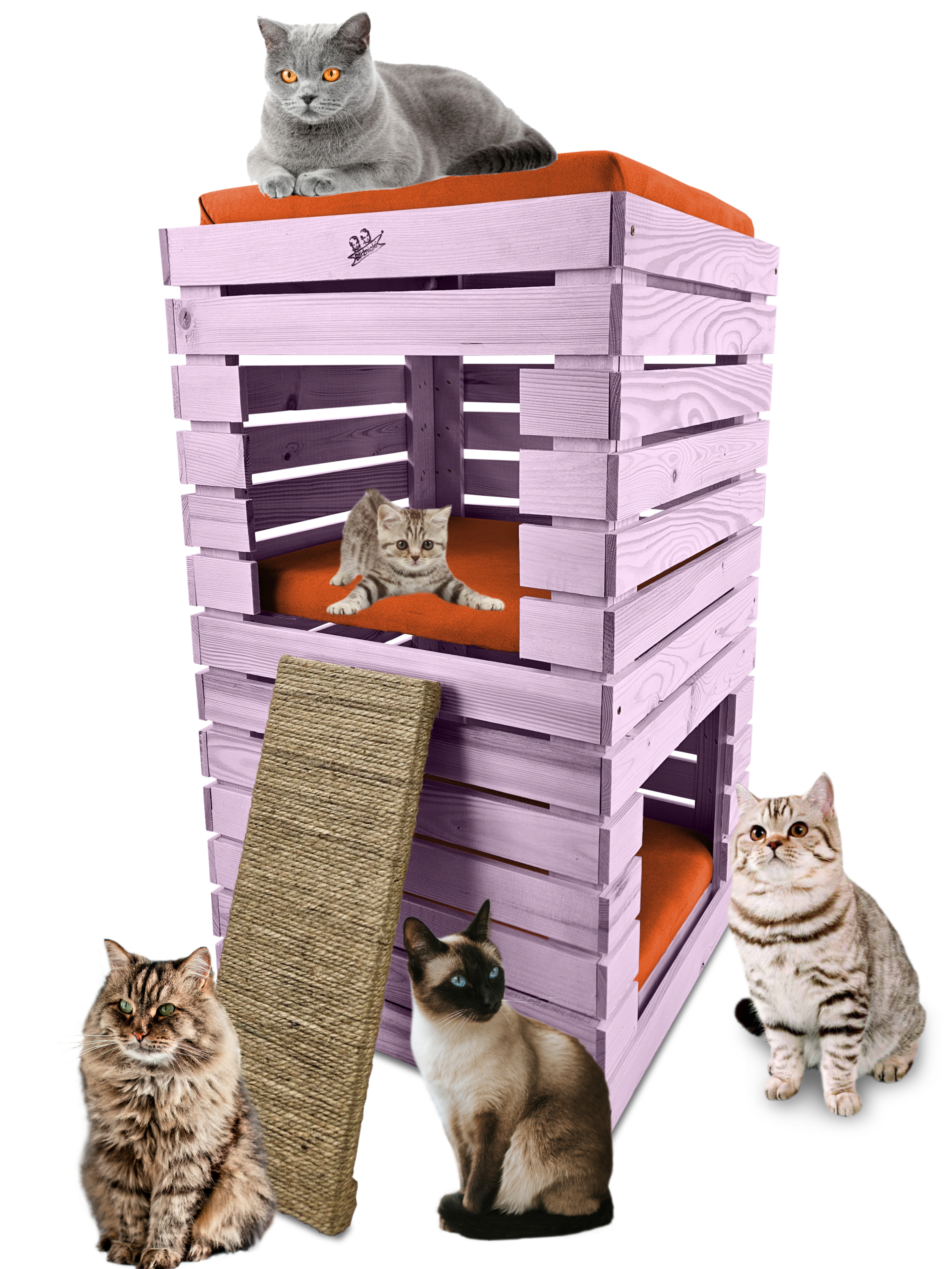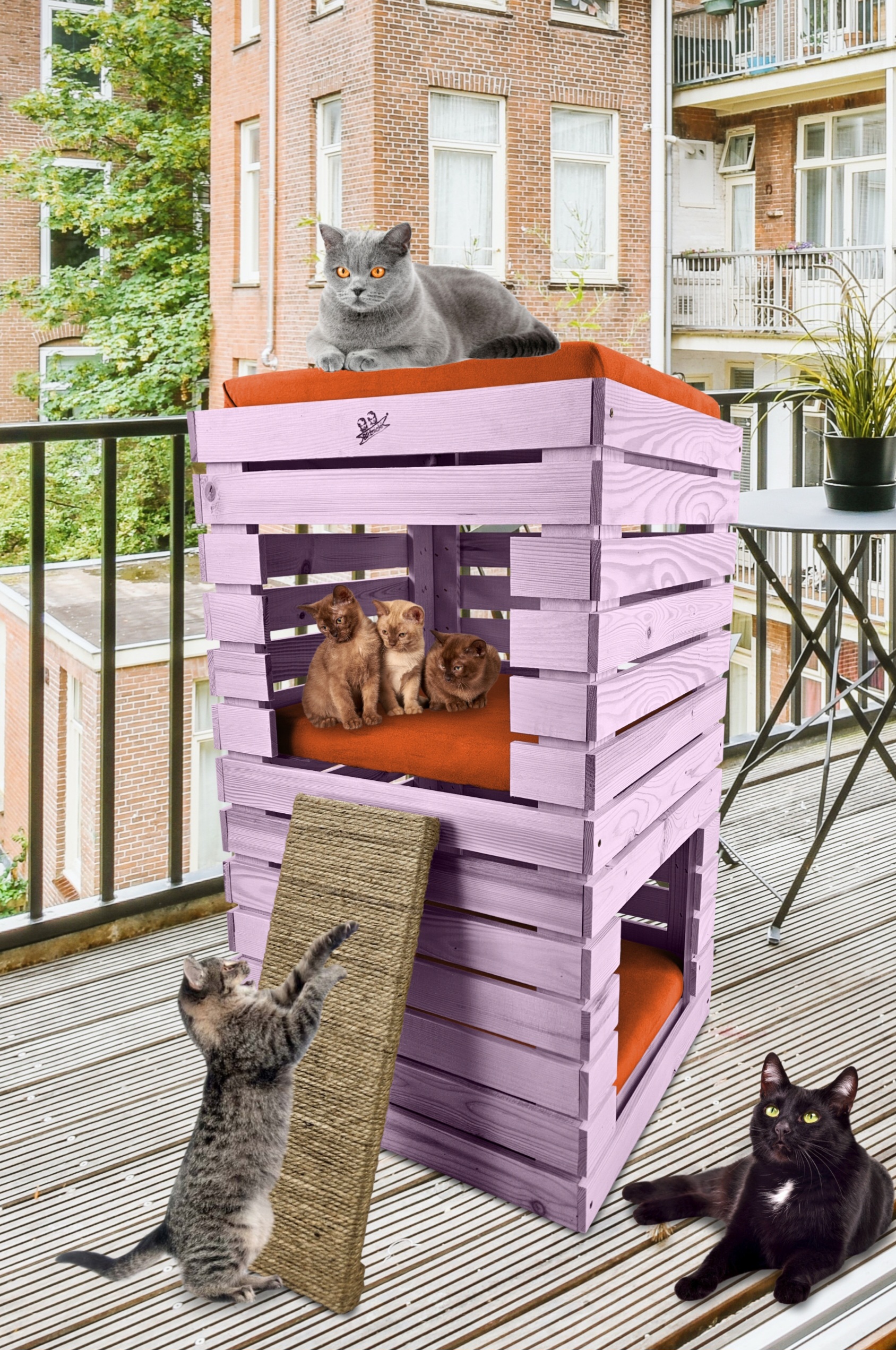 Trzy niezależne legowiska to rozwiązanie, które gwarantuje każdemu kotu prywatność i wygodę. Konstrukcja domku pozwala na przebywanie w nim kilku kotów na trzech poziomach.