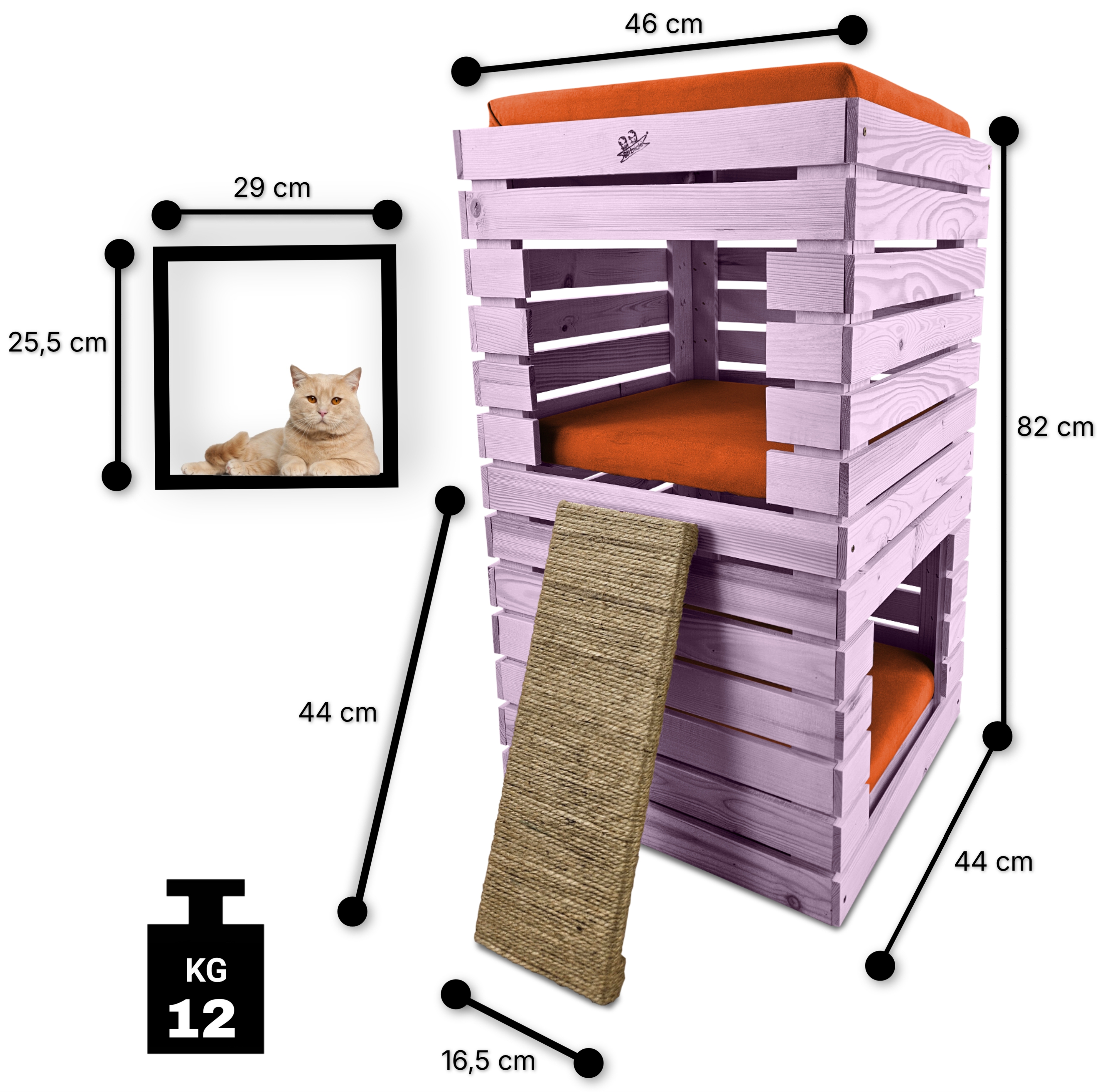Budka, wykonana w całości z drewna, zachwyca swoją estetyką i naturalnością. Kolor JASNOFIOLETOWY harmonijnie współgra z posłaniem w kolorze POMARAŃCZOWYM tworząc kompozycję, która pasuje zarówno do wnętrza mieszkania, jak i ogrodu.