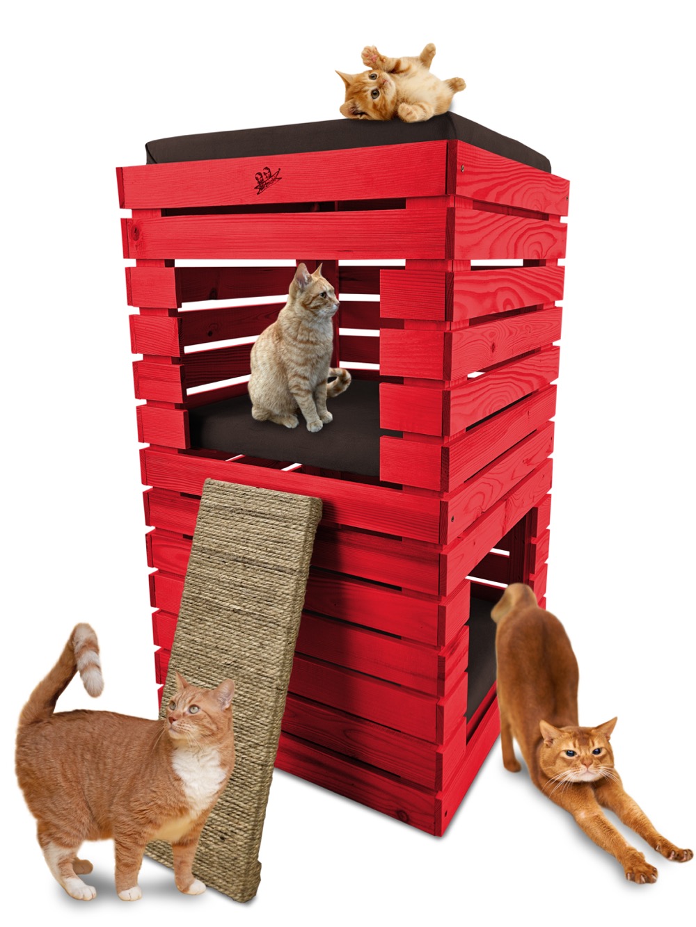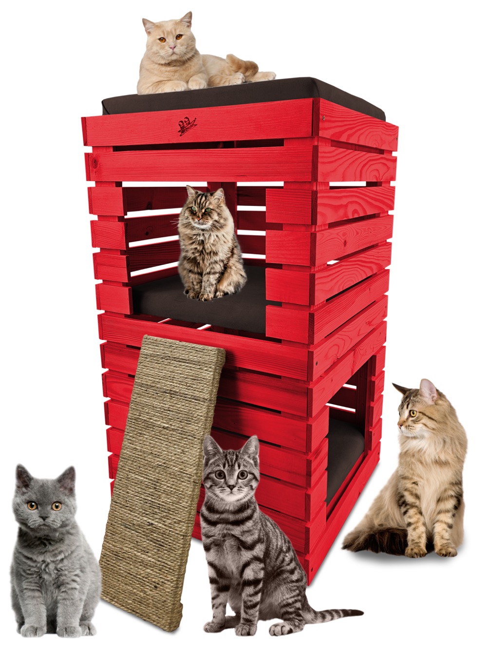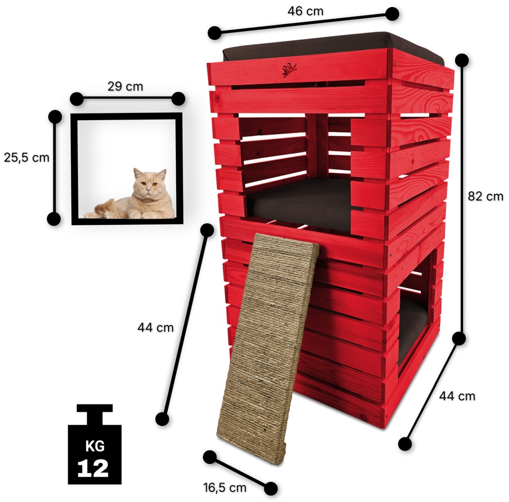 Trzy niezależne legowiska to rozwiązanie, które gwarantuje każdemu kotu prywatność i wygodę. Konstrukcja domku pozwala na przebywanie w nim kilku kotów na trzech poziomach.