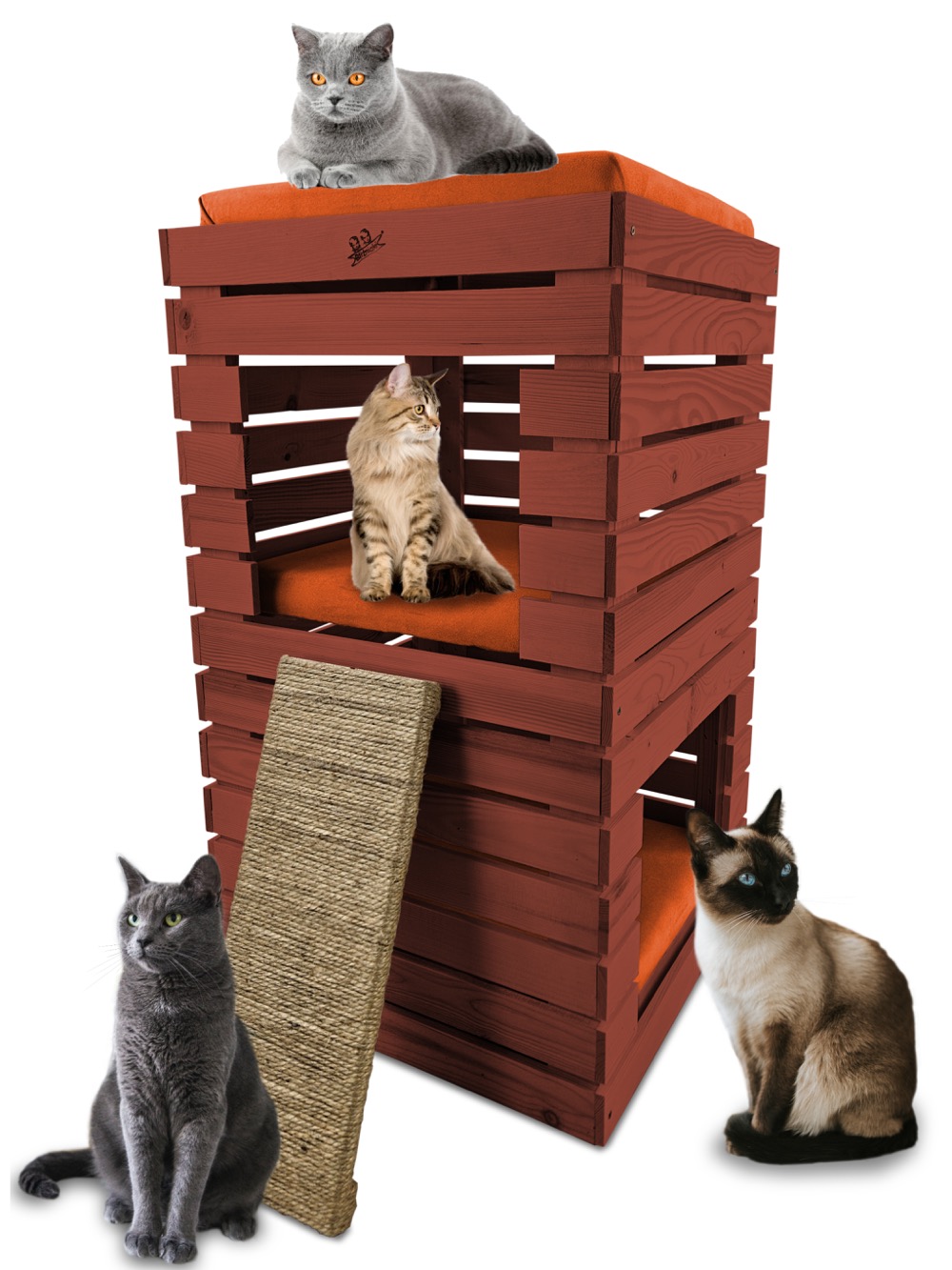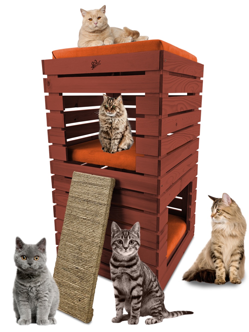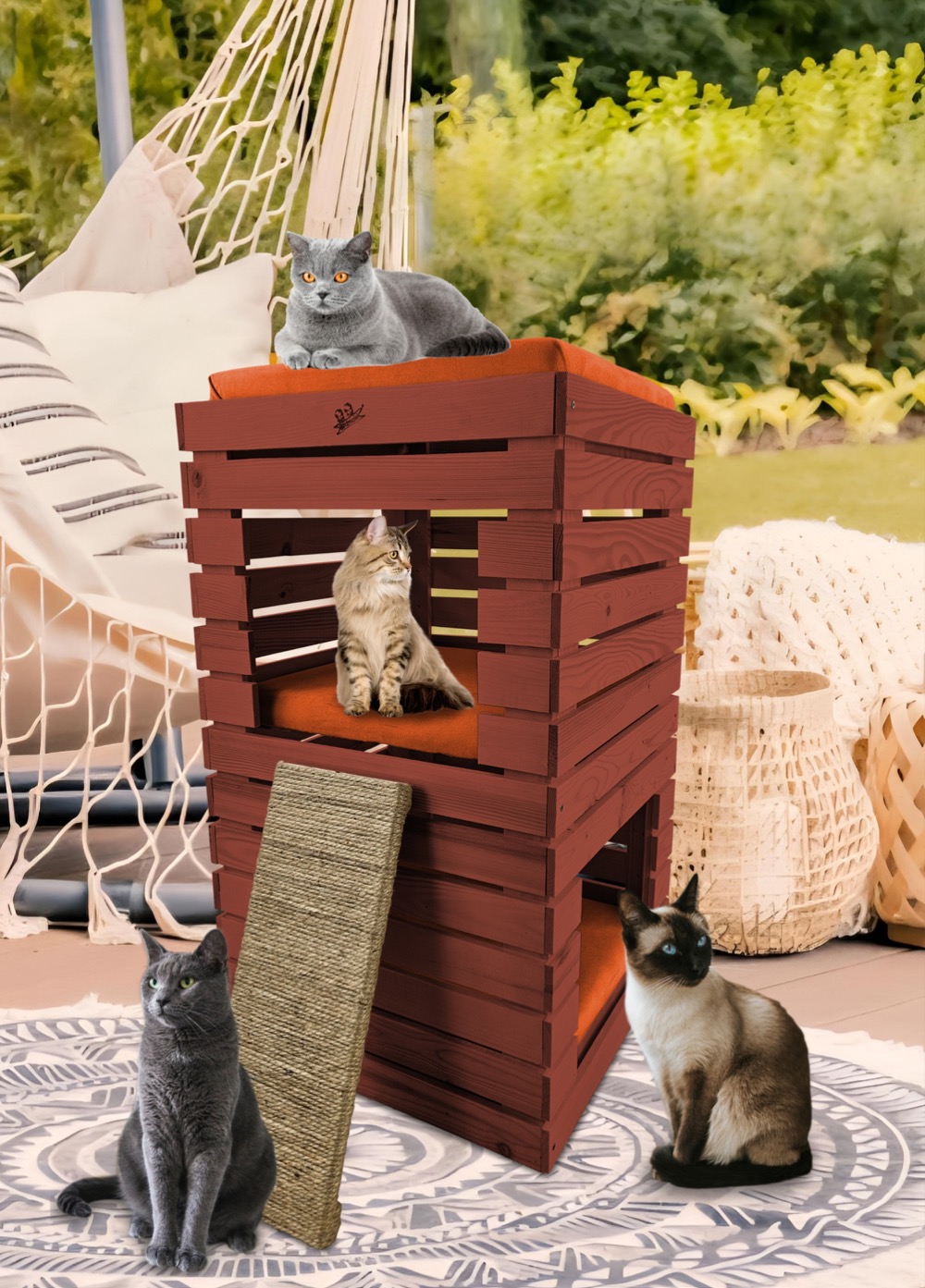 Trzy niezależne legowiska to rozwiązanie, które gwarantuje każdemu kotu prywatność i wygodę. Konstrukcja domku pozwala na przebywanie w nim kilku kotów na trzech poziomach.