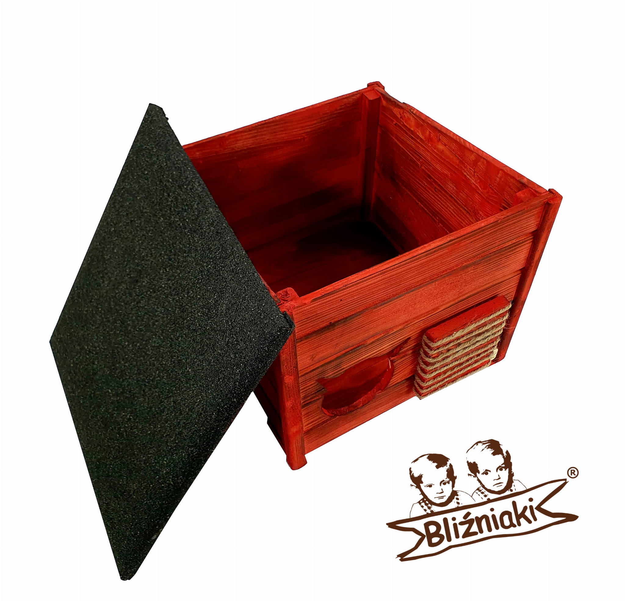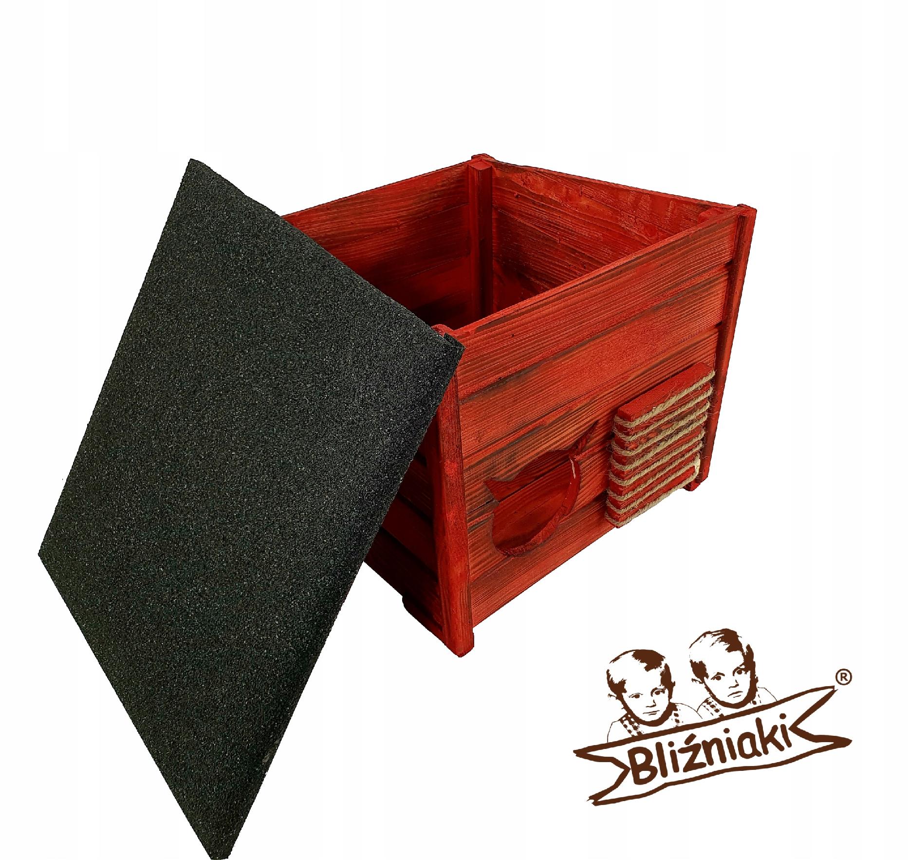 Budka, wykonana w całości z drewna, zachwyca swoją estetyką i naturalnością. OPALANE OGNIEM DREWNO, impregnowane kolorem CZERWONYM harmonijnie współgra z czarnym dachem pokrytym papą bitumiczną, tworząc kompozycję, która pasuje zarówno do wnętrza mieszkania, jak i ogrodu.