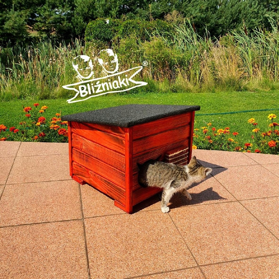 Nasz produkt został zaprojektowany w taki sposób, aby sprostać każdym warunkom atmosferycznym przez cały rok. Domek posiada dach kryty gontem bitumicznym, który zapobiega przeciekaniu wody. Daszek jest zdejmowany, co ułatwia czyszczenie wnętrza budki oraz wymianę legowiska. Drewniana podłoga na nóżkach idealnie izoluje od chłodnego podłoża i wilgoci, co jest istotne w przypadku domków umieszczonych na zewnątrz.