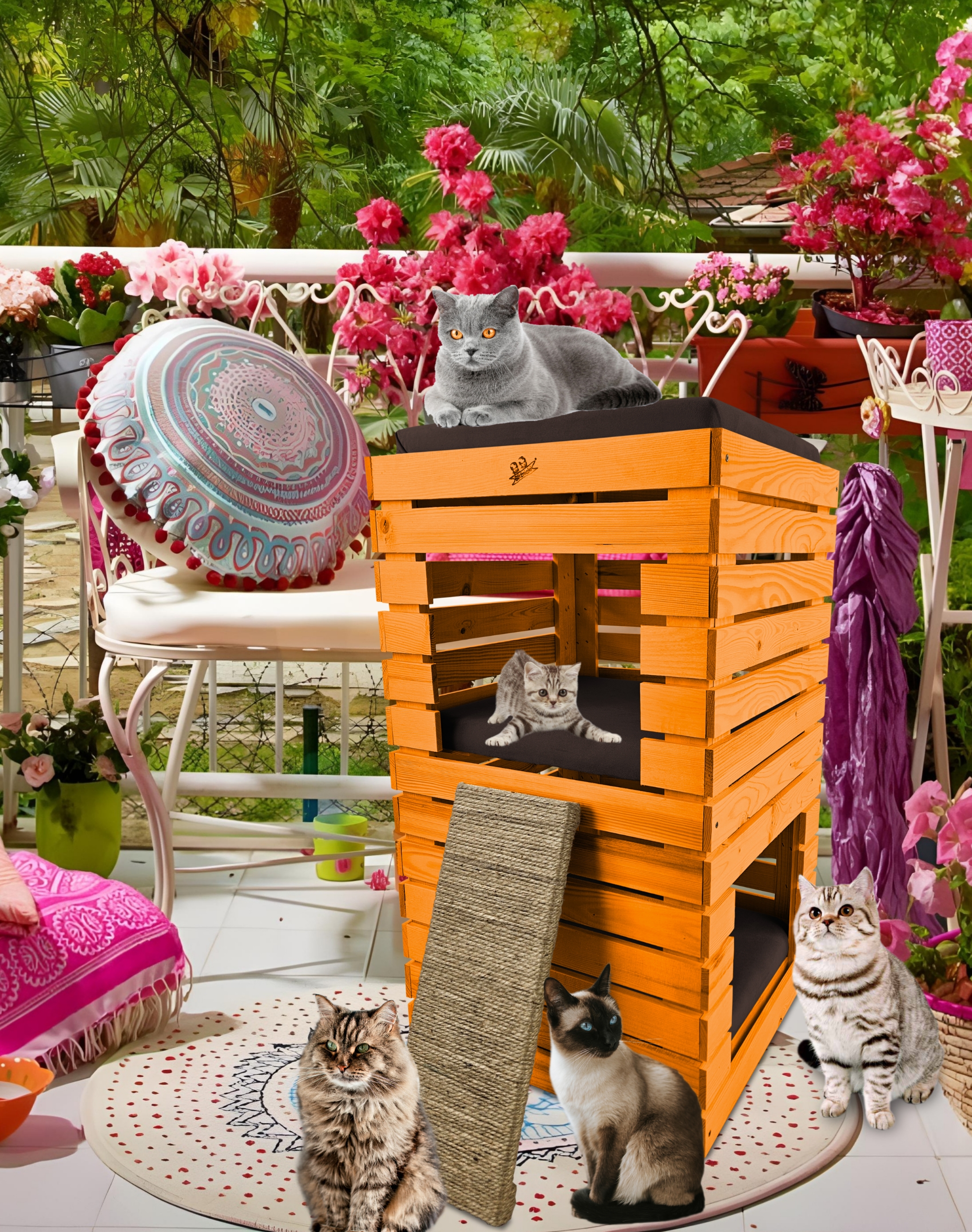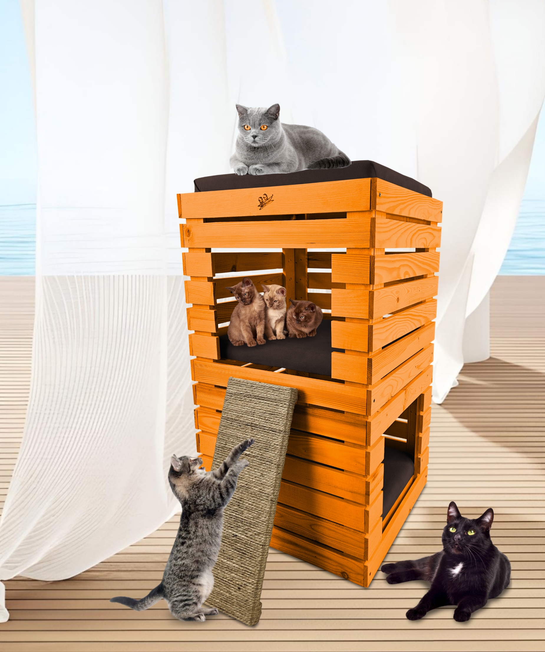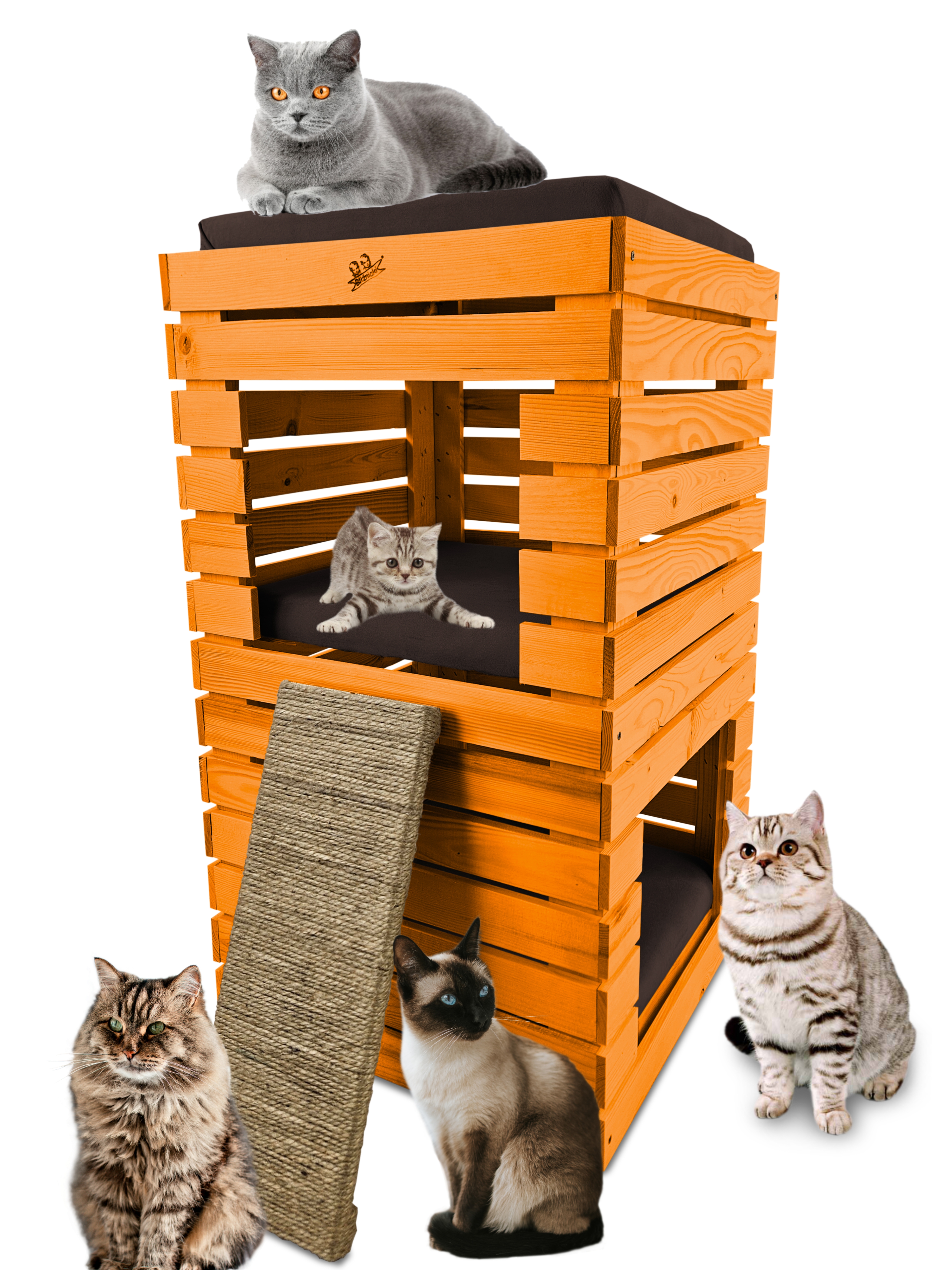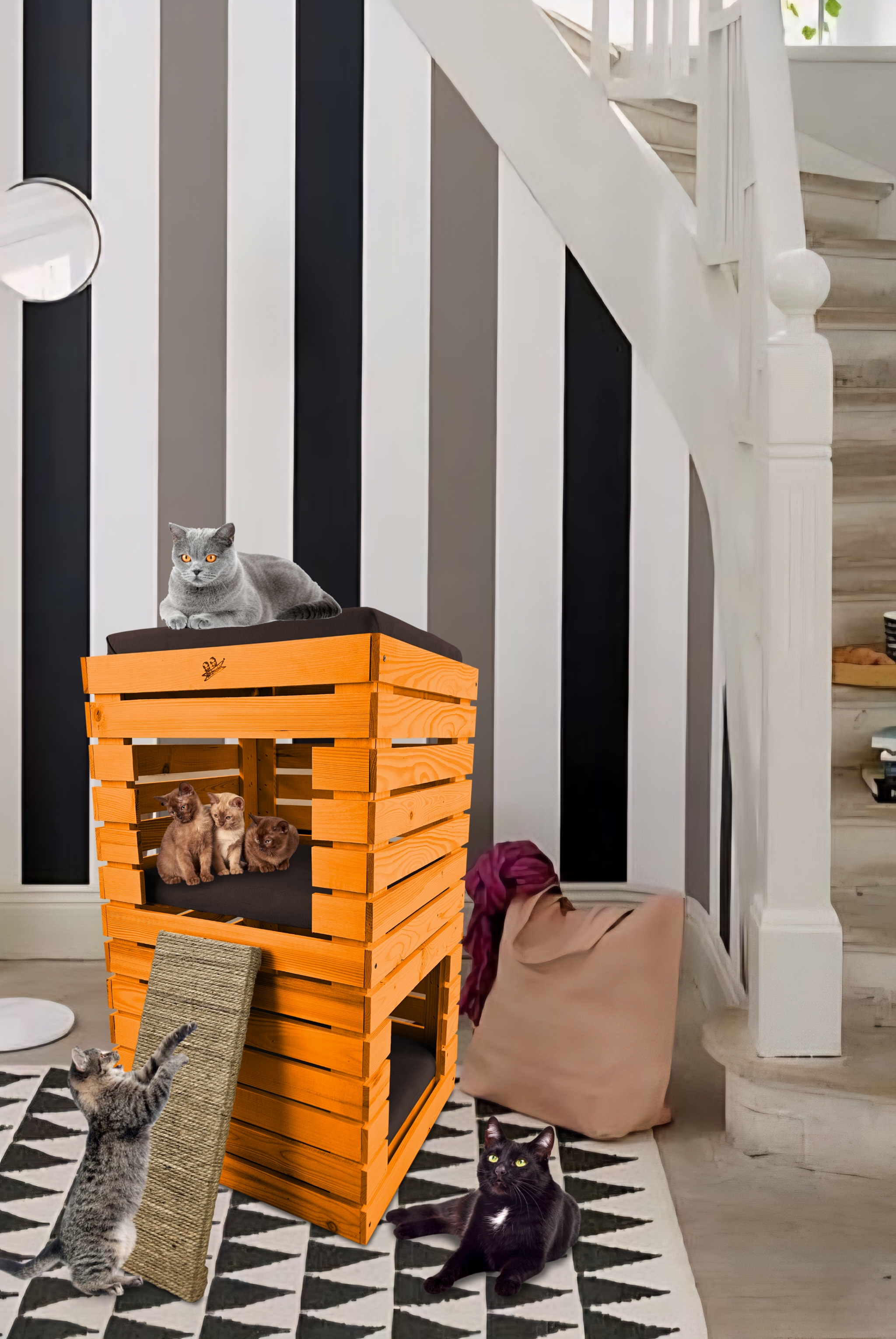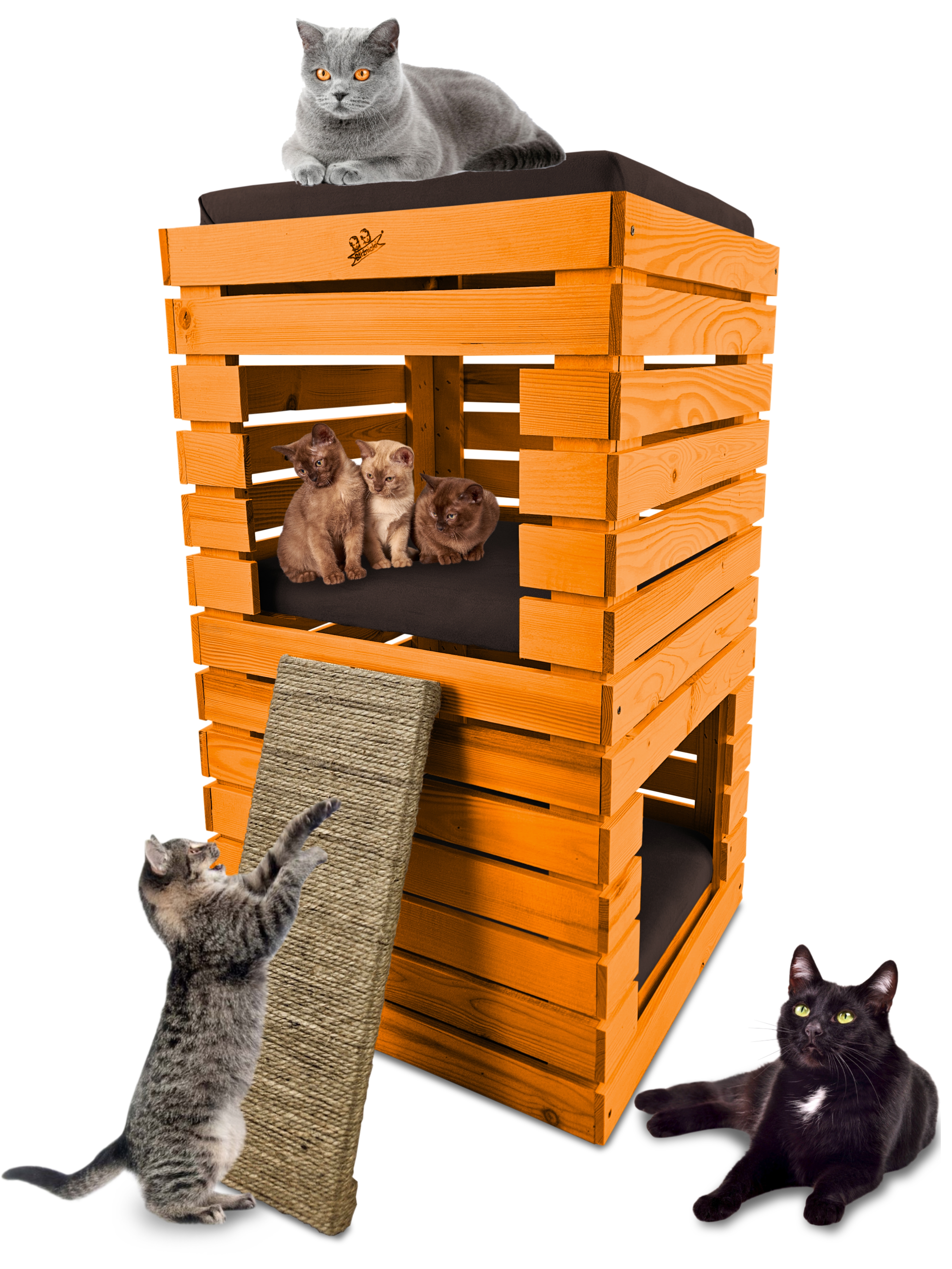 Trzy niezależne legowiska to rozwiązanie, które gwarantuje każdemu kotu prywatność i wygodę. Konstrukcja domku pozwala na przebywanie w nim kilku kotów na trzech poziomach.