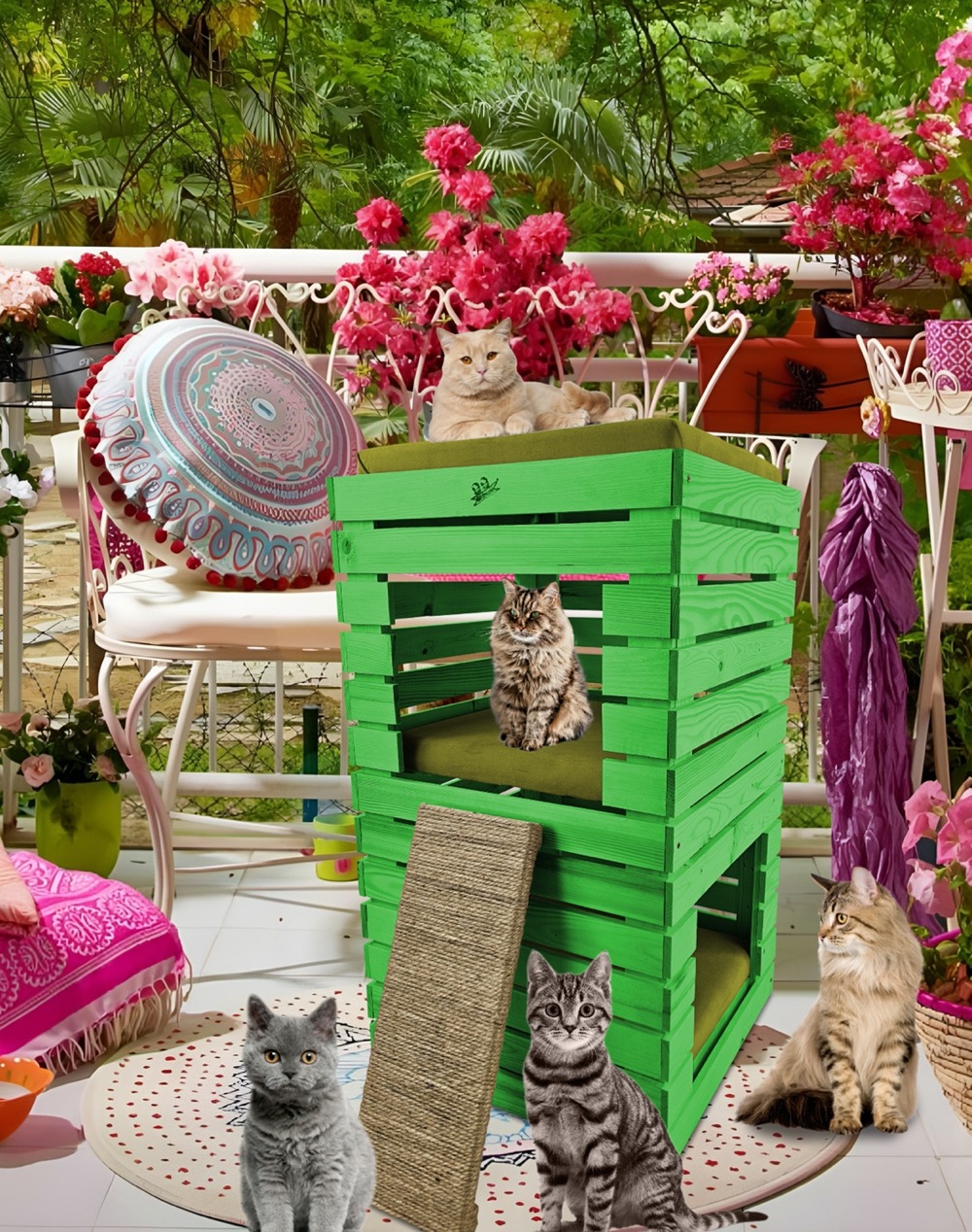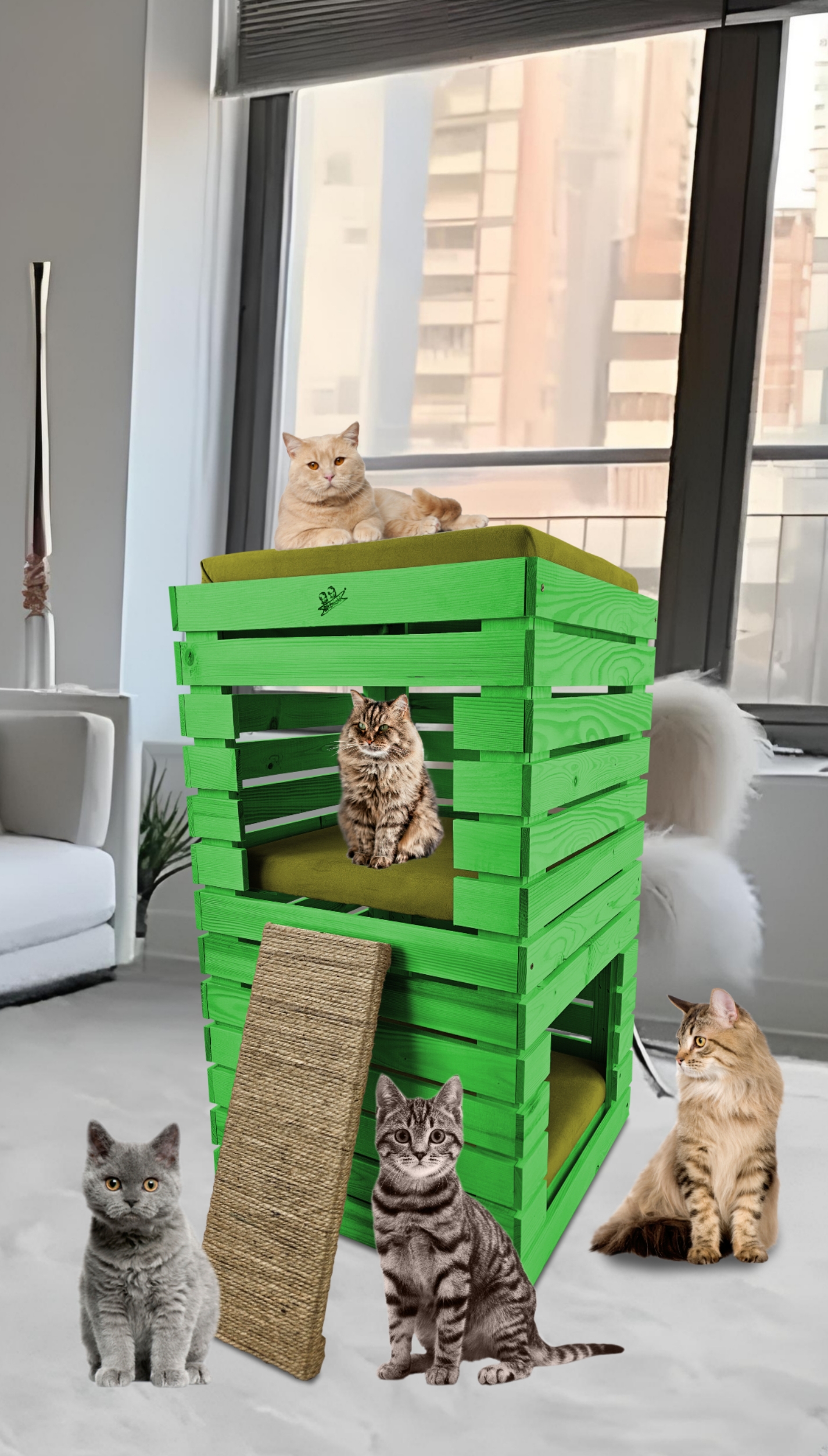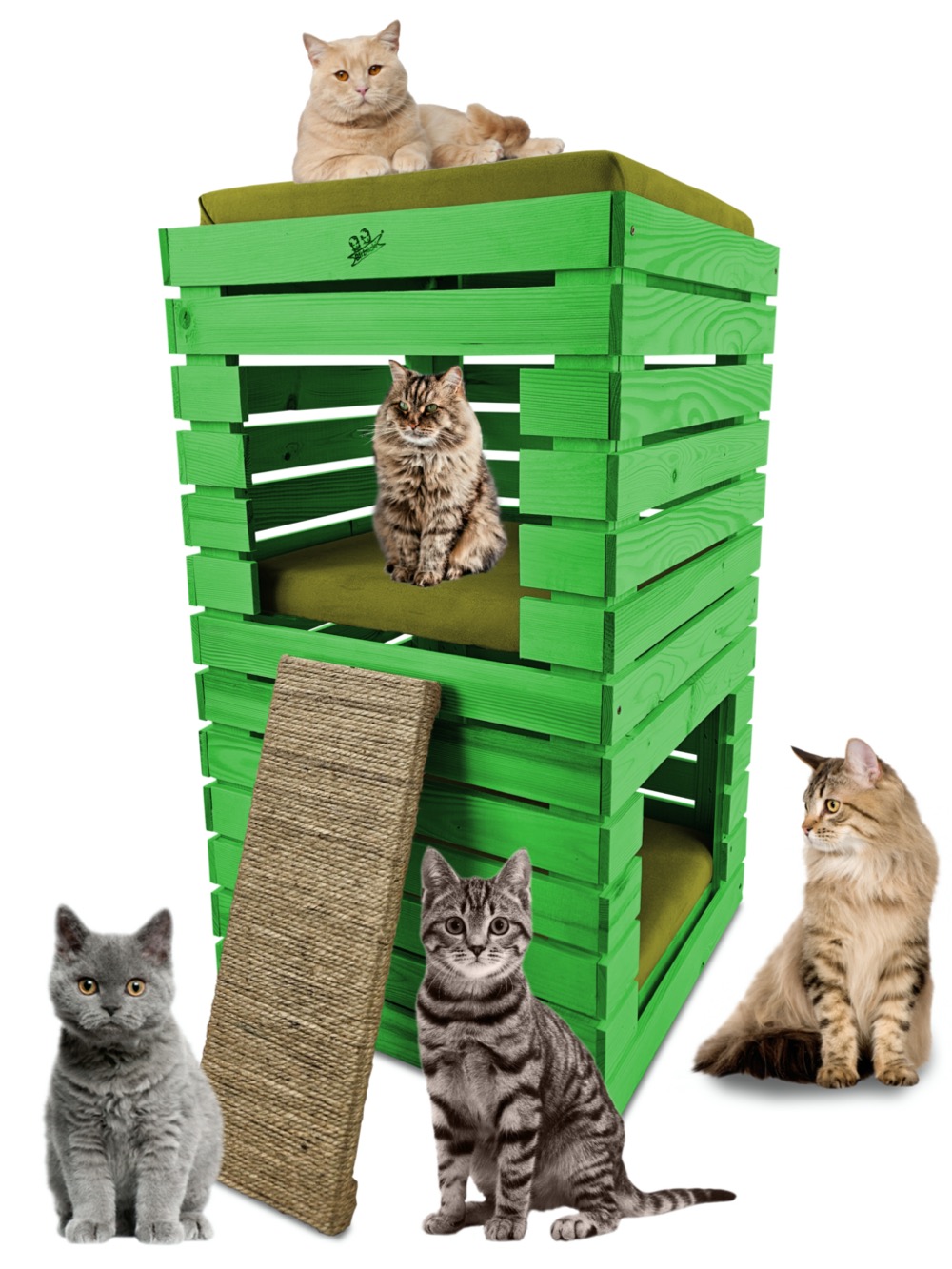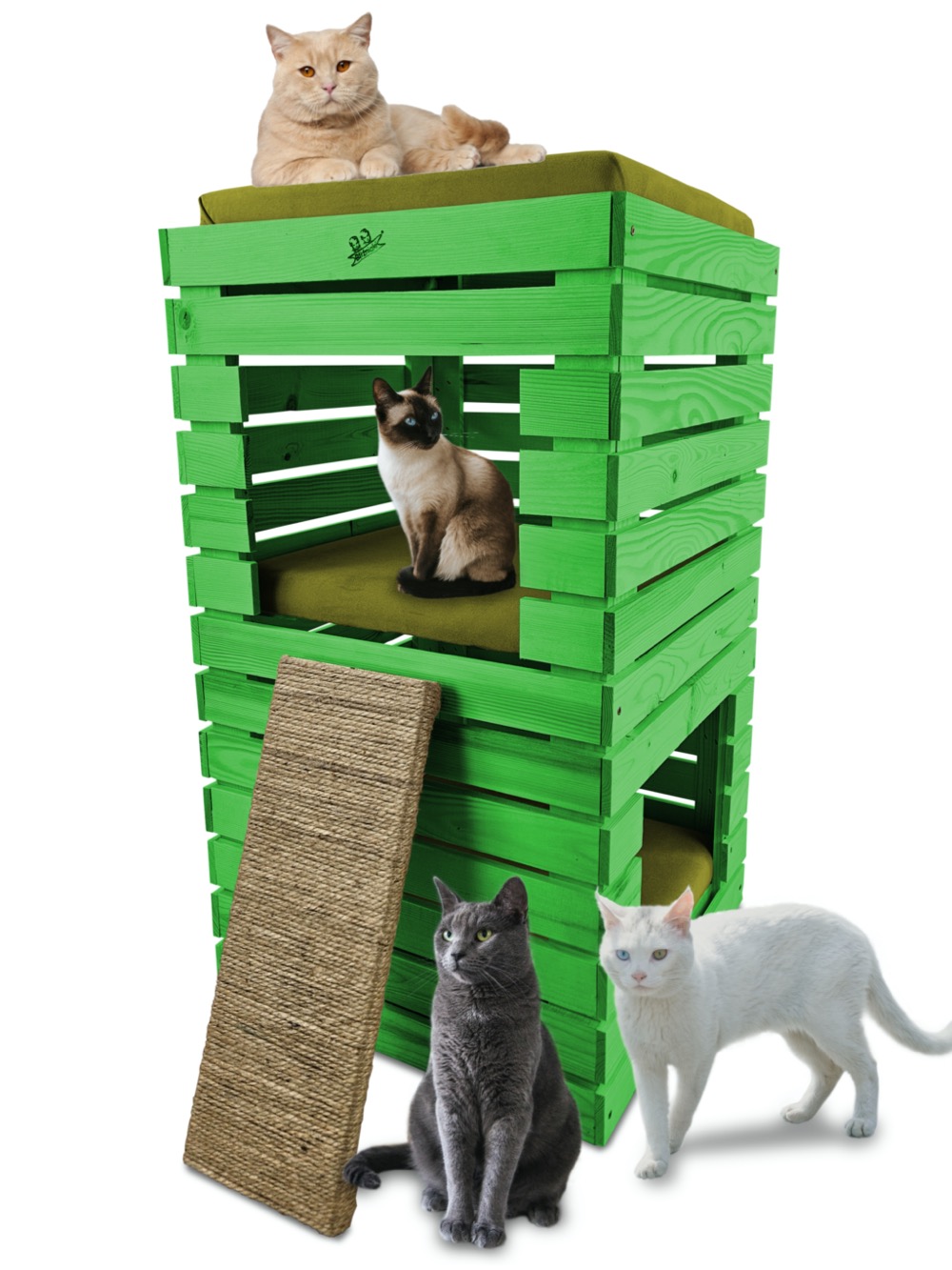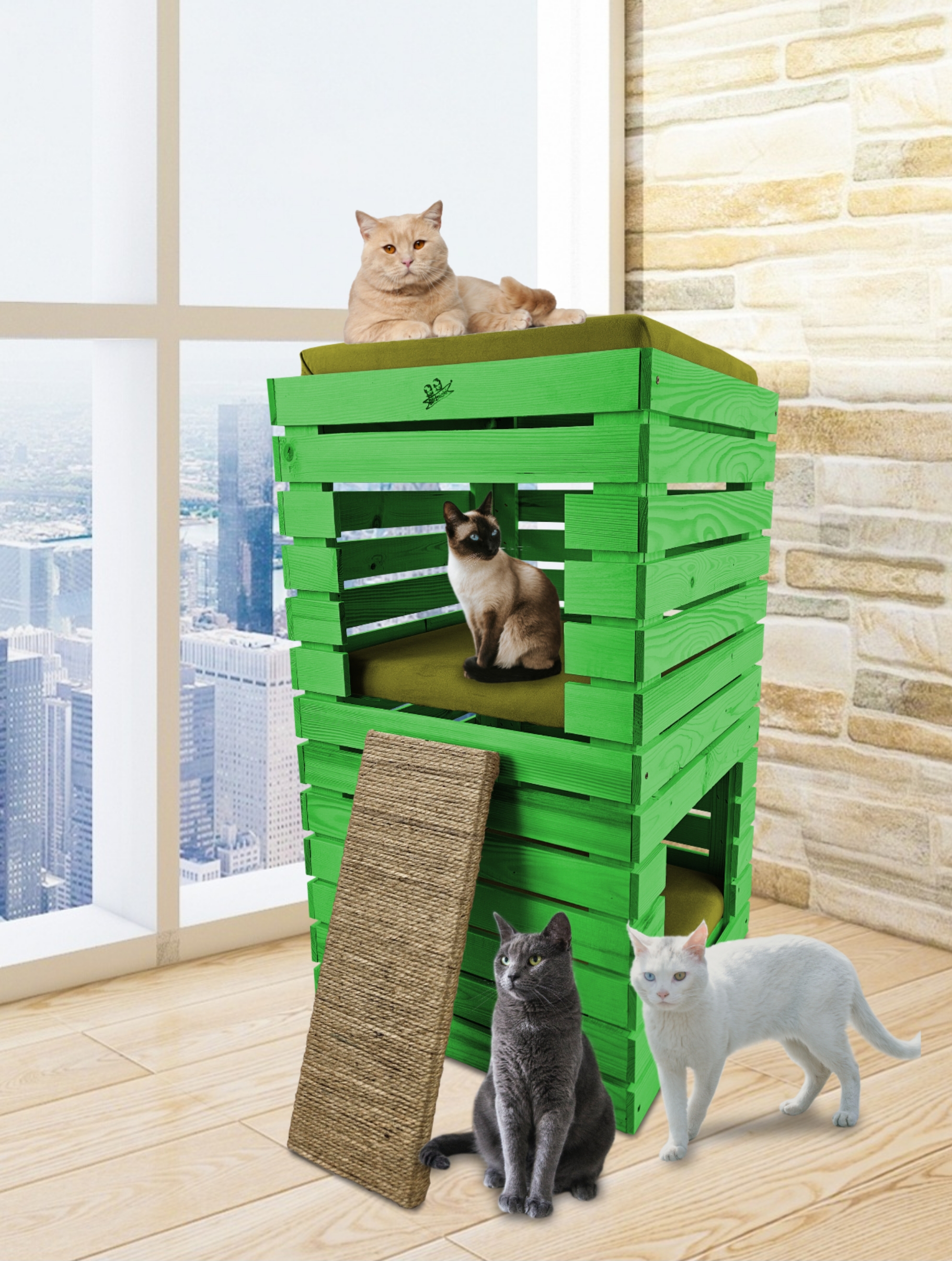 Trzy niezależne legowiska to rozwiązanie, które gwarantuje każdemu kotu prywatność i wygodę. Konstrukcja domku pozwala na przebywanie w nim kilku kotów na trzech poziomach.