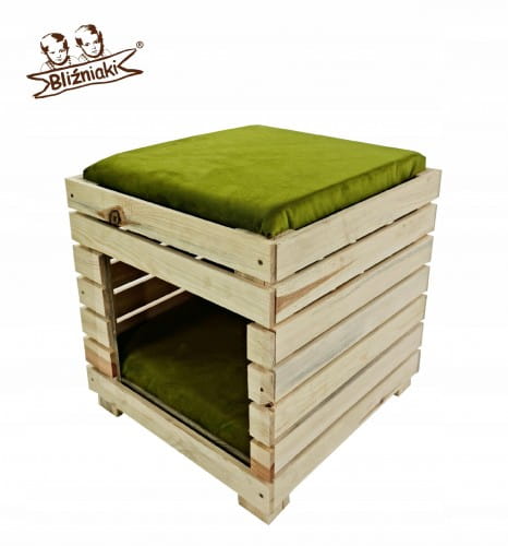 - Budka w kolorze NATURALNEGO DREWNA, posłanie w kolorze OLIWKOWYM