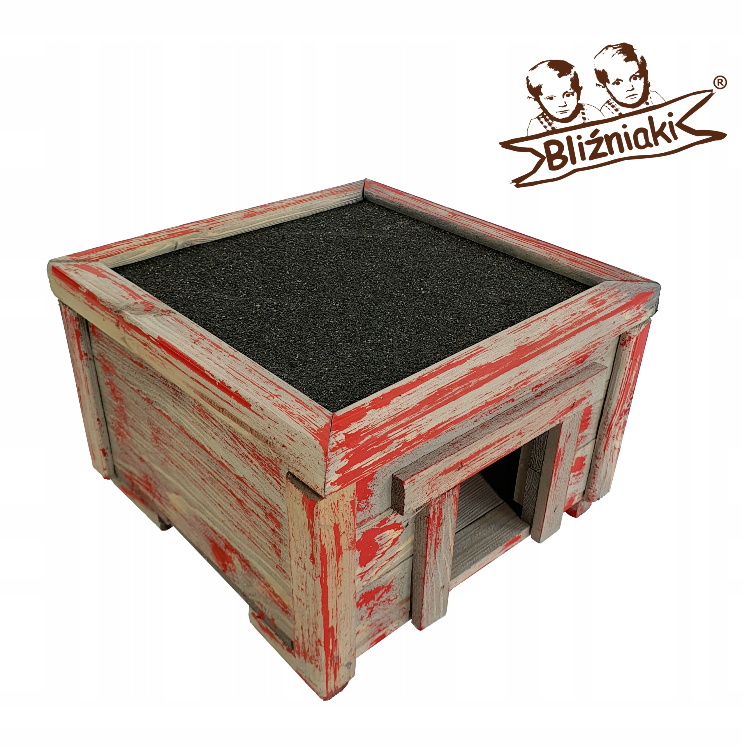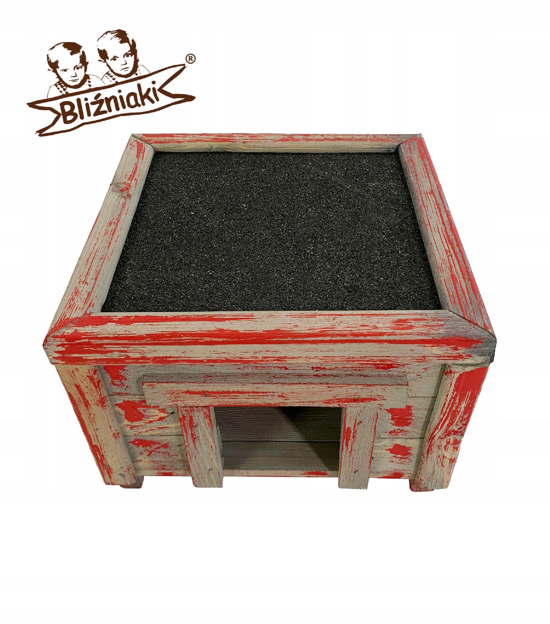 Nasz produkt w odcieniu SZARYM poddany patynowaniu kolorem CZERWONYM został zaprojektowany w taki sposób, aby sprostać każdym warunkom atmosferycznym przez cały rok. Wykonany w całości z impregnowanego ekologicznie drewna zabezpieczony dachem z papy bitumicznej uzyskał trwałość i odporność na szkodliwe działanie wody oraz wilgoci, promieni UV, a także grzybów i pleśni, może być więc przechowywany przez cały rok na zewnątrz. Drewniana podłoga oraz nóżki izolują domek od wilgotnego i zimnego podłoża.