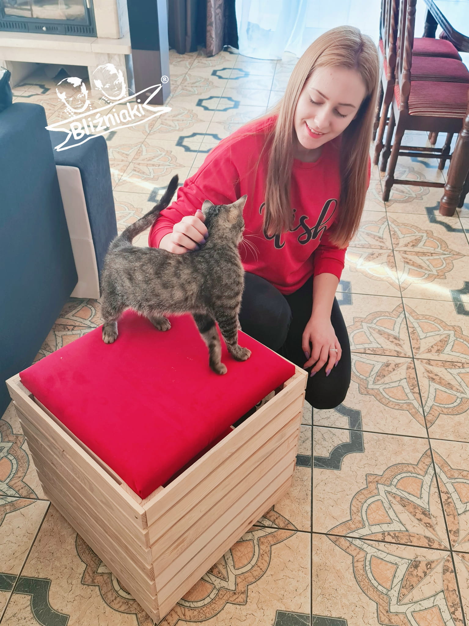 Budka, wykonana w całości z drewna, zachwyca swoją estetyką i naturalnością. Kolor NATURALNEGO DREWNA harmonijnie współgra z CZERWONYM posłaniem, tworząc kompozycję, która pasuje zarówno do wnętrza mieszkania, jak i ogrodu.