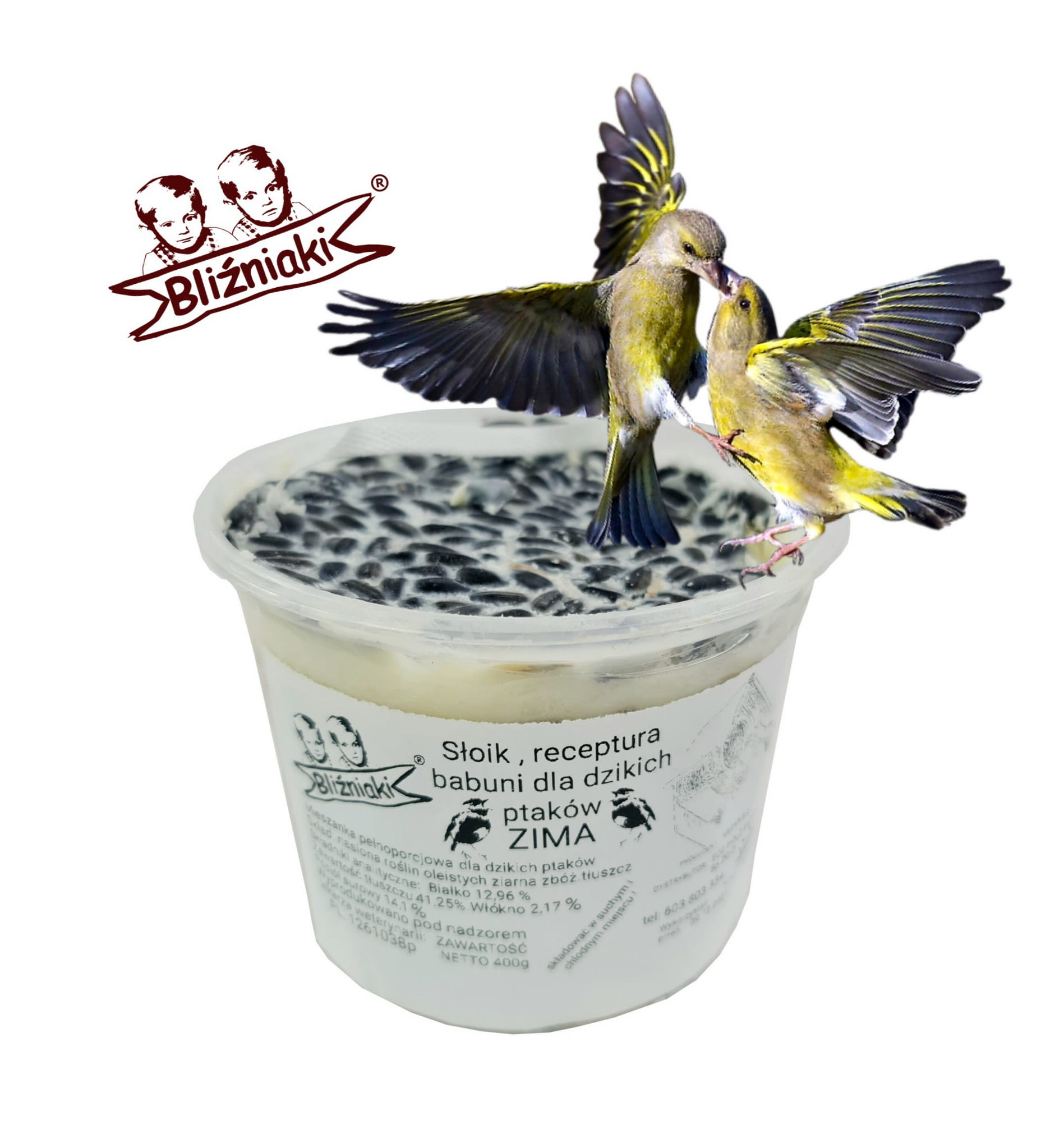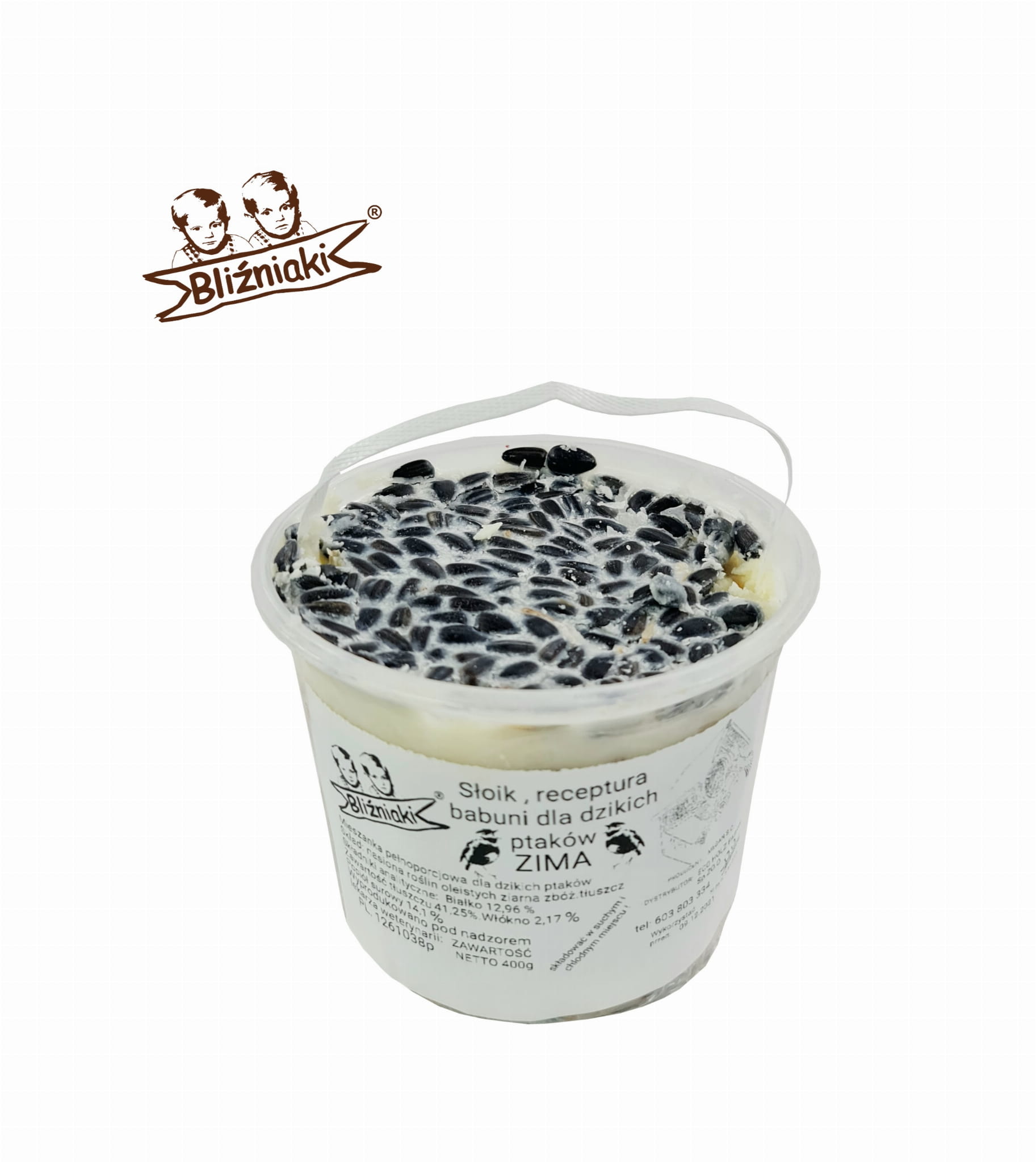 Nasz SŁOIK BABUNI w zestawie z karmnikiem przeznaczony jest dla wszystkich dzikich ptaków zimujących w Polsce. Jest to wysokoenergetyczny pokarm w postaci tłuszczowej mieszanki z ziarnami będący doskonałym uzupełnieniem dla karm sypkich. W jego składzie znajdują się ziarna zbóż, nasiona roślin oleistych i tłuszcz. Produkt został stworzony wyłącznie z surowców naturalnych. Mieszanka jest nie tylko smakołykiem, ale dzięki dużej zawartości minerałów, witamin, białka i tłuszczu jest wysokoenergetyczną karmą pozwalającą przetrwać ptakom okres zimowy.