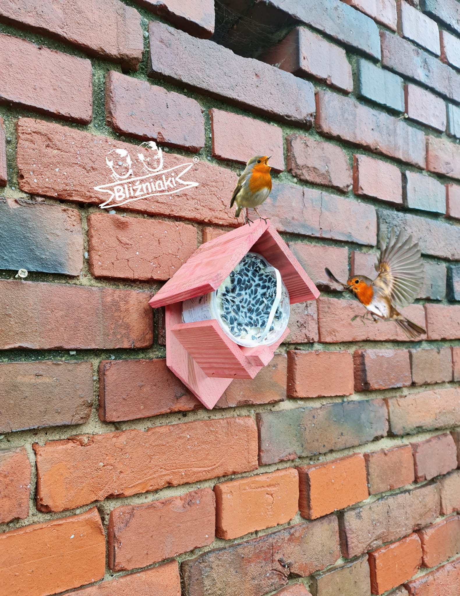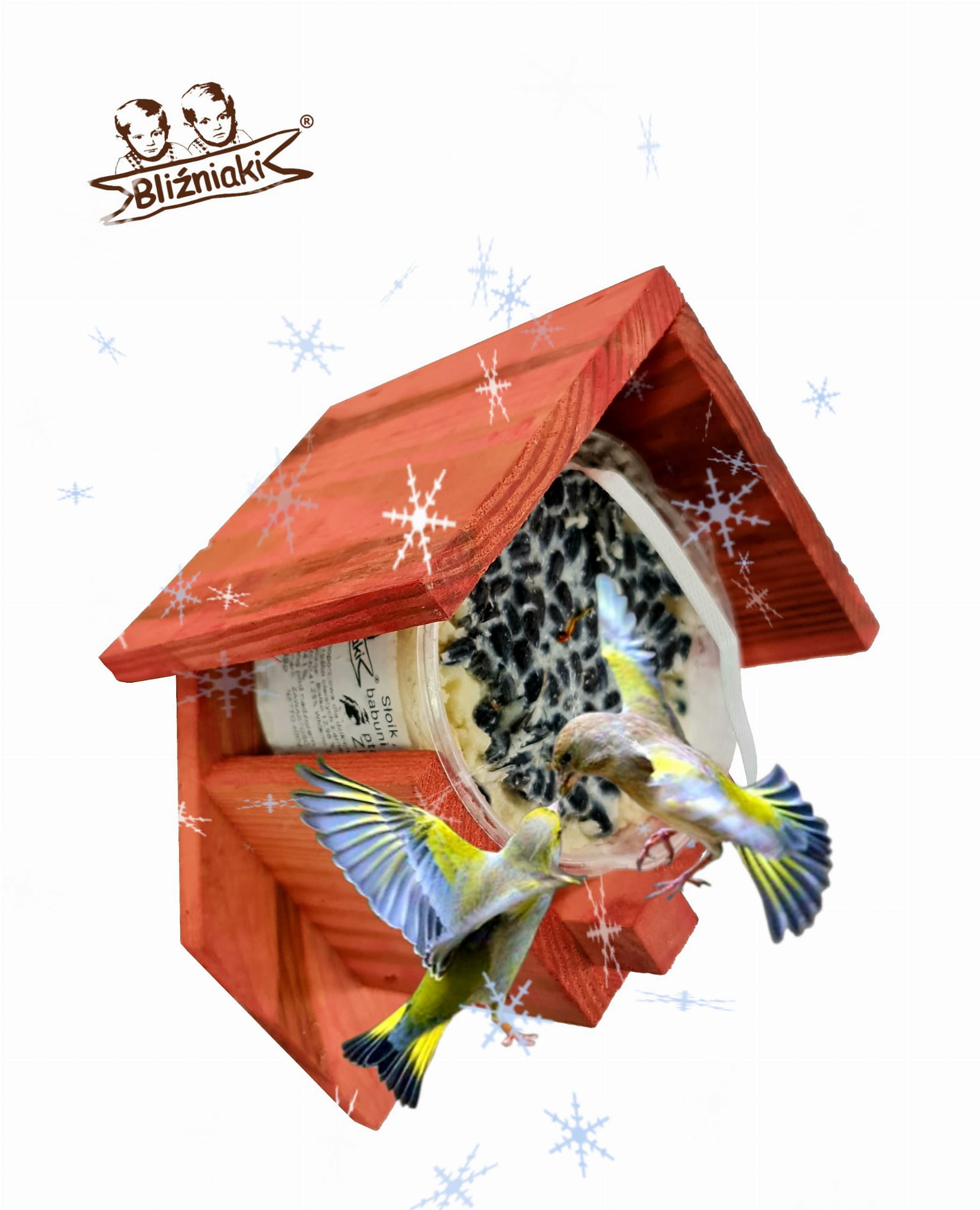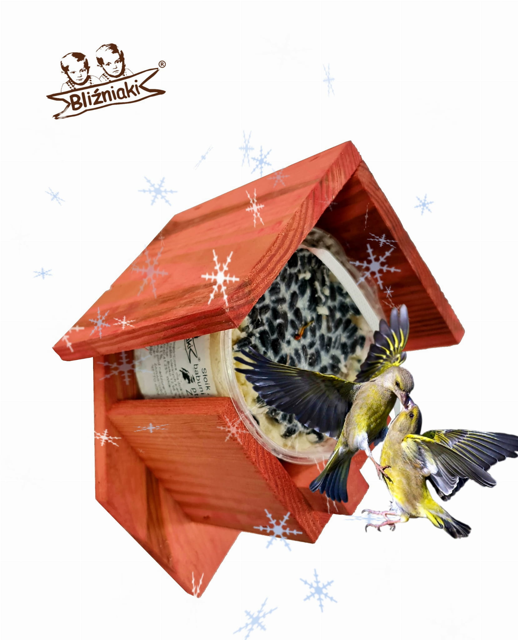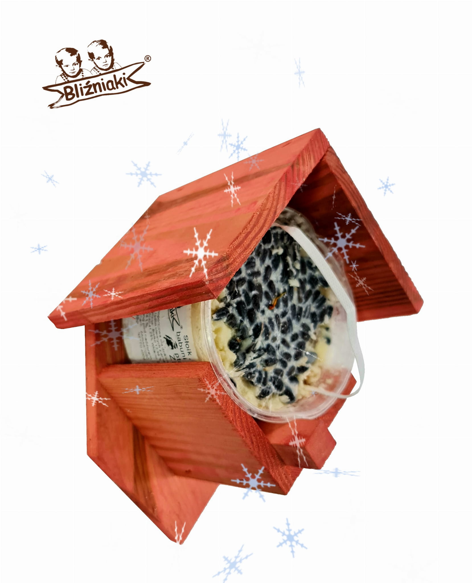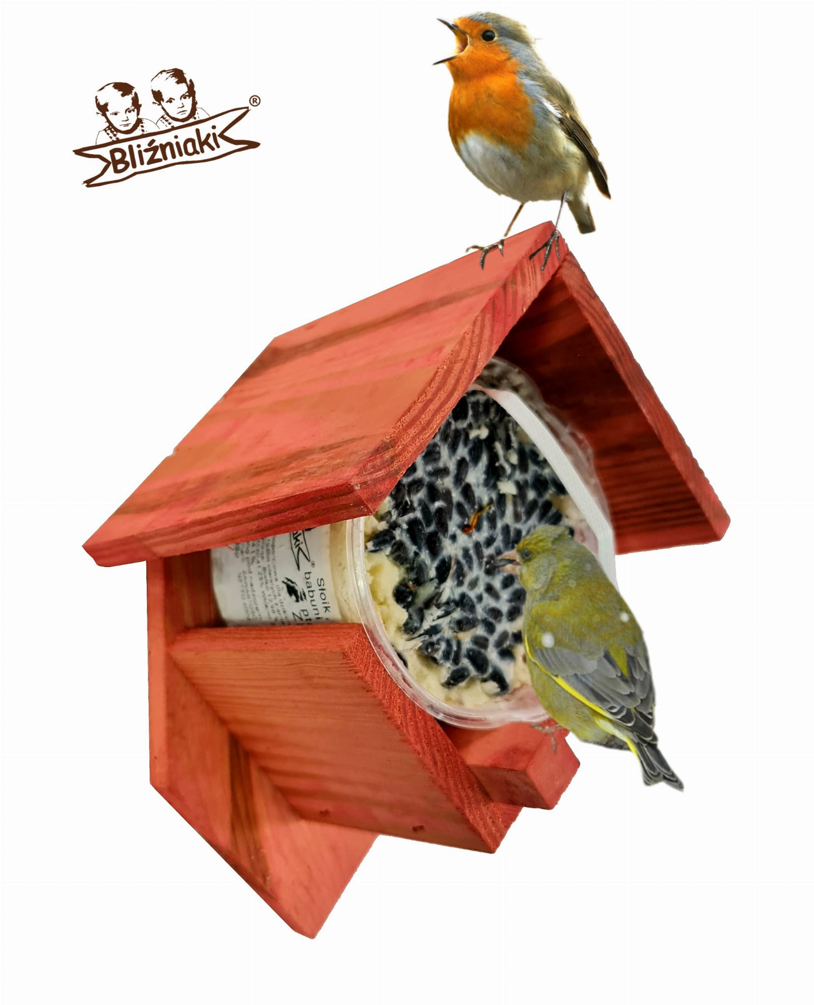 Budka Karmnik Dla Ptaków z Karmą Tłuszczową Gratis Domek Drewniany z Mieszanką dla Ptaków Wiszące Karmidło na Każdą Porę Roku (K105SB RÓ)