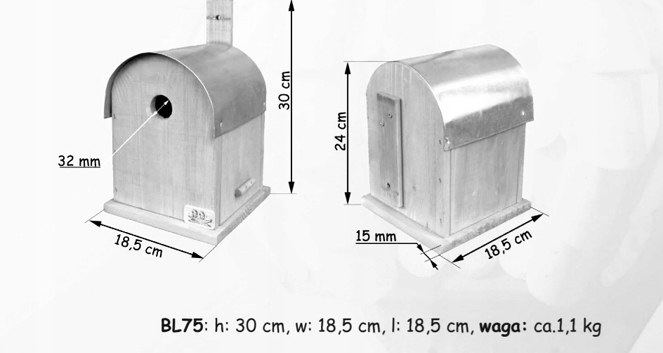 Oferowana budka przeznaczona jest - ze względu na średnicę otworu - dla dwóch gatunków ptaków: sikorki, wróble (średnica otworu 3,2cm) a także inne ptaszki.