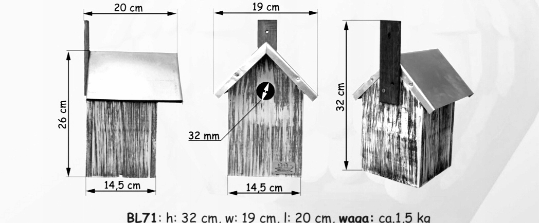 Oferowana budka przeznaczona jest - ze względu na średnicę otworu - dla dwóch gatunków ptaków: sikorki, wróble (średnica otworu 3,2cm) a także inne ptaszki.