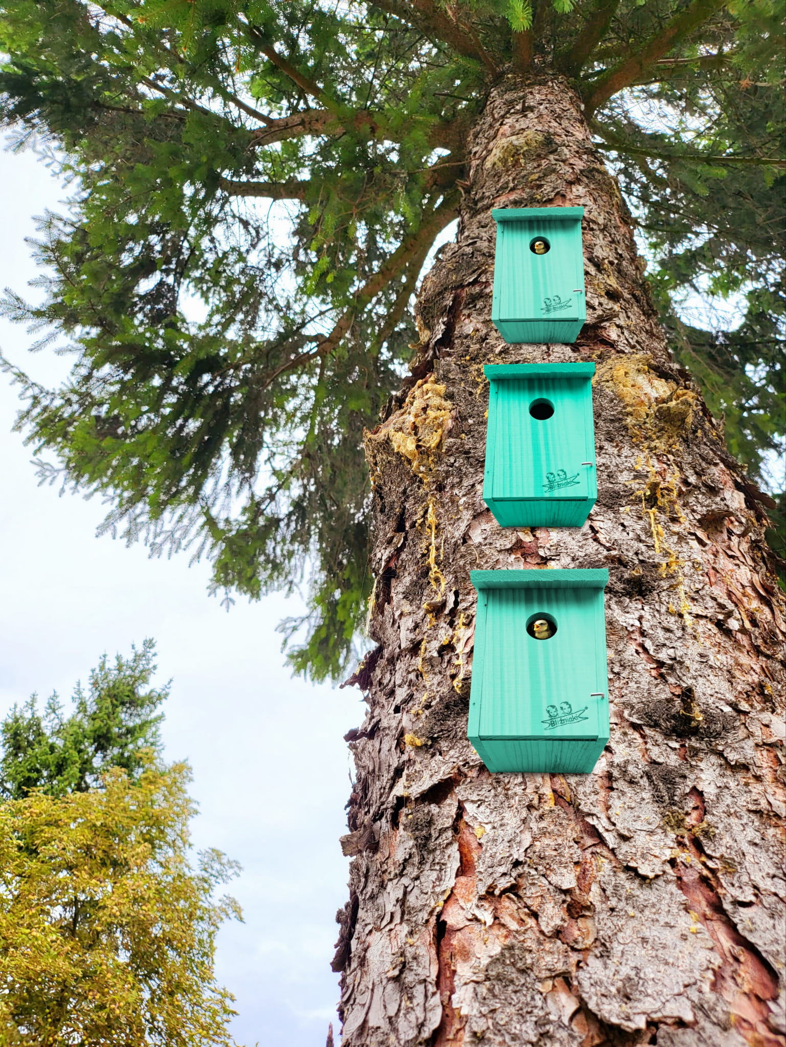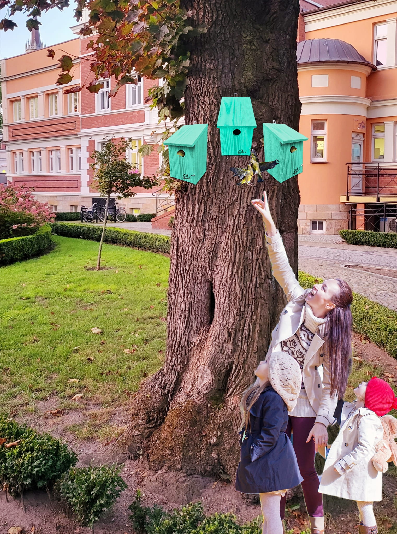 Budki lęgowe, które imitują dziuplę w drzewie warto umieścić w miejscu zacienionym, spokojnym, w odległości ok. 2 m od siebie.
