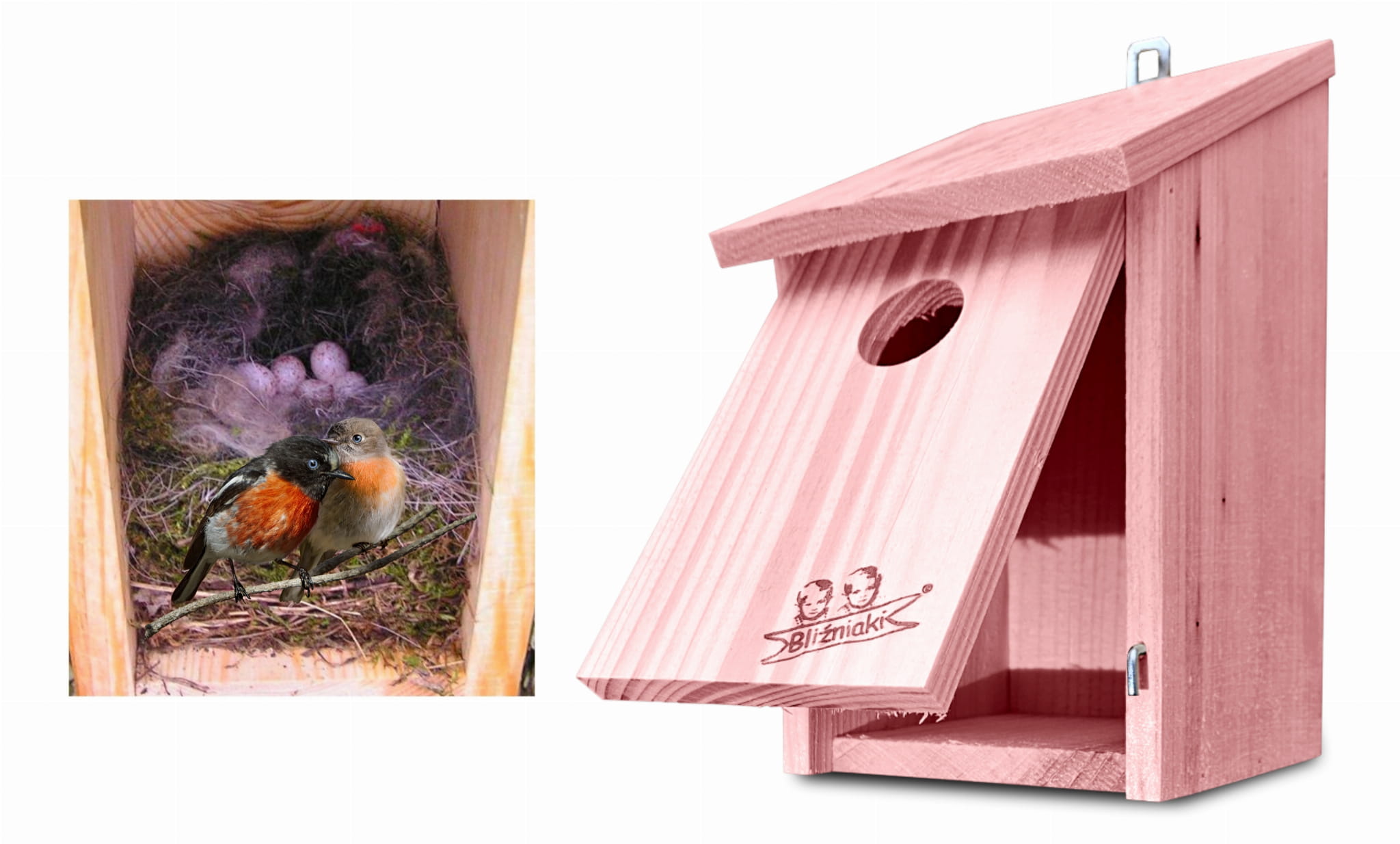 Produkt wykonany został z suszonego drewna sosnowego. Budka w kolorze PASTELOWYM RÓŻOWYM jest zabezpieczona metodą impregnowania. Środek na bazie wody użyty do impregnacji jest w pełni ekologiczny i bezpieczny dla ludzi i zwierząt. Zabezpieczone w taki sposób drewno sprawia, że budka lęgowa jest odporna na szkodliwe działanie wody oraz wilgoci, promieni UV, a także grzybów i pleśni, może być więc przechowywana przez cały rok na zewnątrz.