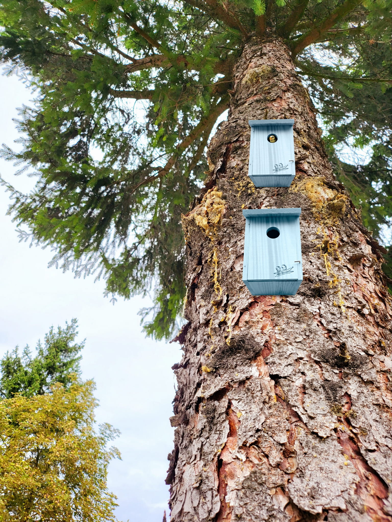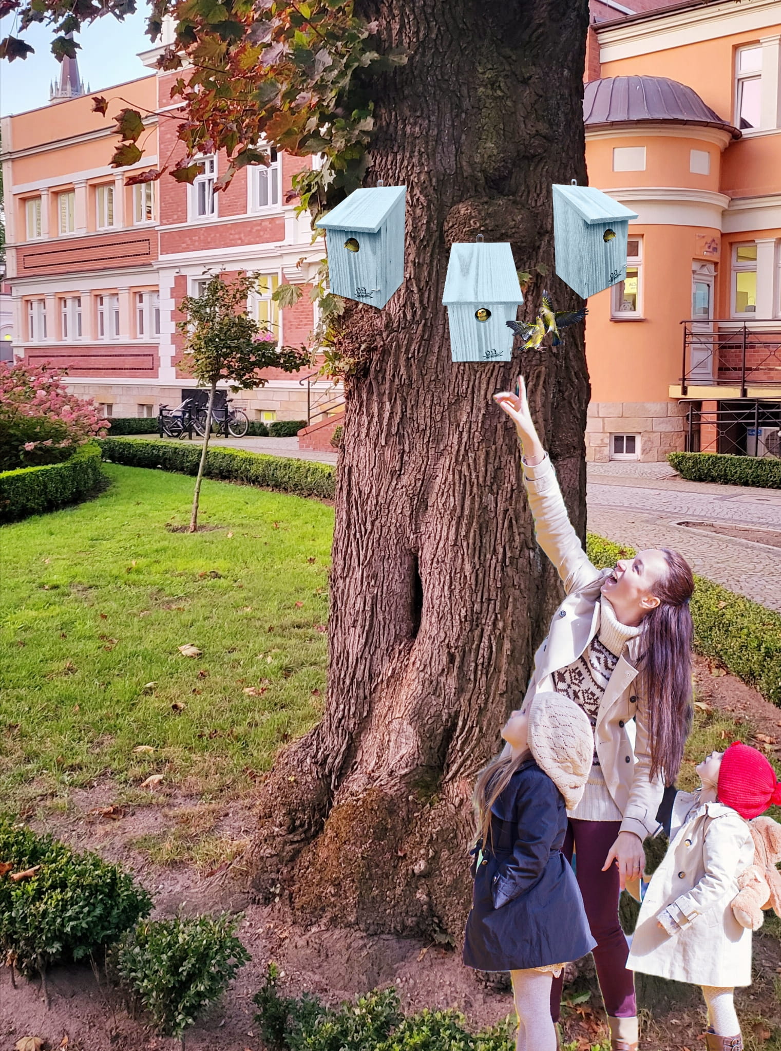 Budki lęgowe, które imitują dziuplę w drzewie warto umieścić w miejscu zacienionym, spokojnym, w odległości ok. 2 m od siebie.