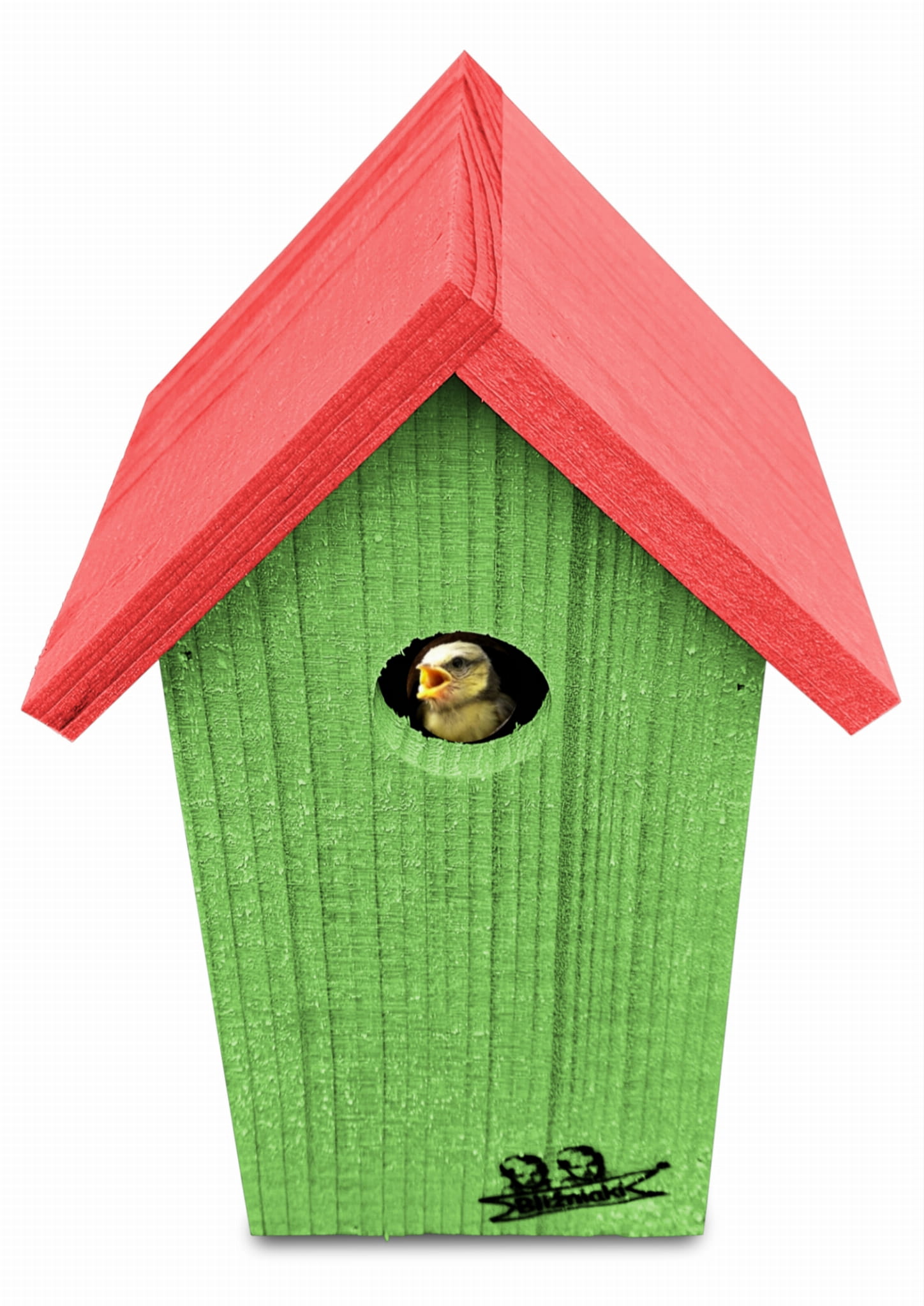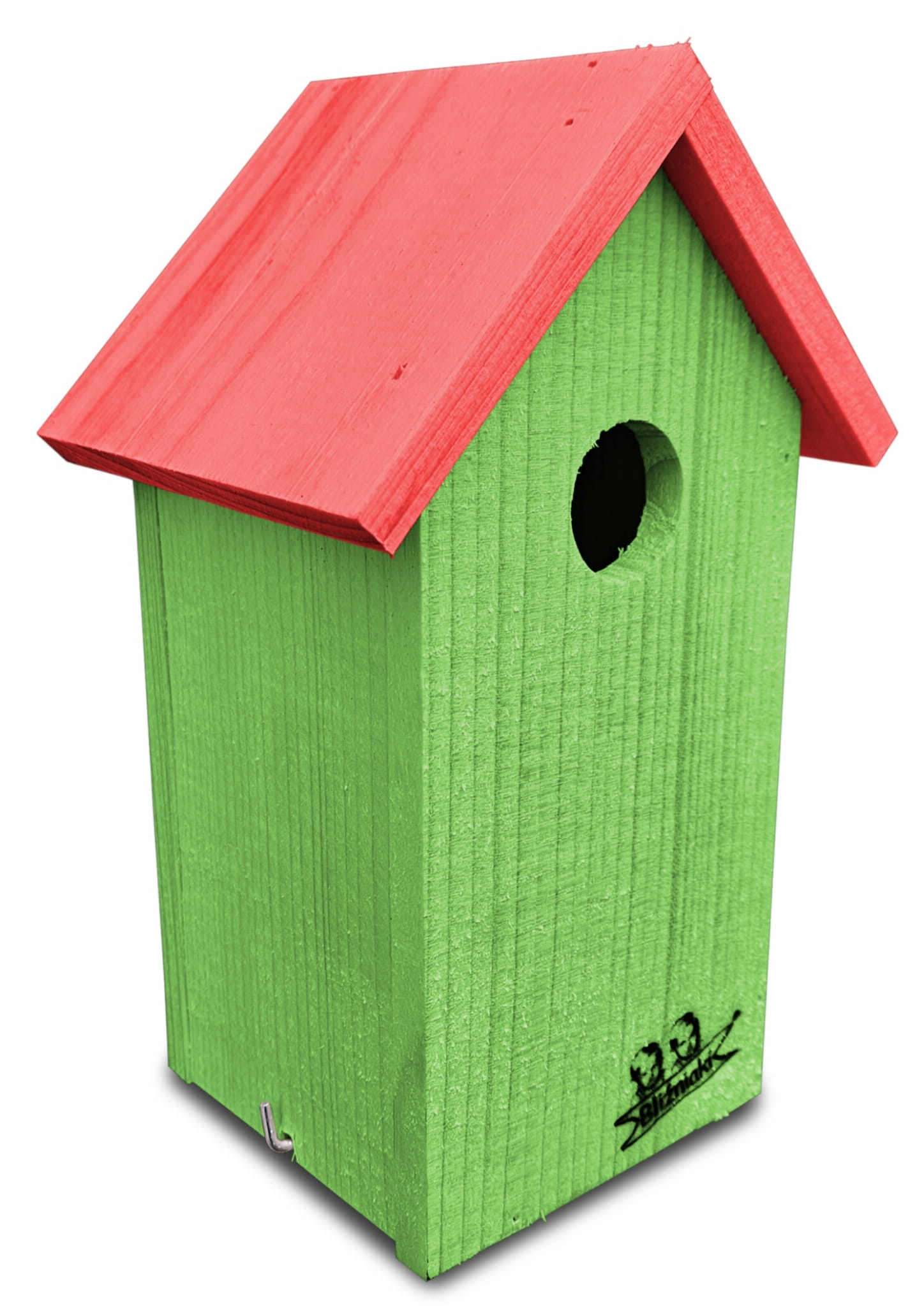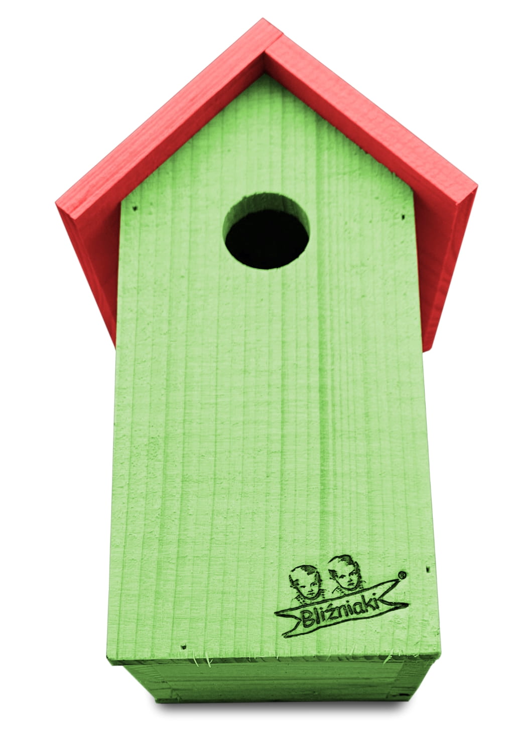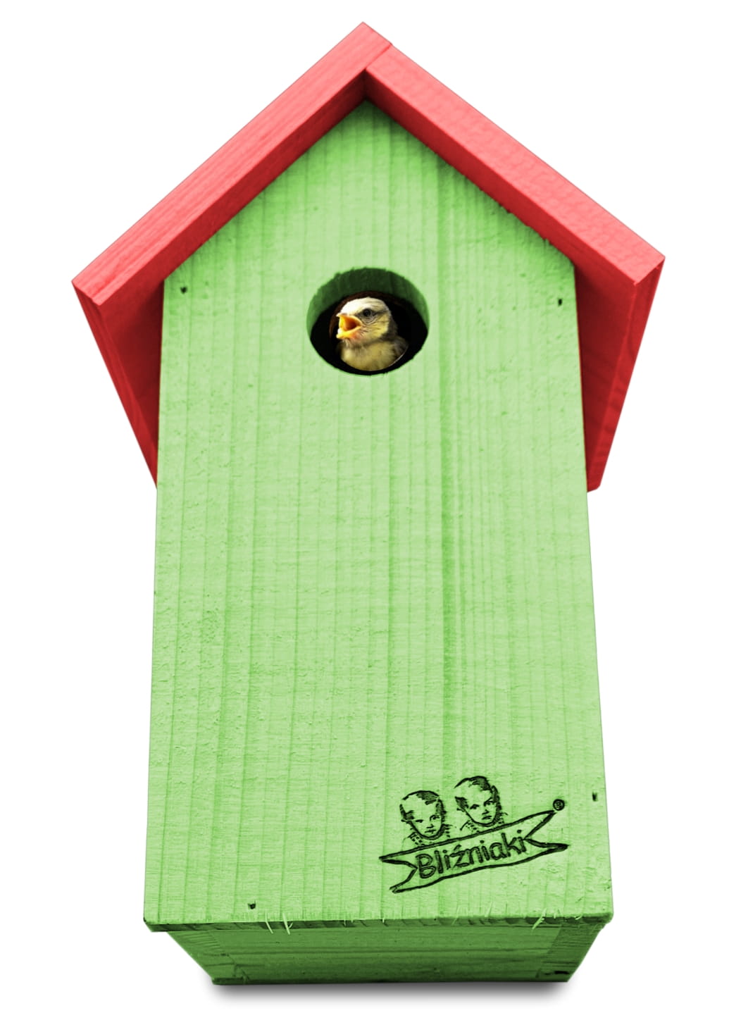 W przeważającej części skrzynka lęgowa jest w kolorze JASNYM ZIELONYM, dach pokryty został kolorem CZERWONYM.
