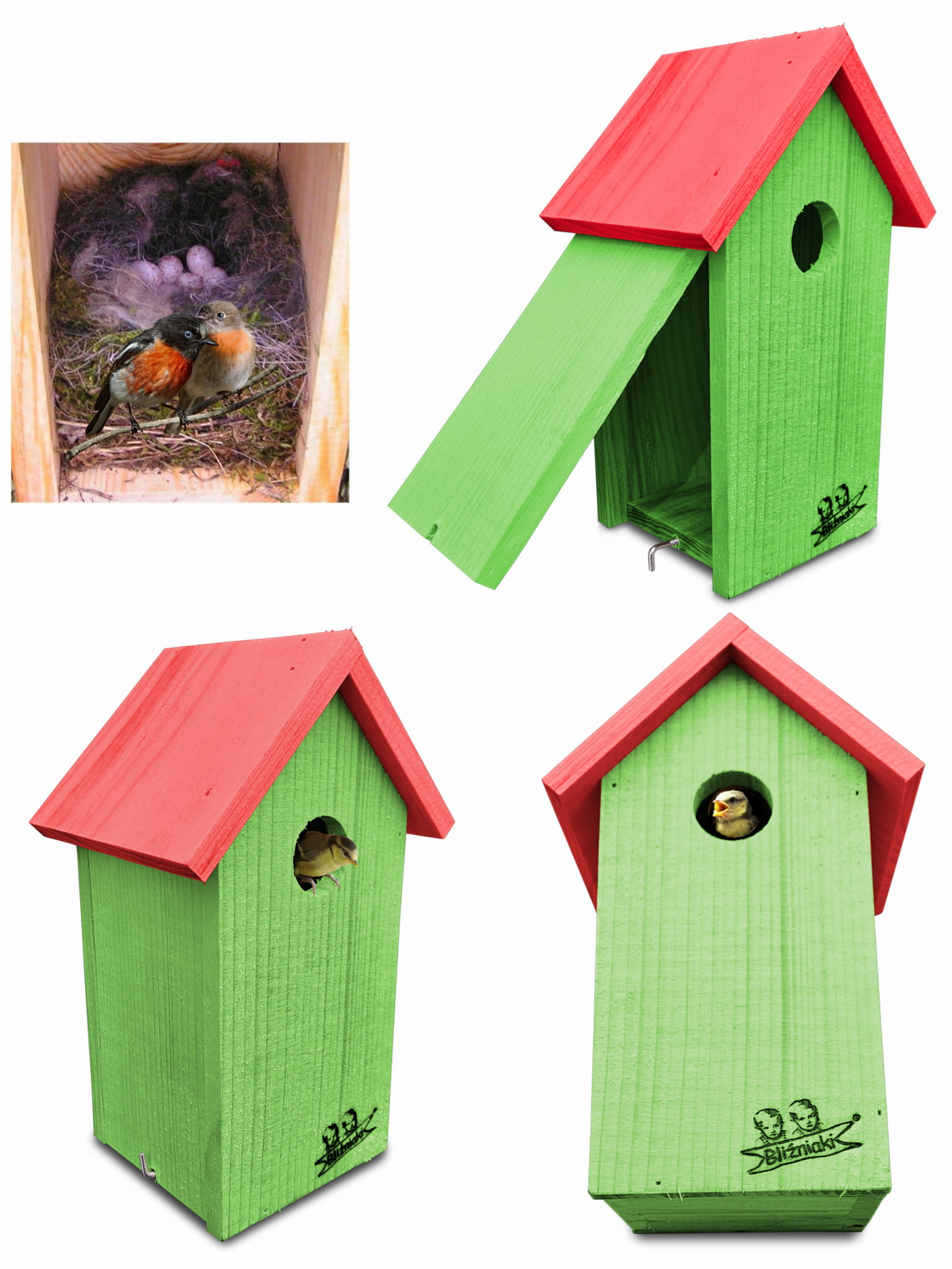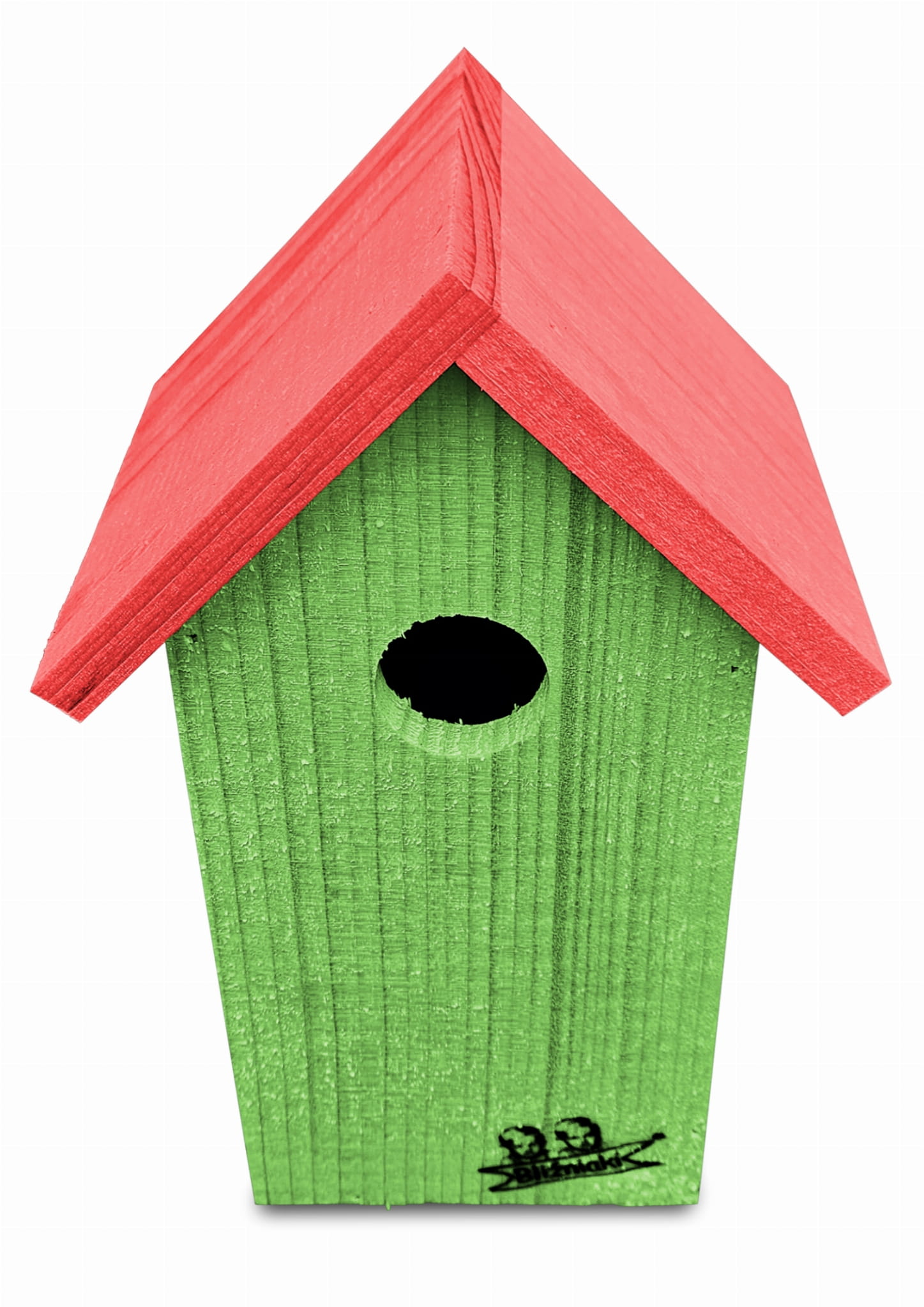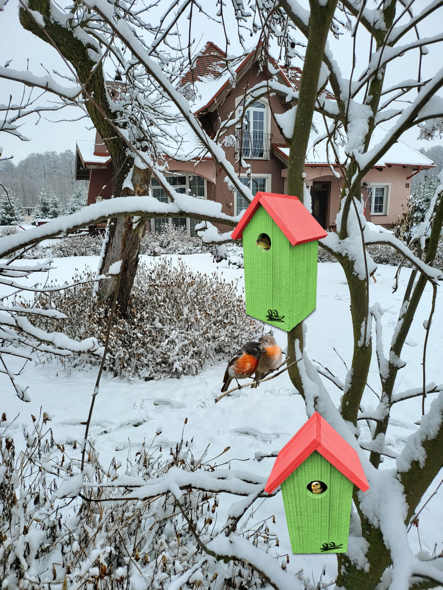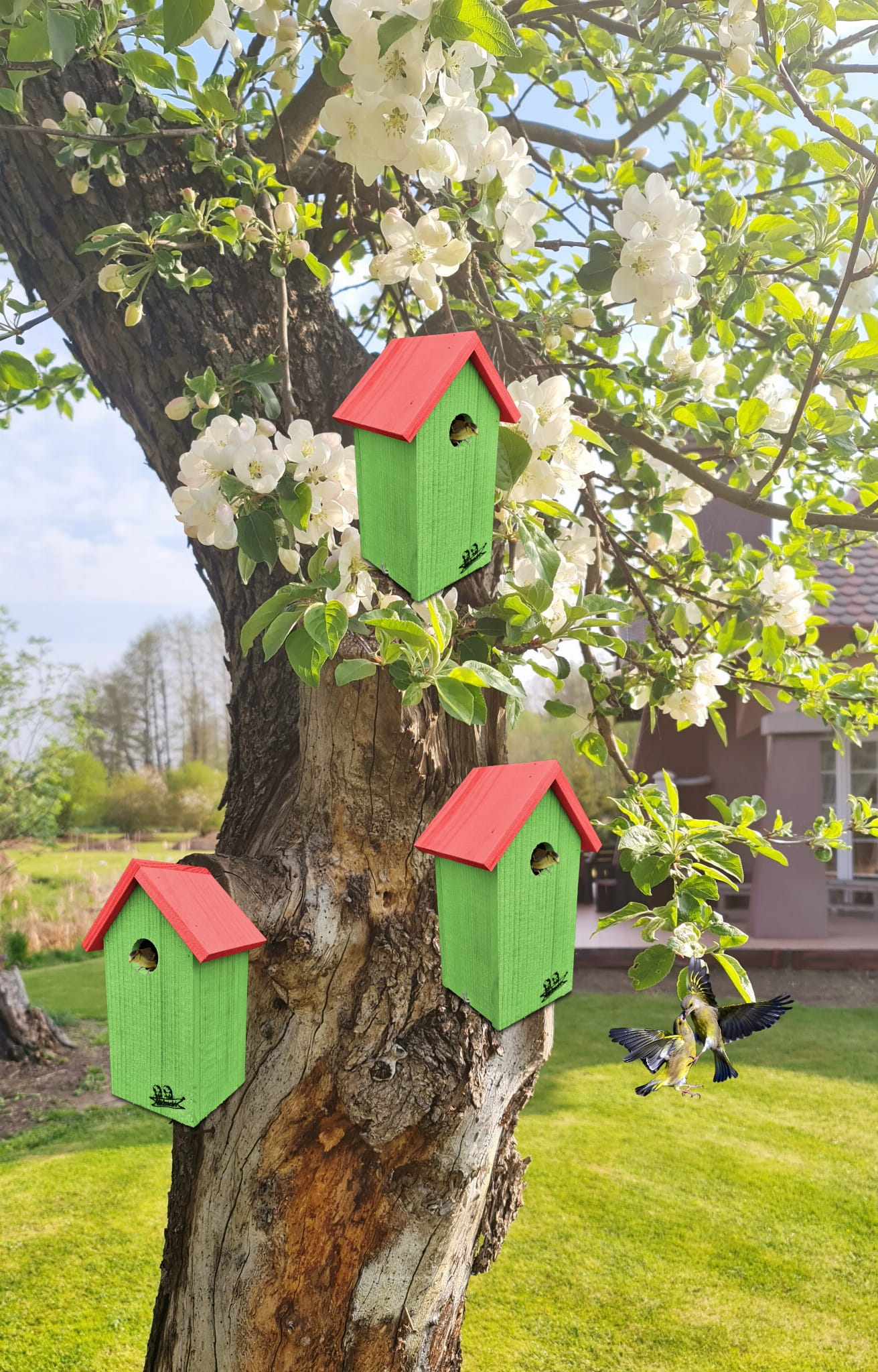 W przeważającej części skrzynka lęgowa jest w kolorze JASNYM ZIELONYM, dach pokryty został kolorem CZERWONYM.